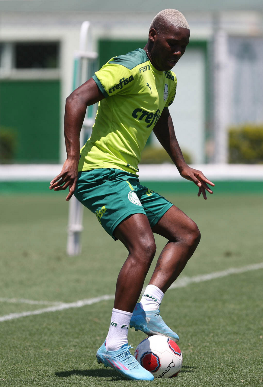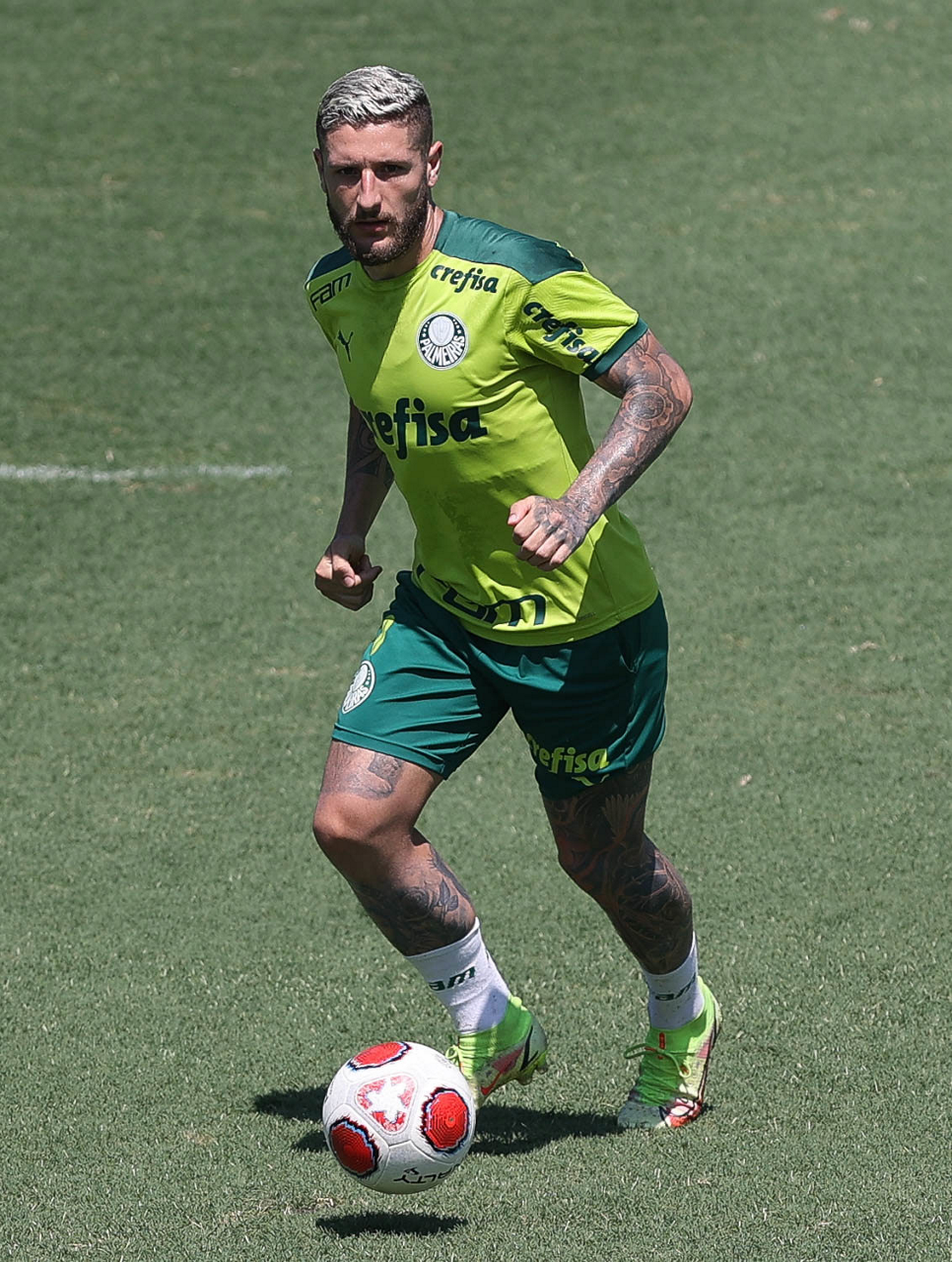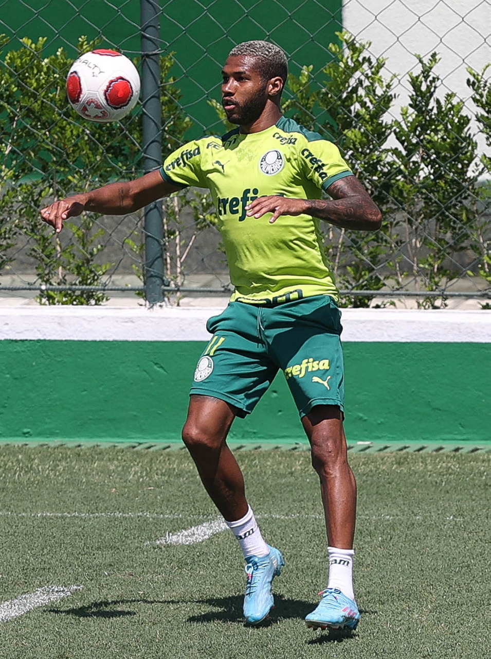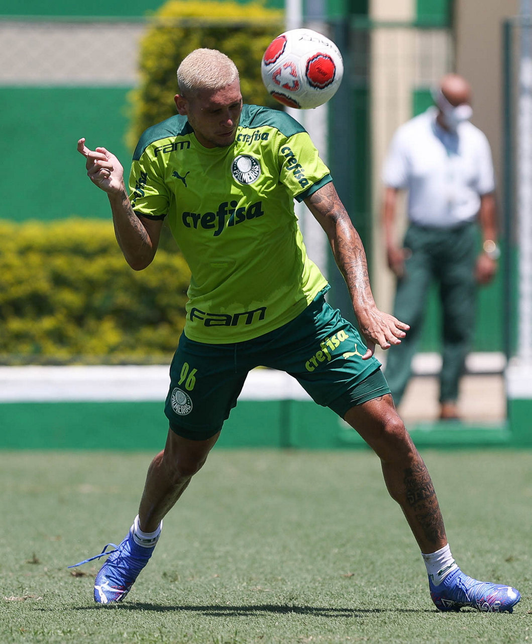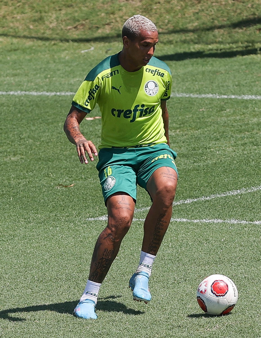 Os jogadores Luan, Renan, Deyverson, Gustavo Gómez, Rony e Dudu (E/D em pé) e Marcos Rocha, Zé Rafael, Wesley, Eduard Atuesta, Danilo, Breno Lopes e Jorge (E/D agachados), da SE Palmeiras, durante treinamento, na Academia de Futebol. (Foto: Cesar Greco)