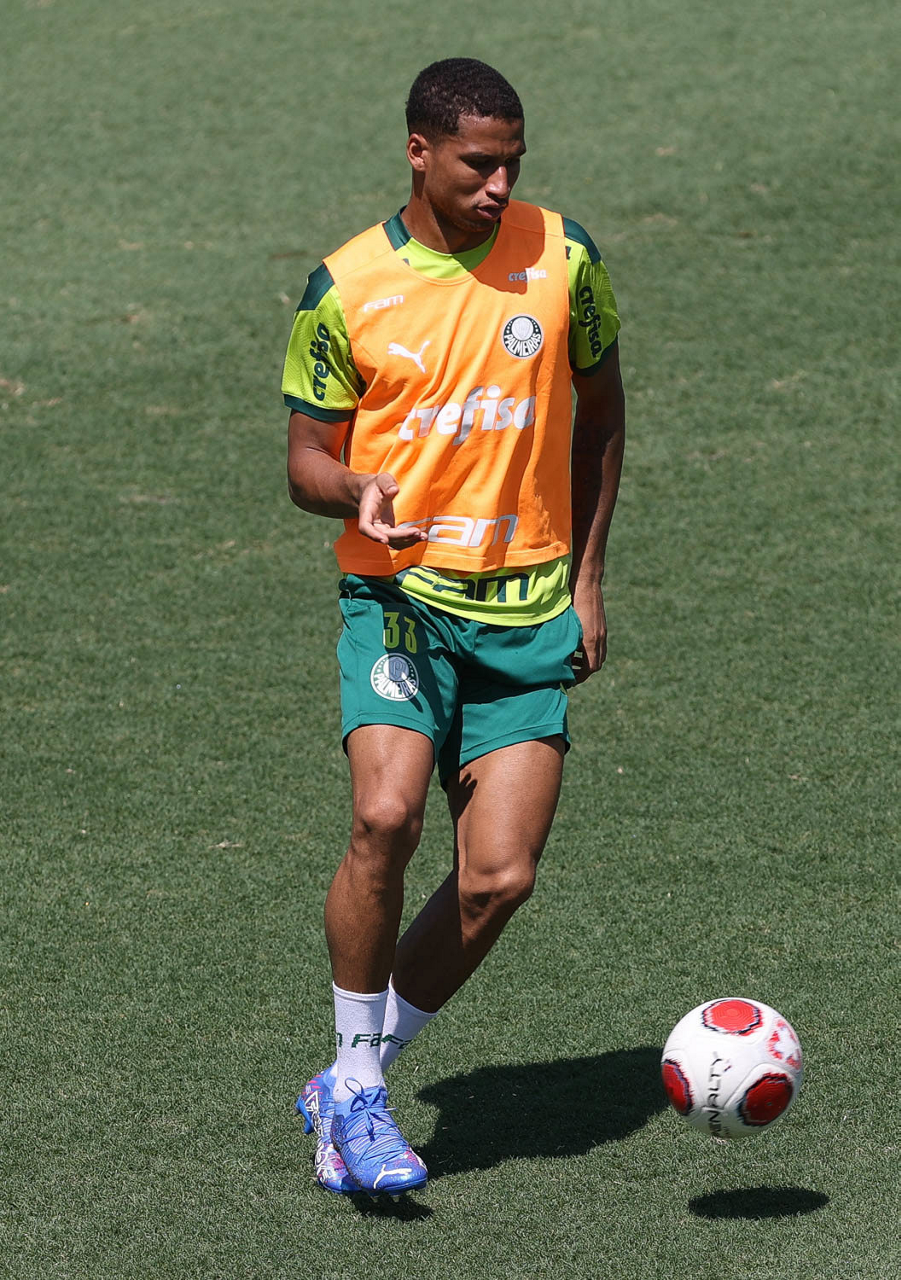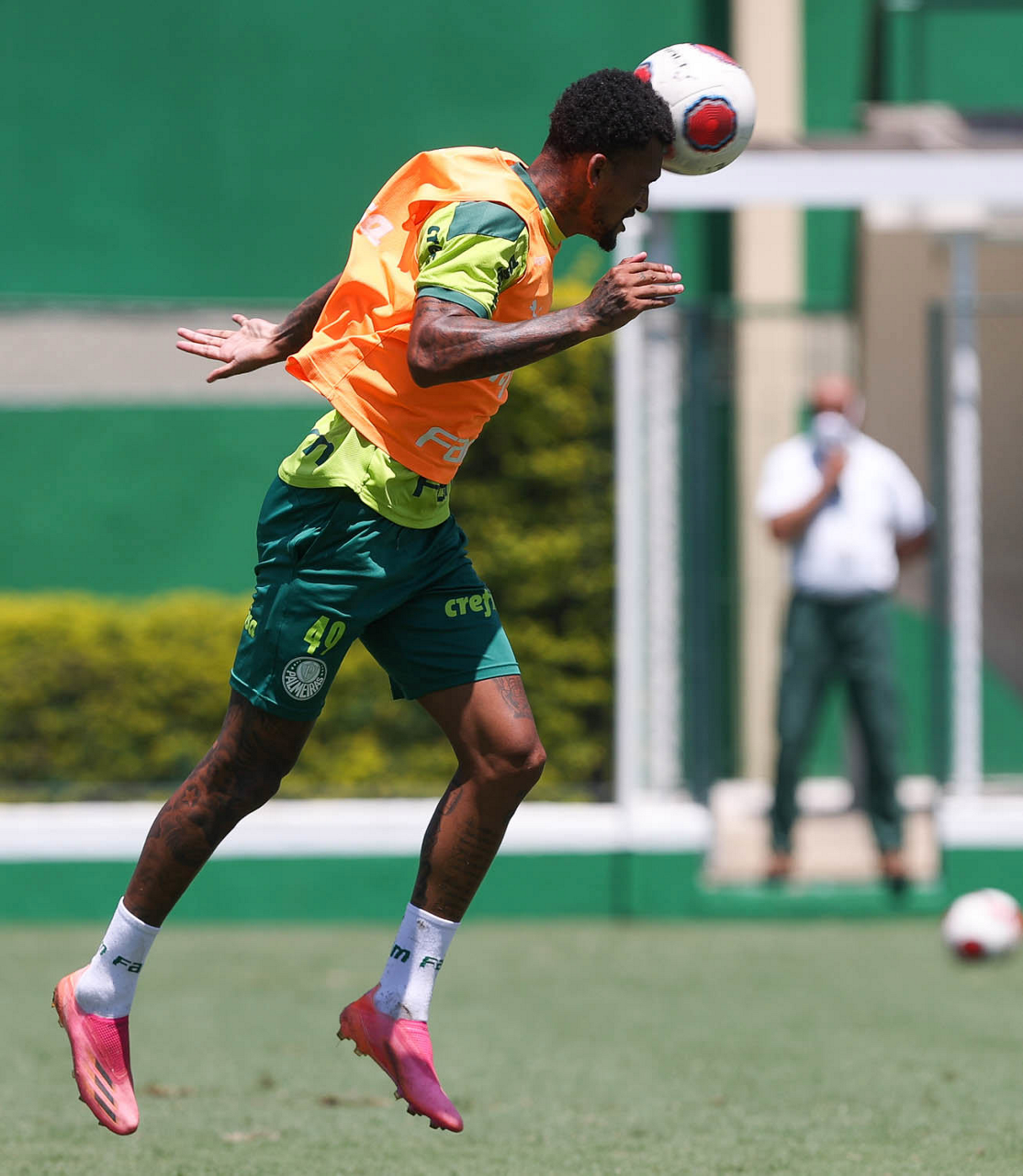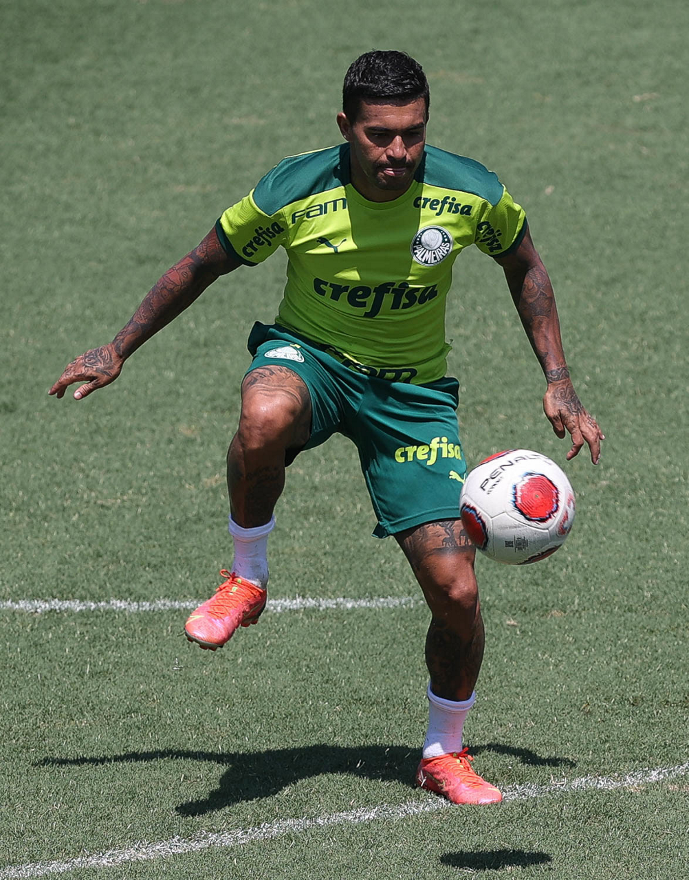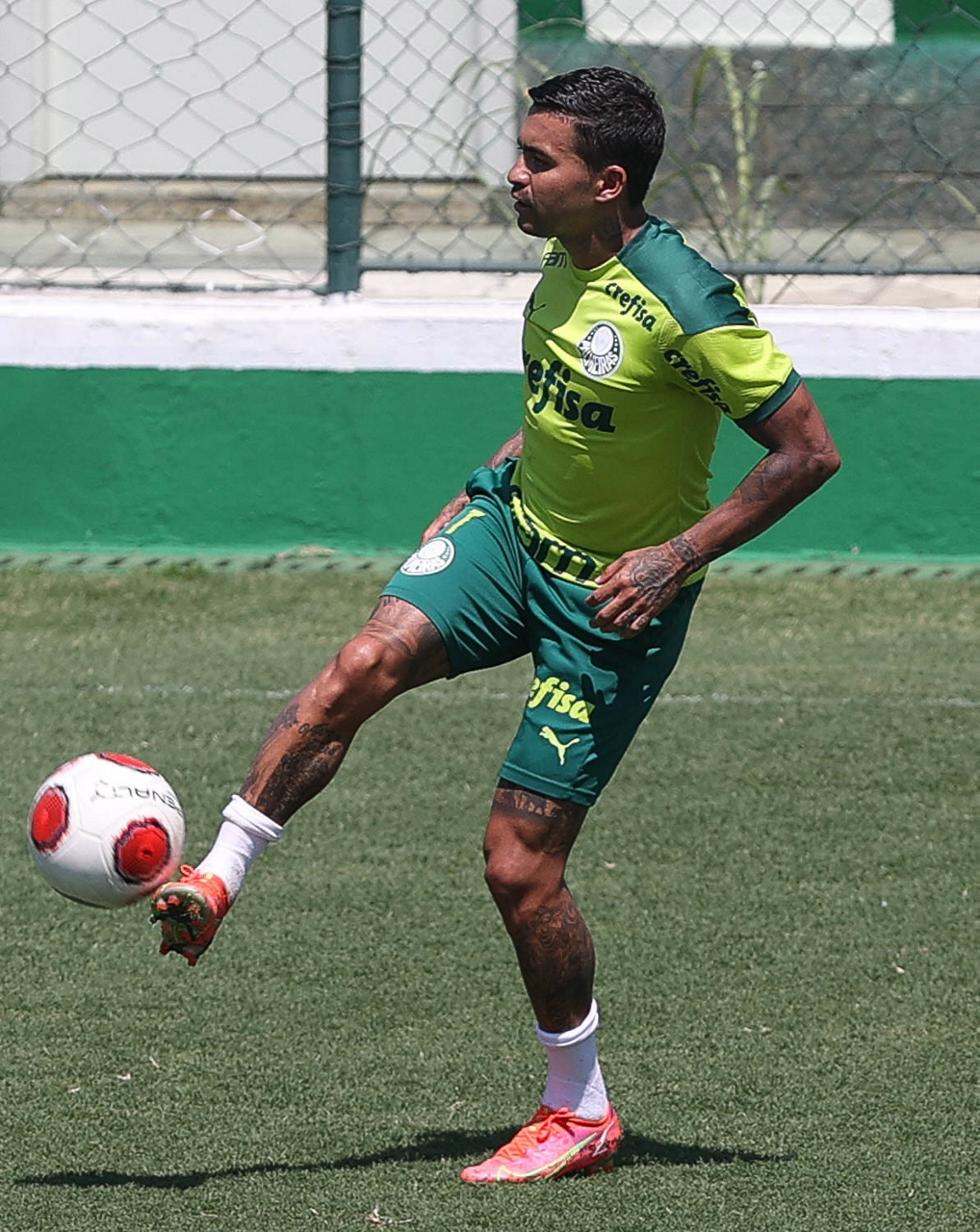 Os jogadores Luan, Renan, Deyverson, Gustavo Gómez, Rony e Dudu (E/D em pé) e Marcos Rocha, Zé Rafael, Wesley, Eduard Atuesta, Danilo, Breno Lopes e Jorge (E/D agachados), da SE Palmeiras, durante treinamento, na Academia de Futebol. (Foto: Cesar Greco)