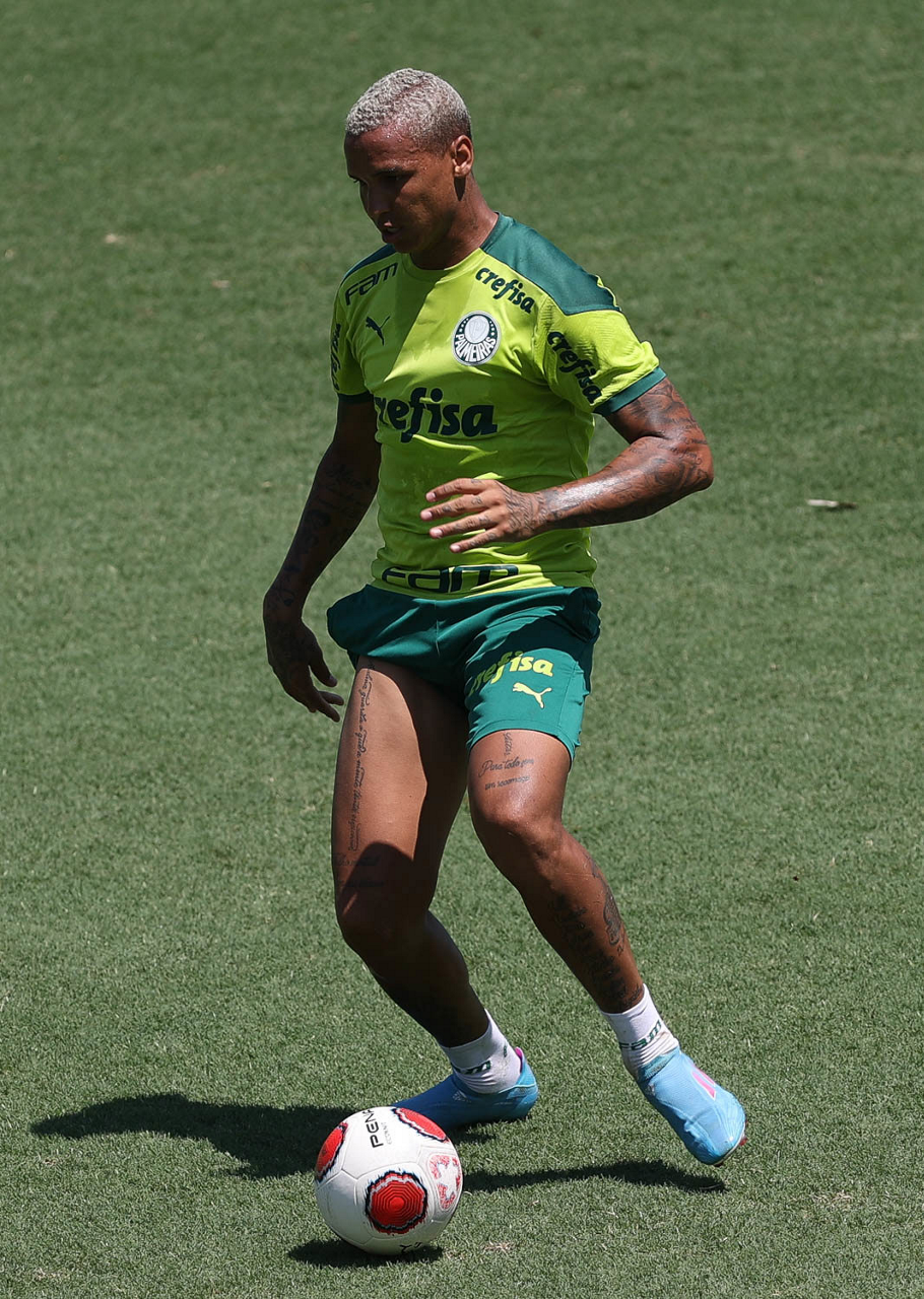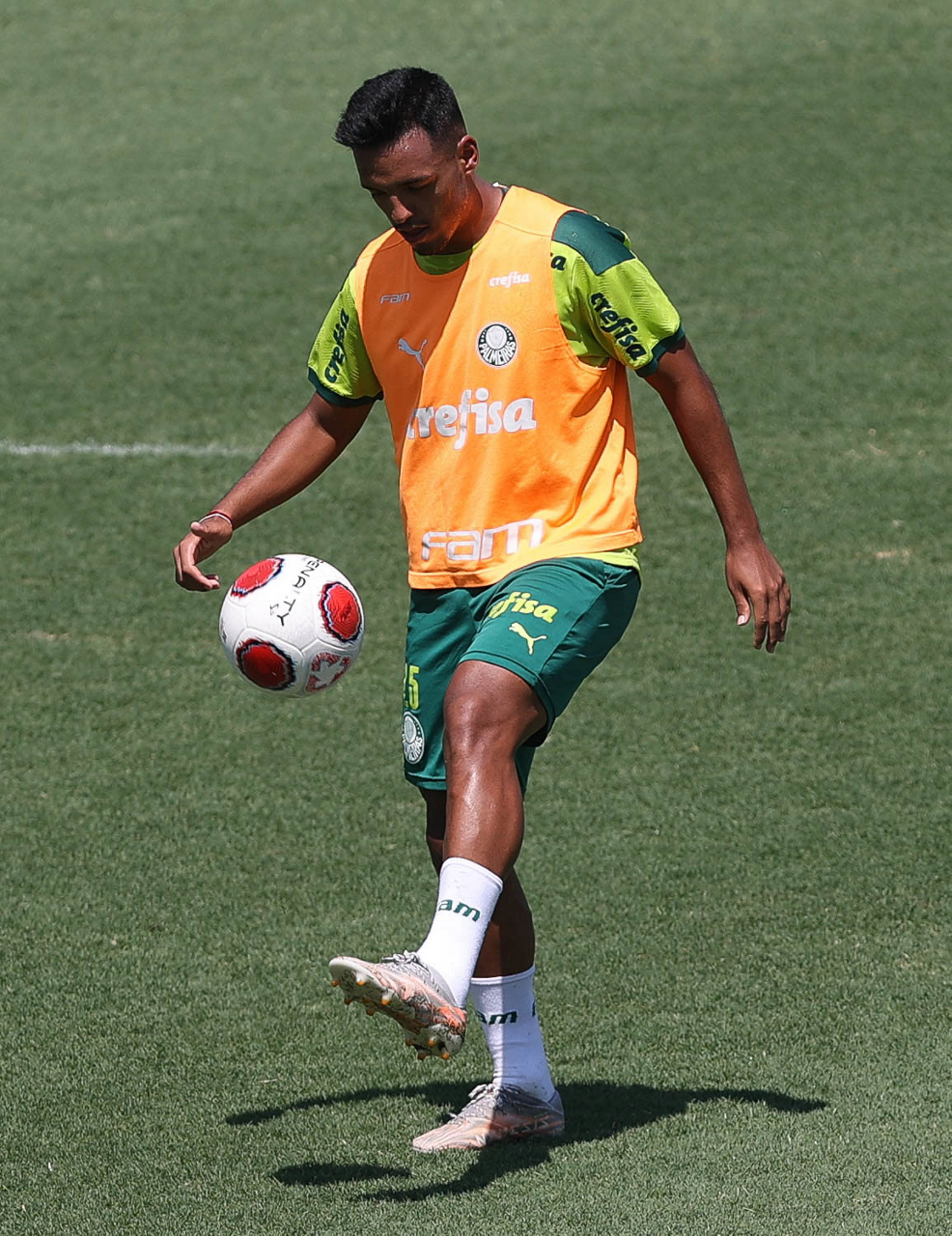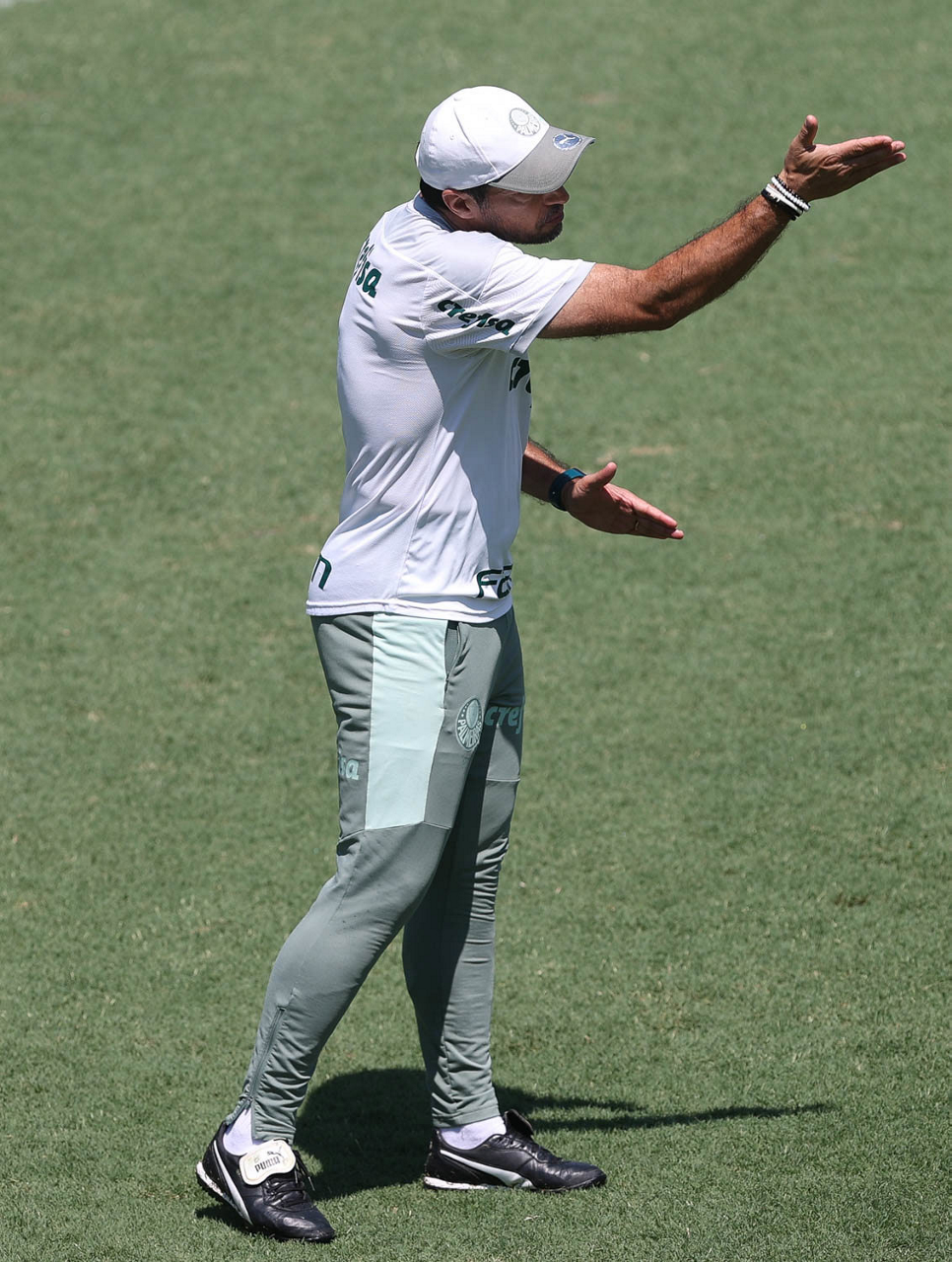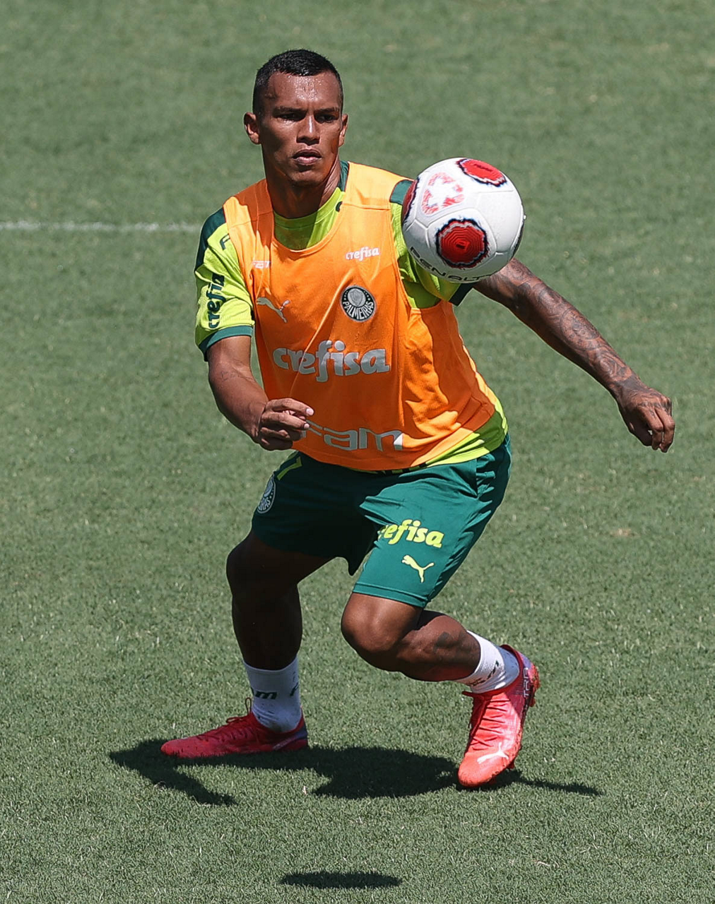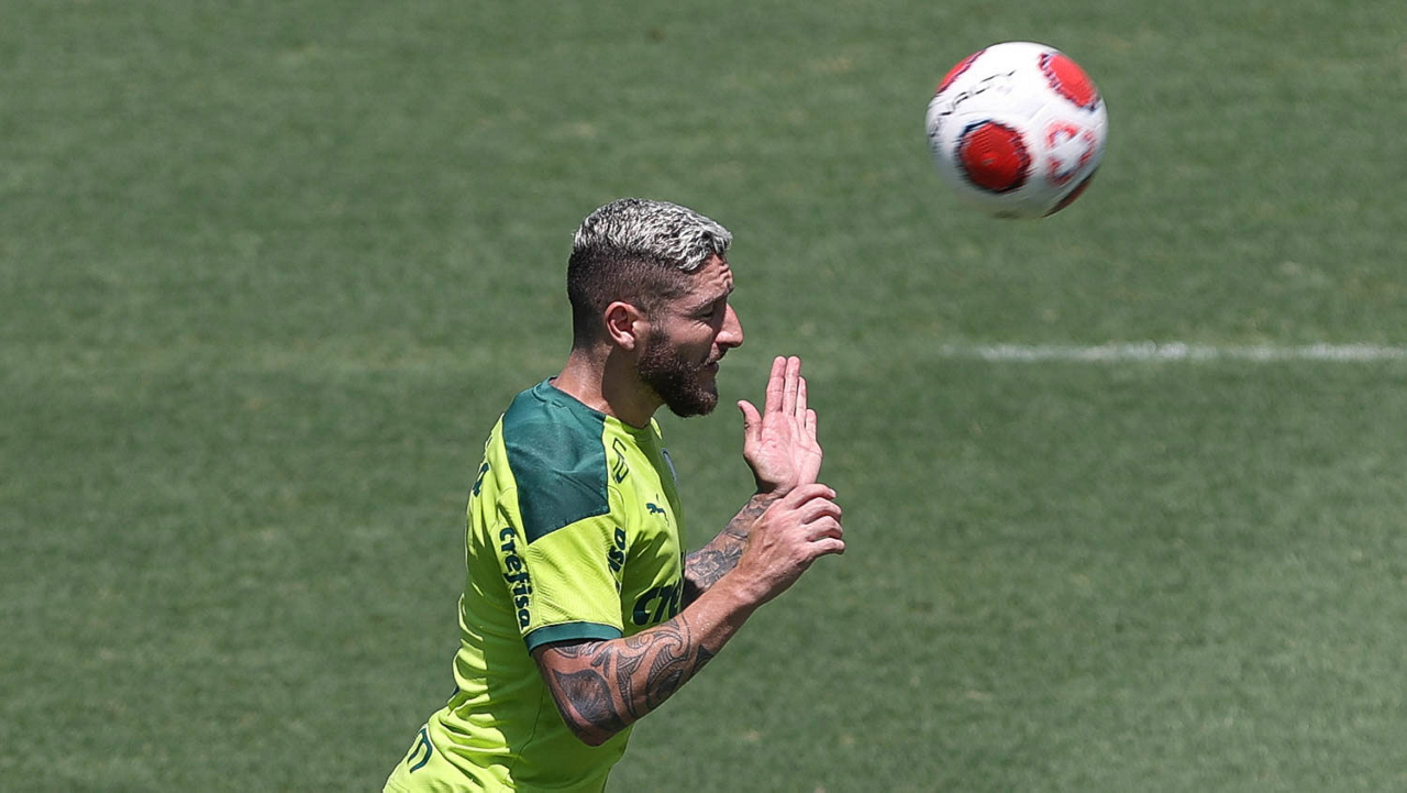 Os jogadores Luan, Renan, Deyverson, Gustavo Gómez, Rony e Dudu (E/D em pé) e Marcos Rocha, Zé Rafael, Wesley, Eduard Atuesta, Danilo, Breno Lopes e Jorge (E/D agachados), da SE Palmeiras, durante treinamento, na Academia de Futebol. (Foto: Cesar Greco)