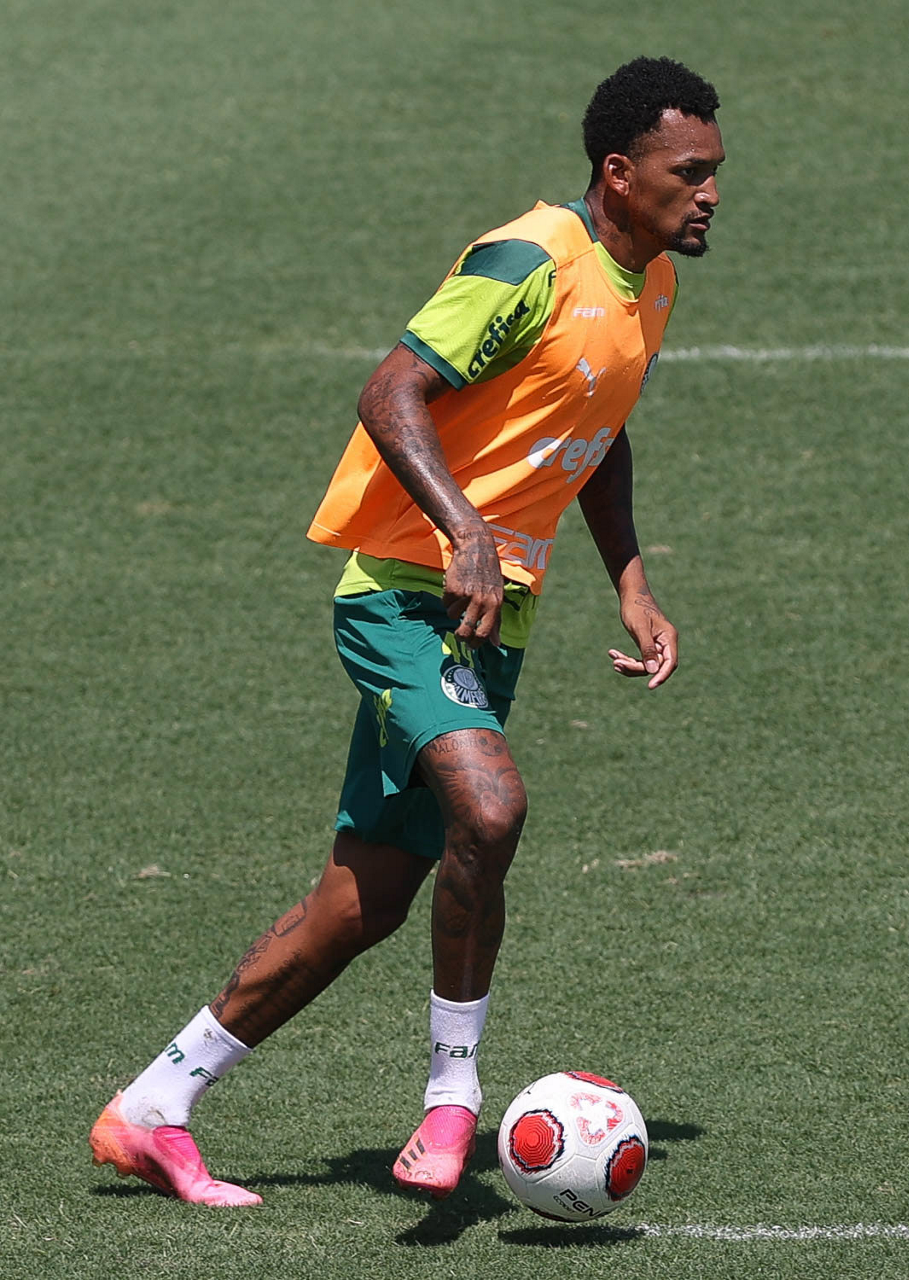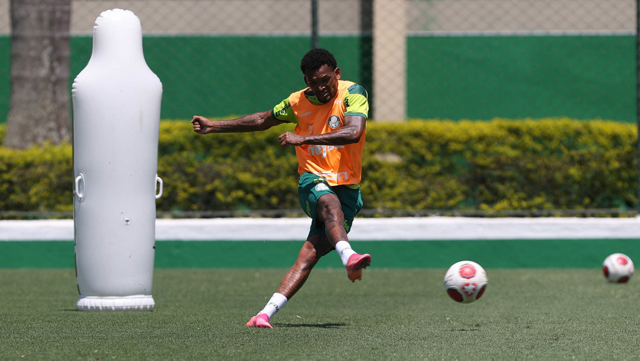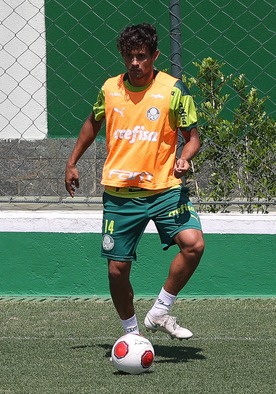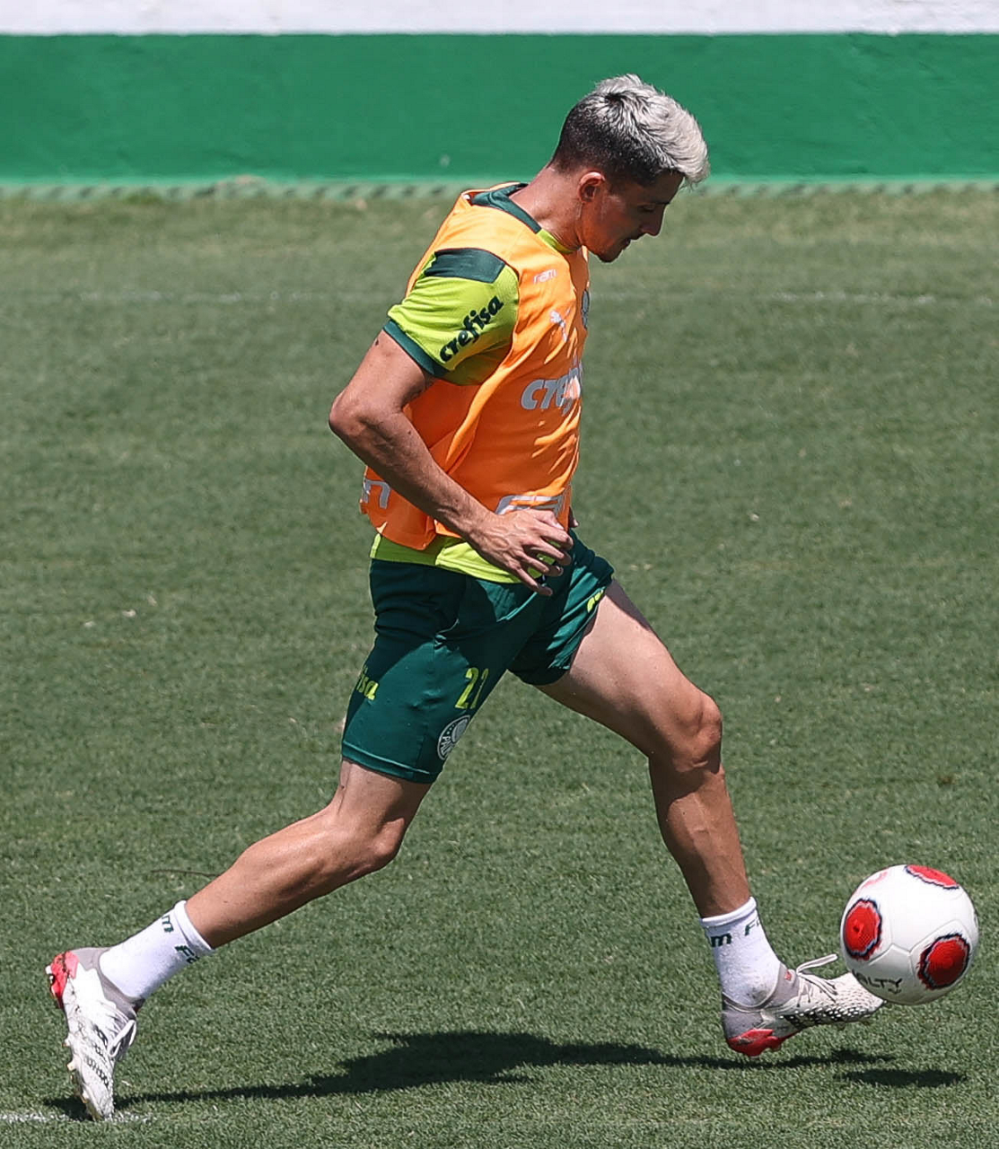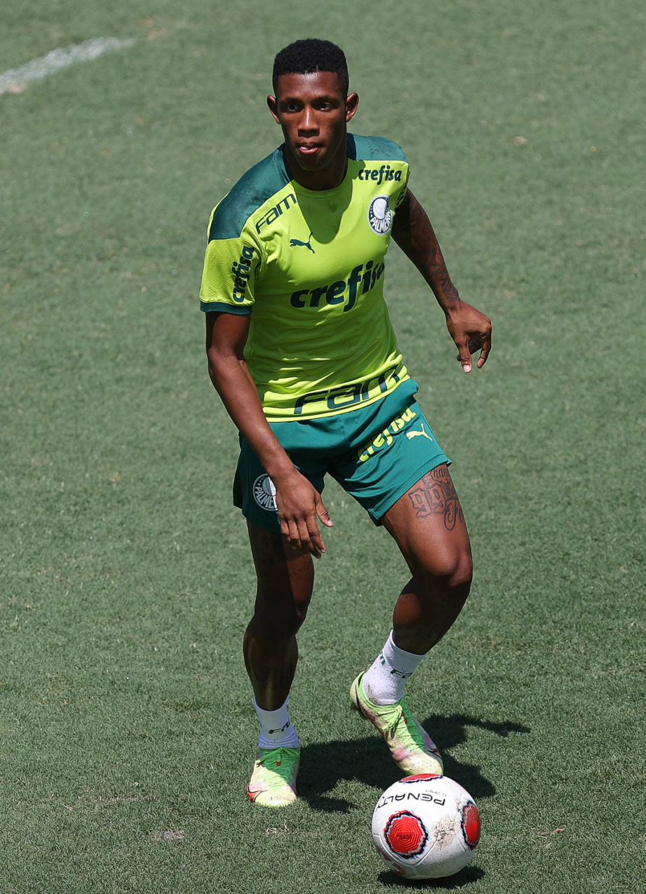 Os jogadores Luan, Renan, Deyverson, Gustavo Gómez, Rony e Dudu (E/D em pé) e Marcos Rocha, Zé Rafael, Wesley, Eduard Atuesta, Danilo, Breno Lopes e Jorge (E/D agachados), da SE Palmeiras, durante treinamento, na Academia de Futebol. (Foto: Cesar Greco)