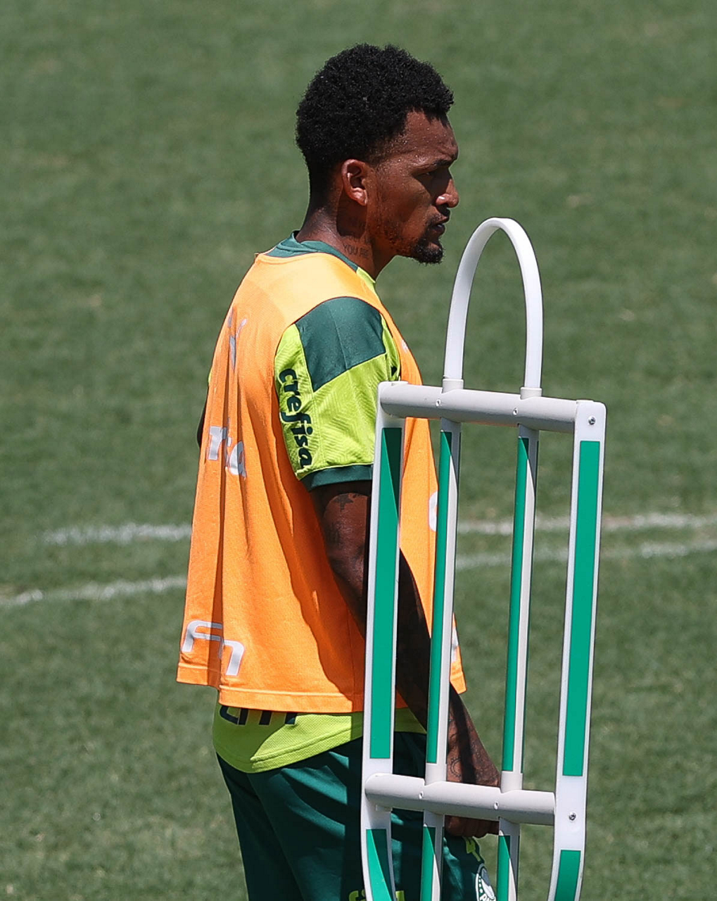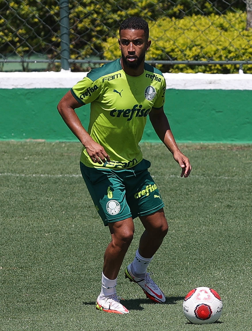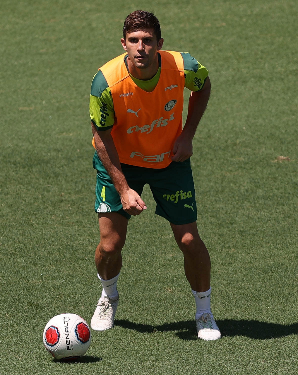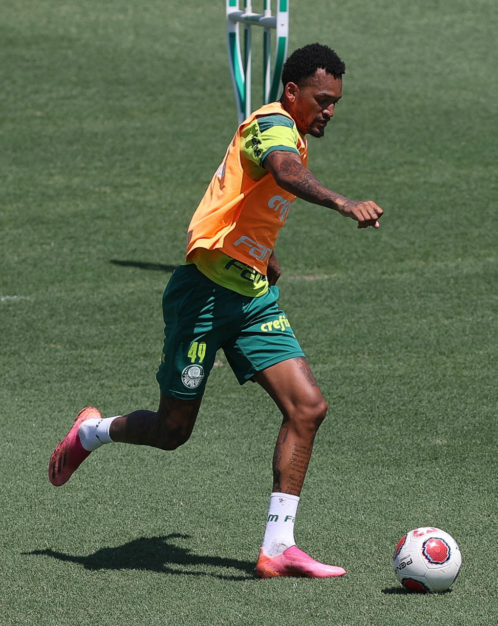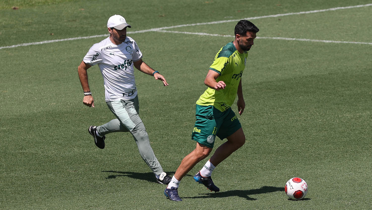 Os jogadores Luan, Renan, Deyverson, Gustavo Gómez, Rony e Dudu (E/D em pé) e Marcos Rocha, Zé Rafael, Wesley, Eduard Atuesta, Danilo, Breno Lopes e Jorge (E/D agachados), da SE Palmeiras, durante treinamento, na Academia de Futebol. (Foto: Cesar Greco)