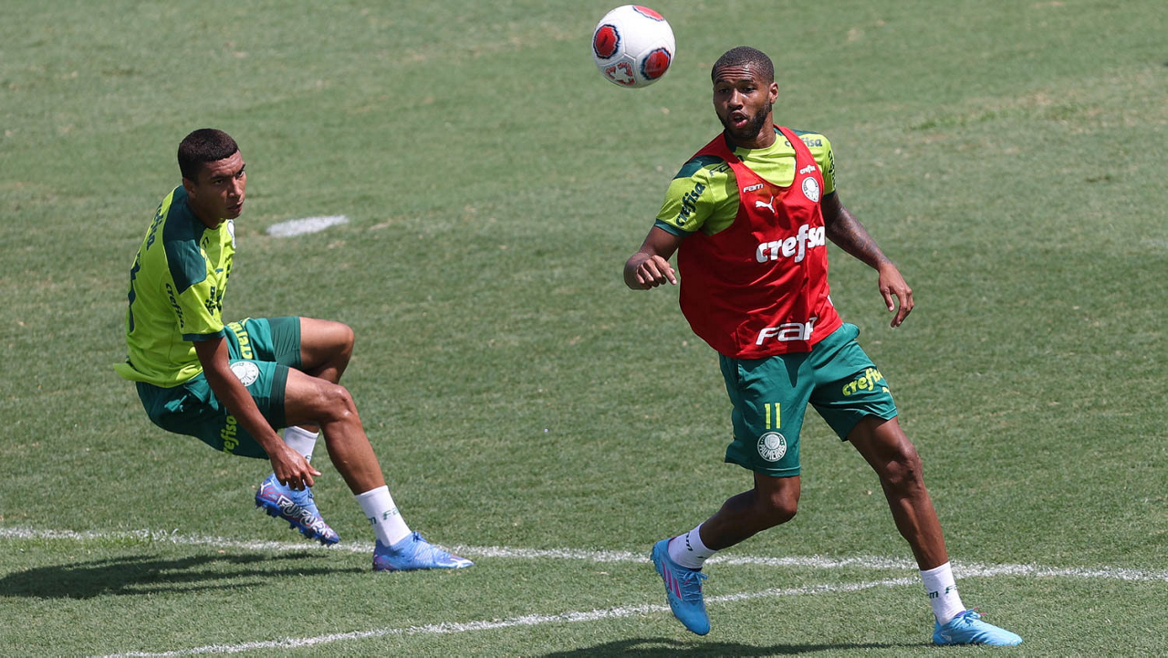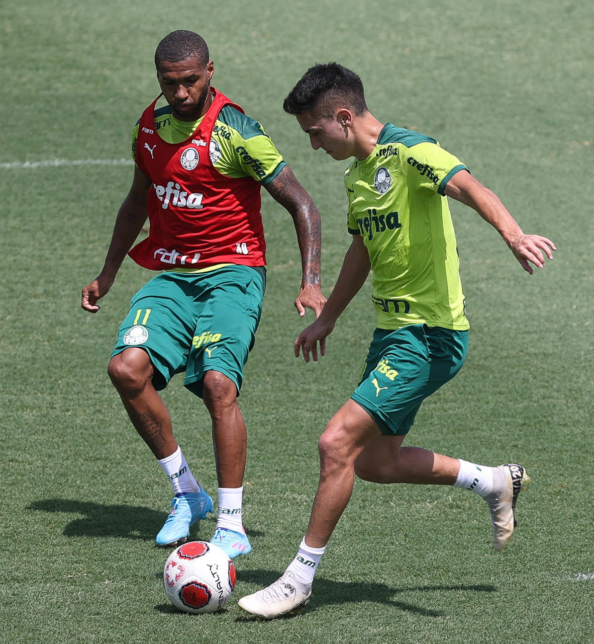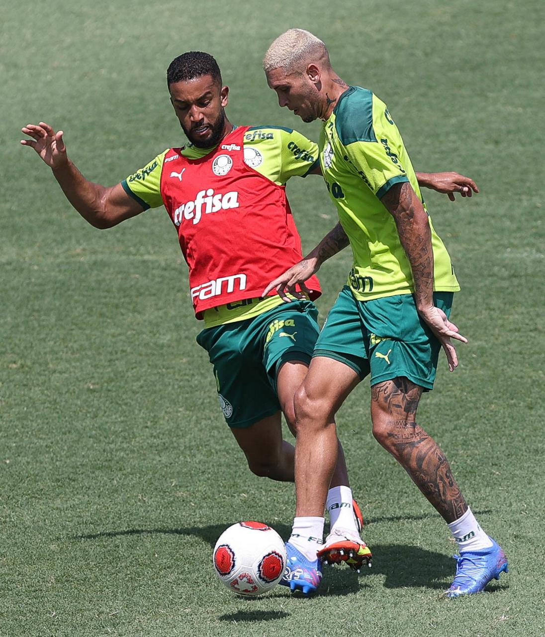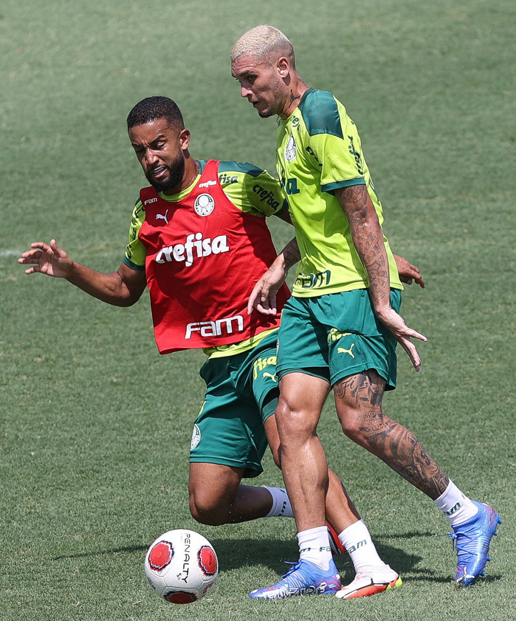 Os jogadores Deyverson e Serafim (D), da SE Palmeiras, durante treinamento, na Academia de Futebol. (Foto: Cesar Greco)
