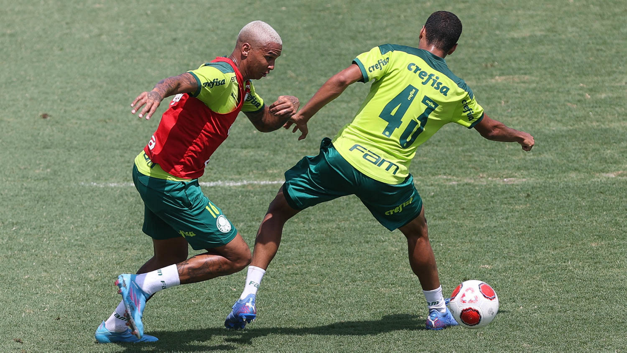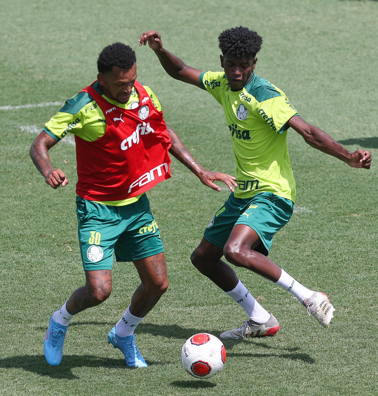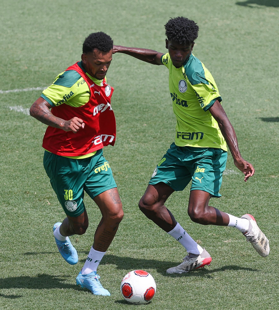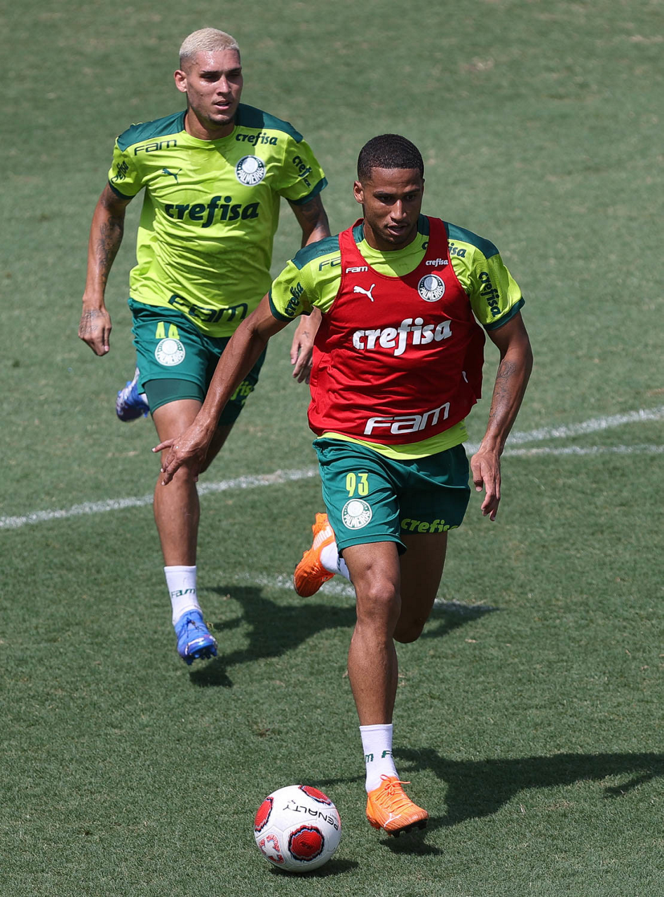 Os jogadores Deyverson e Serafim (D), da SE Palmeiras, durante treinamento, na Academia de Futebol. (Foto: Cesar Greco)
