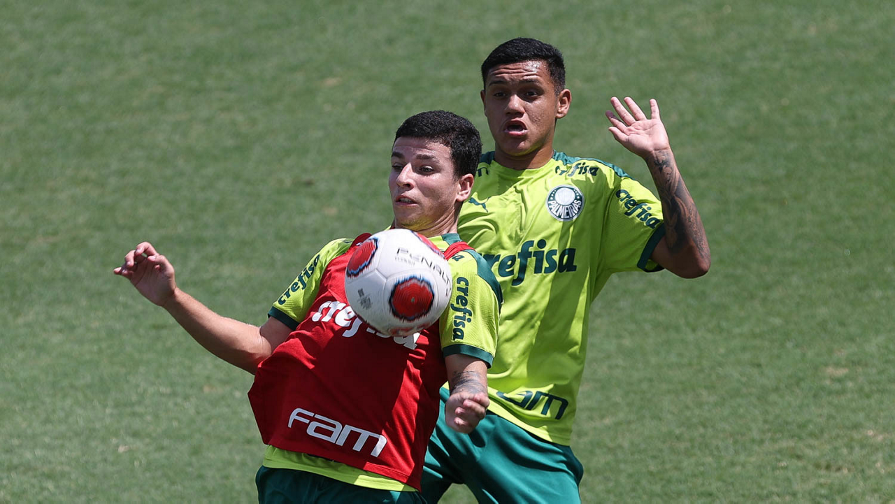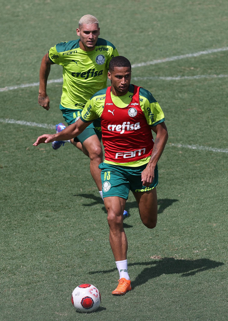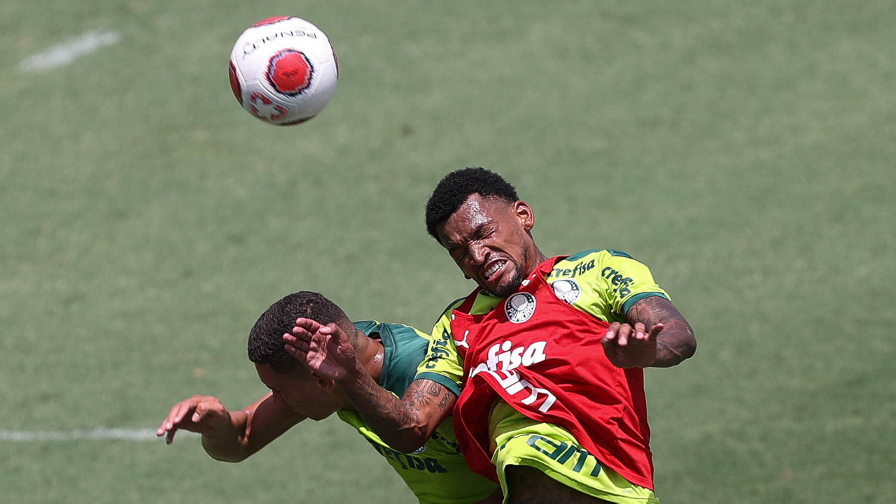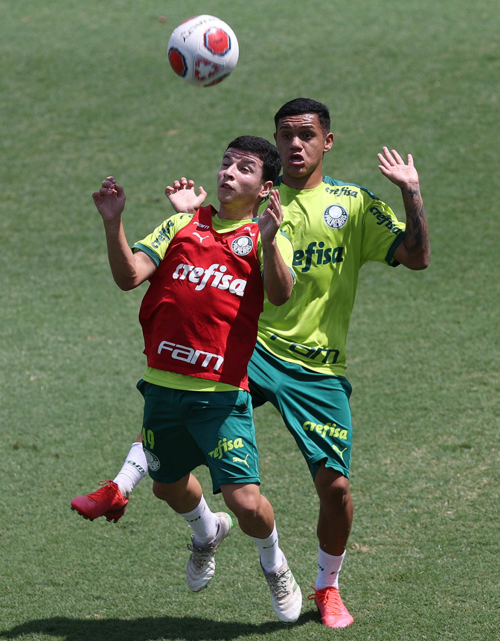Os jogadores Deyverson e Serafim (D), da SE Palmeiras, durante treinamento, na Academia de Futebol. (Foto: Cesar Greco)