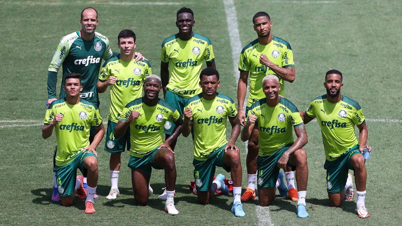 O goleiro Marcelo Lomba, os jogadores Thiago, Mina e Murilo (E/D em pé) e Diogo Crispim, Patrick de Paula, Jailson, Deyverson e Jorge (E/D agachados), da SE Palmeiras, durante treinamento, na Academia de Futebol. (Foto: Cesar Greco)