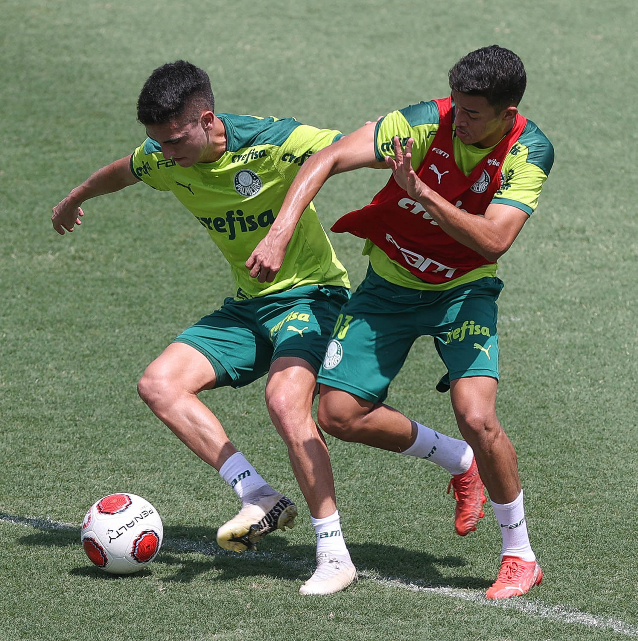 Os jogadores Thiago e Carlos Matheus (D), da SE Palmeiras, durante treinamento, na Academia de Futebol. (Foto: Cesar Greco)