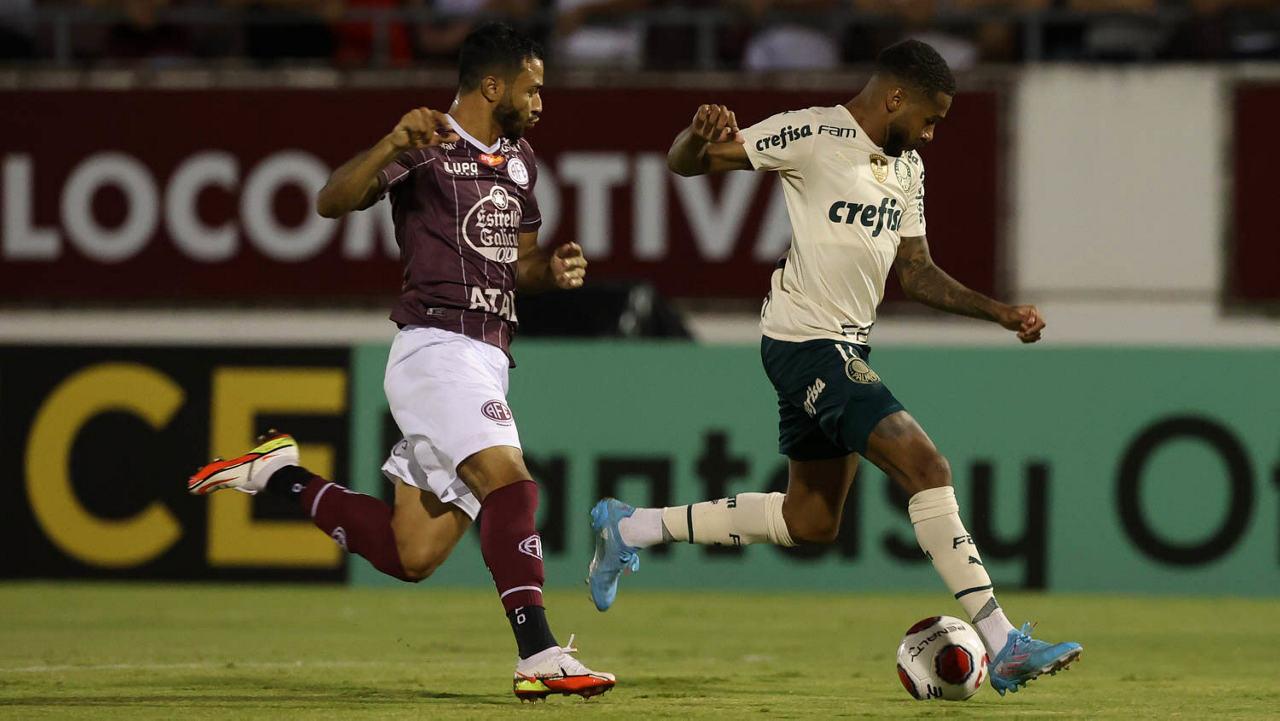 O jogador Patrick de Paula, da SE Palmeiras, disputa bola com o jogador Marquinhos, da A Ferroviária E, durante partida válida pela sétima rodada, do Campeonato Paulista, Série A1, no Estádio Municipal Dr Ademar Pereira de Barros. (Foto: Cesar Greco)