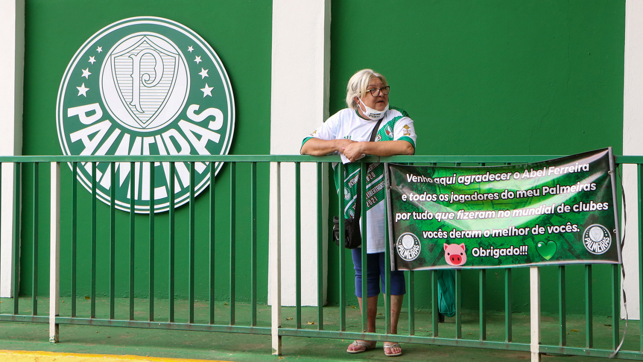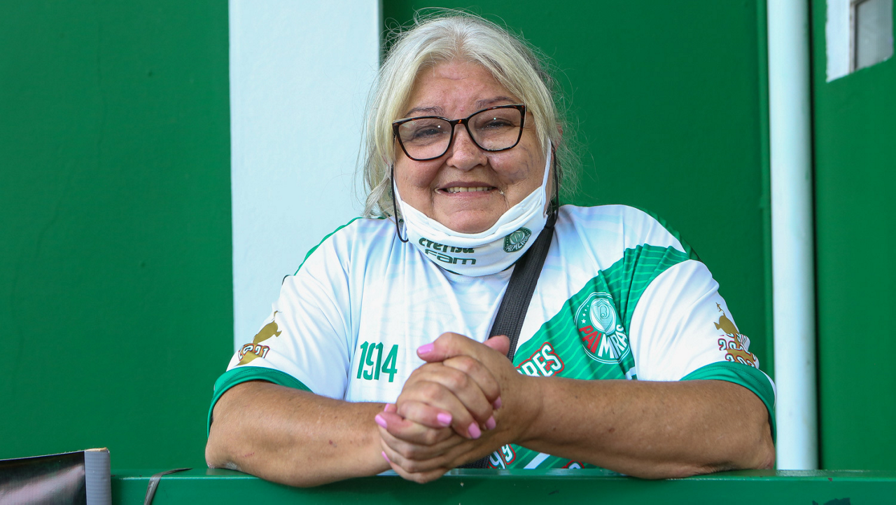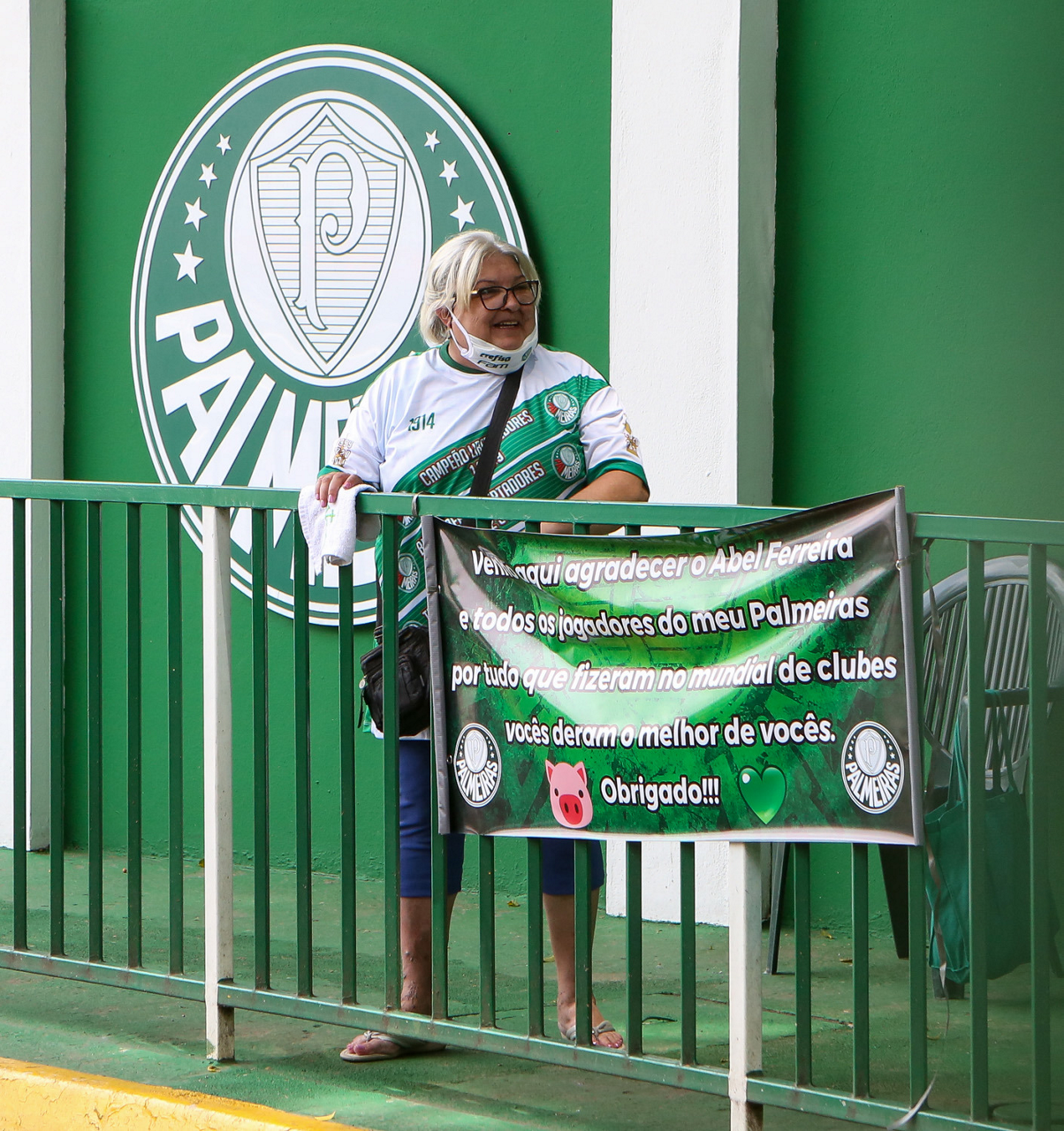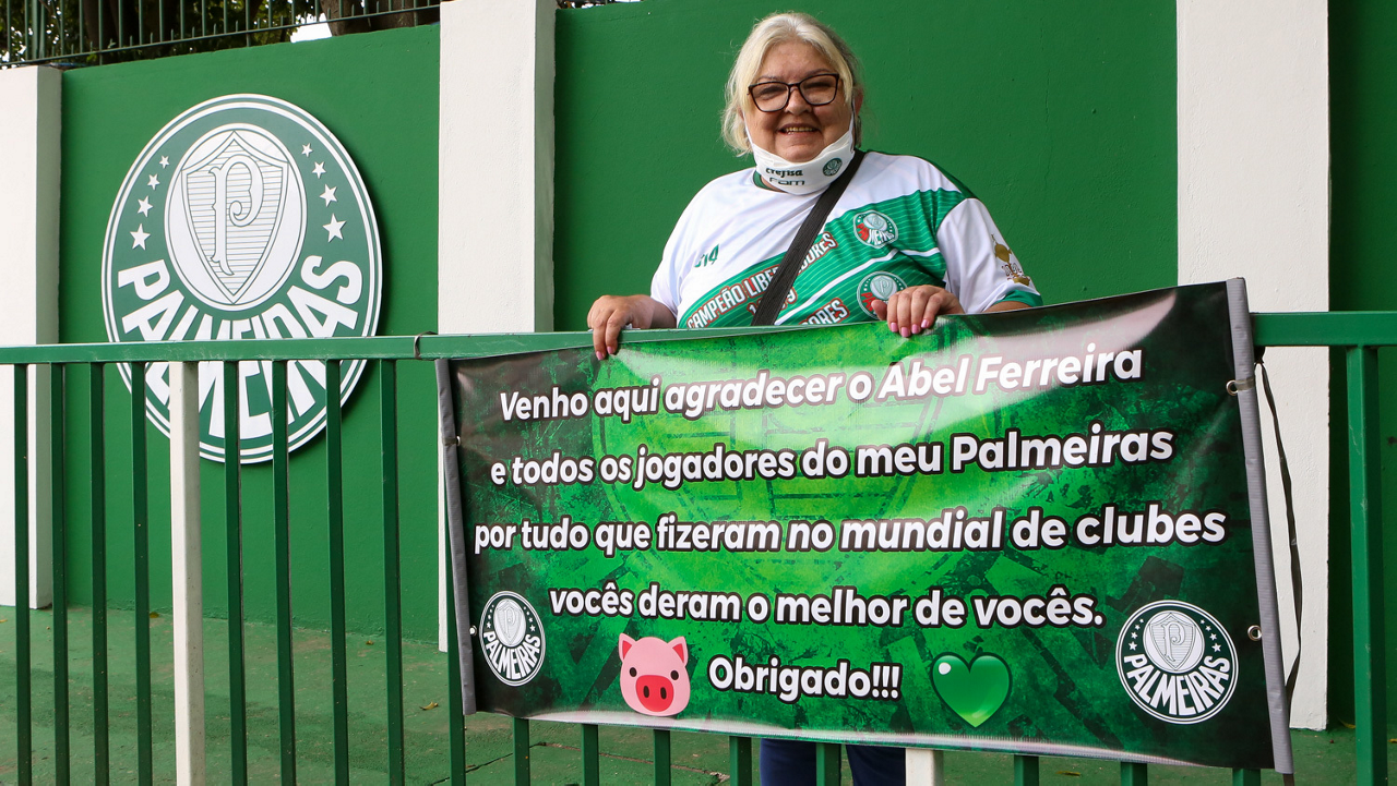 A torcedora Jane Chiazza, de 54 anos, trouxe uma faixa de agradecimento ao empenho demonstrado pela equipe durante a Copa do Mundo de Clubes da Fifa (Foto: Fabio Menotti)