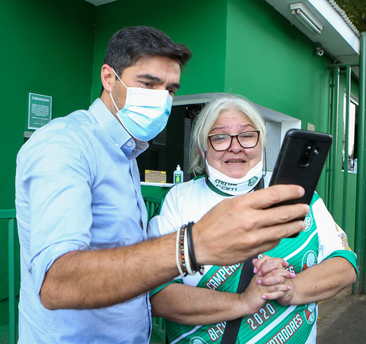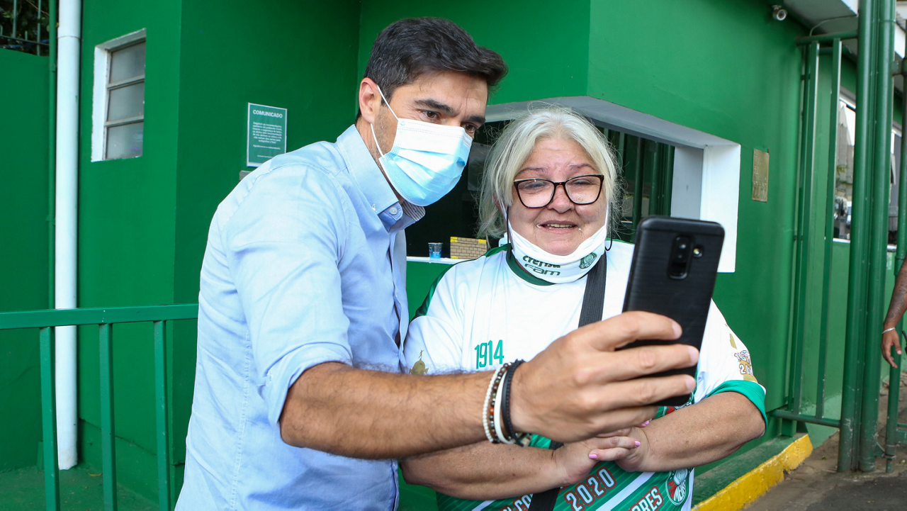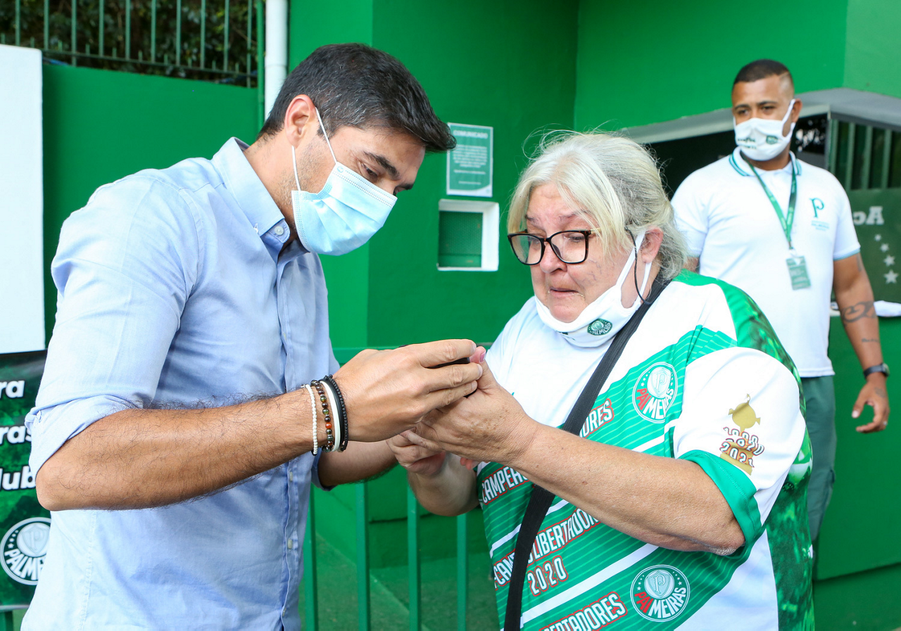 O jogador Raphael Veiga, da SE Palmeiras, cumprimenta o auxiliar técnico da Seleção Brasileira Cesar Sampaio, durante treinamento, na Academia de Futebol. (Foto: Cesar Greco)