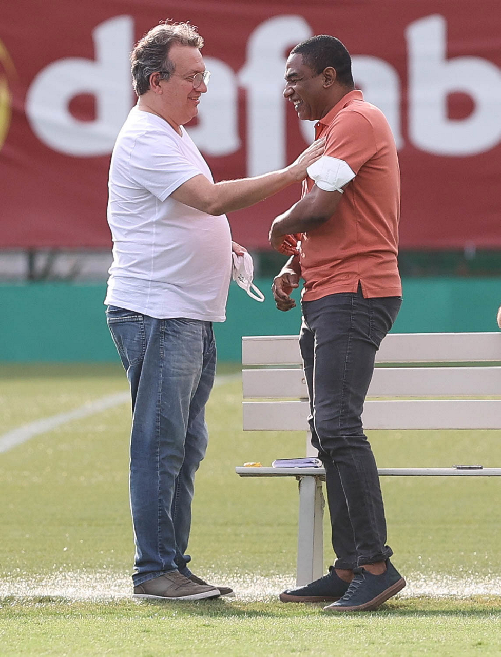 O vice presidente Paulo Buosi, da SE Palmeiras, cuprimenta o auxiliar técnico da Seleção Brasileira Cesar Sampaio, durante treinamento, na Academia de Futebol. (Foto: Cesar Greco)