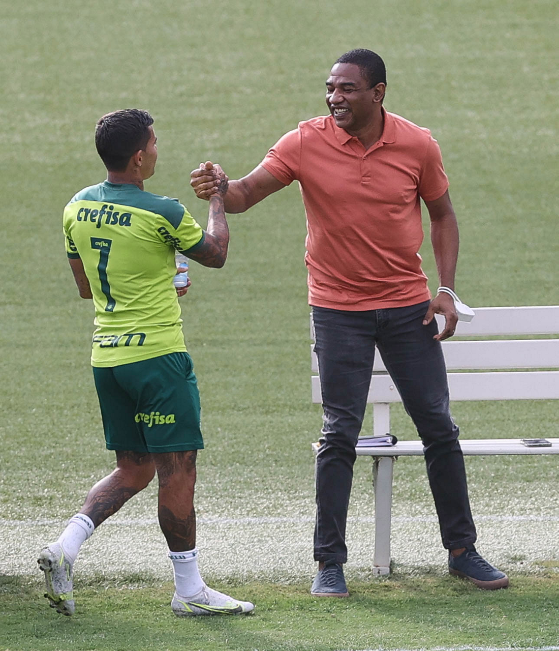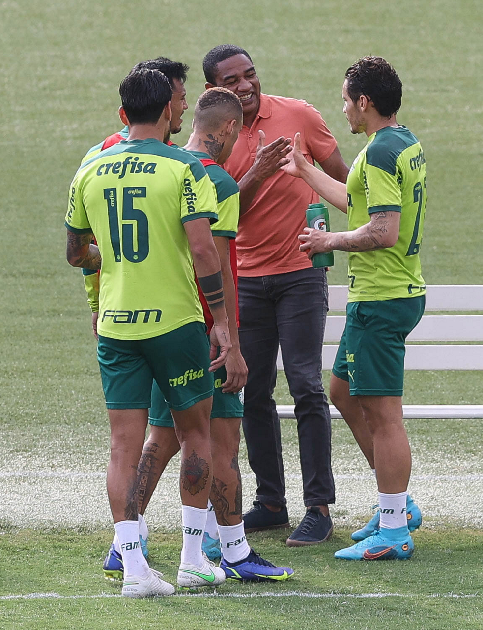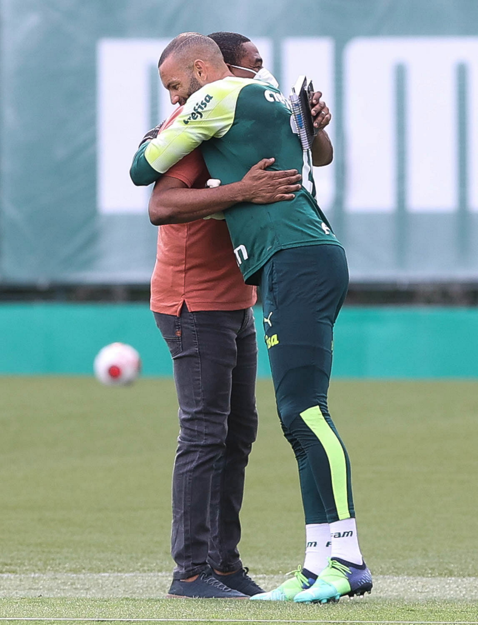 O jogador Deyverson, da SE Palmeiras, cumprimenta o auxiliar técnico da Seleção Brasileira Cesar Sampaio, durante treinamento, na Academia de Futebol. (Foto: Cesar Greco)
