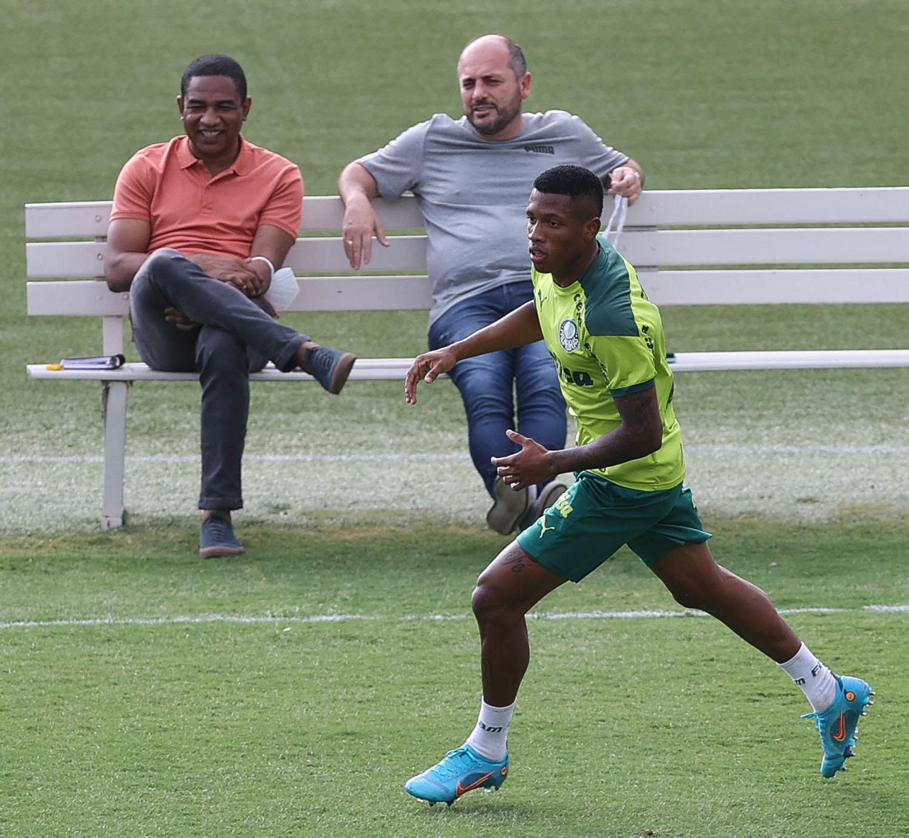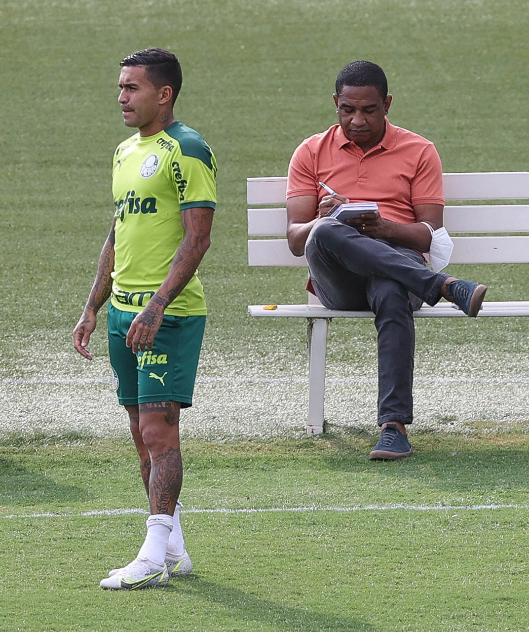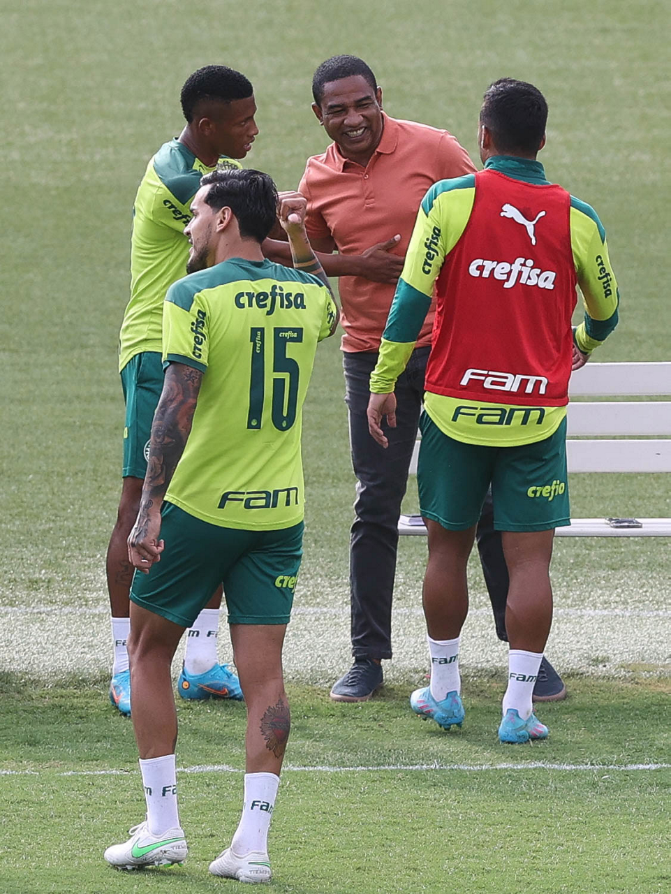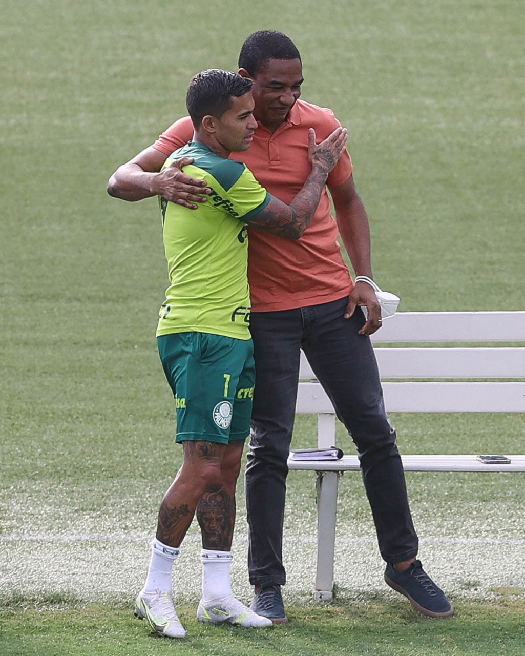 O jogador Deyverson, da SE Palmeiras, cumprimenta o auxiliar técnico da Seleção Brasileira Cesar Sampaio, durante treinamento, na Academia de Futebol. (Foto: Cesar Greco)