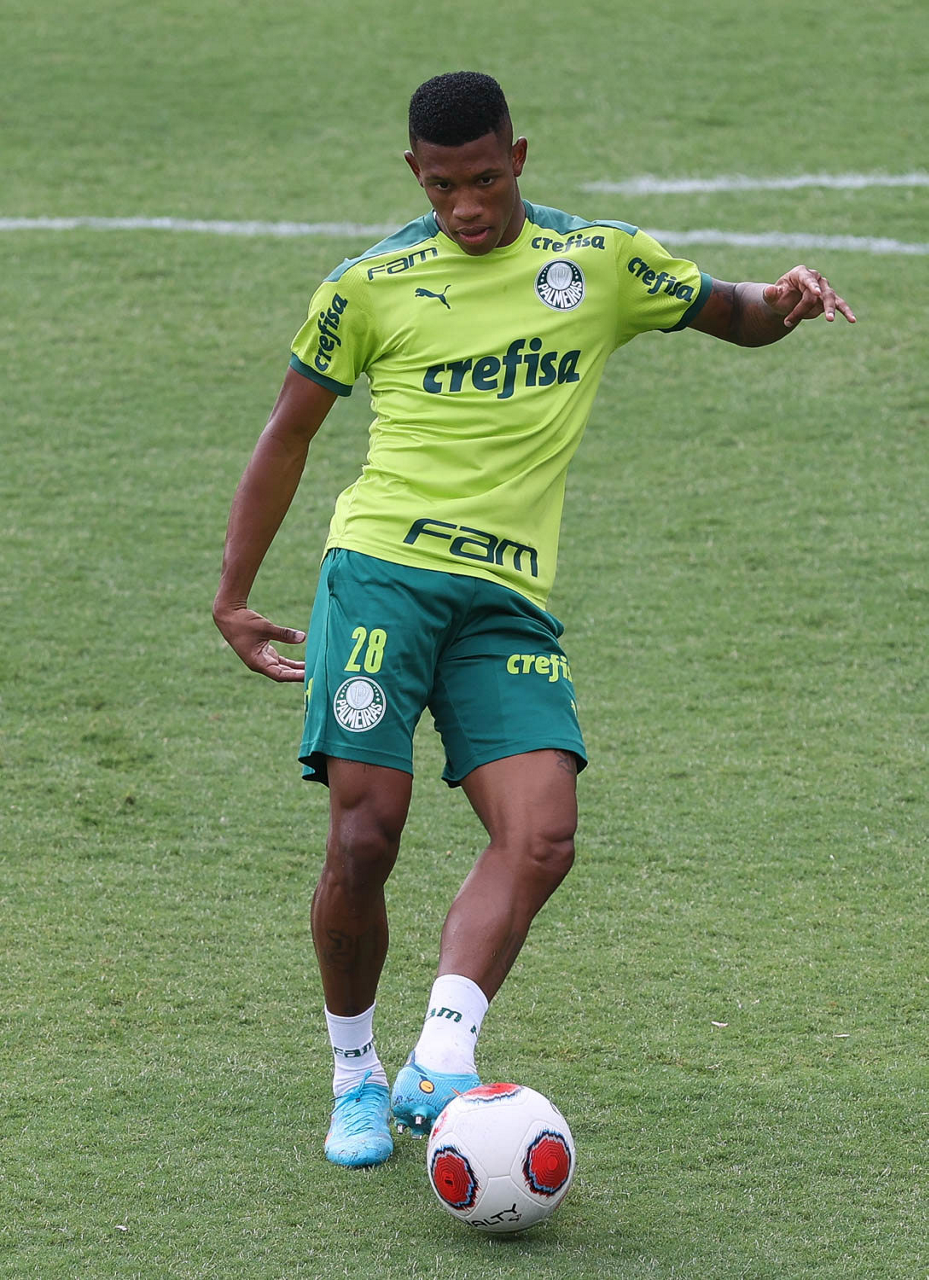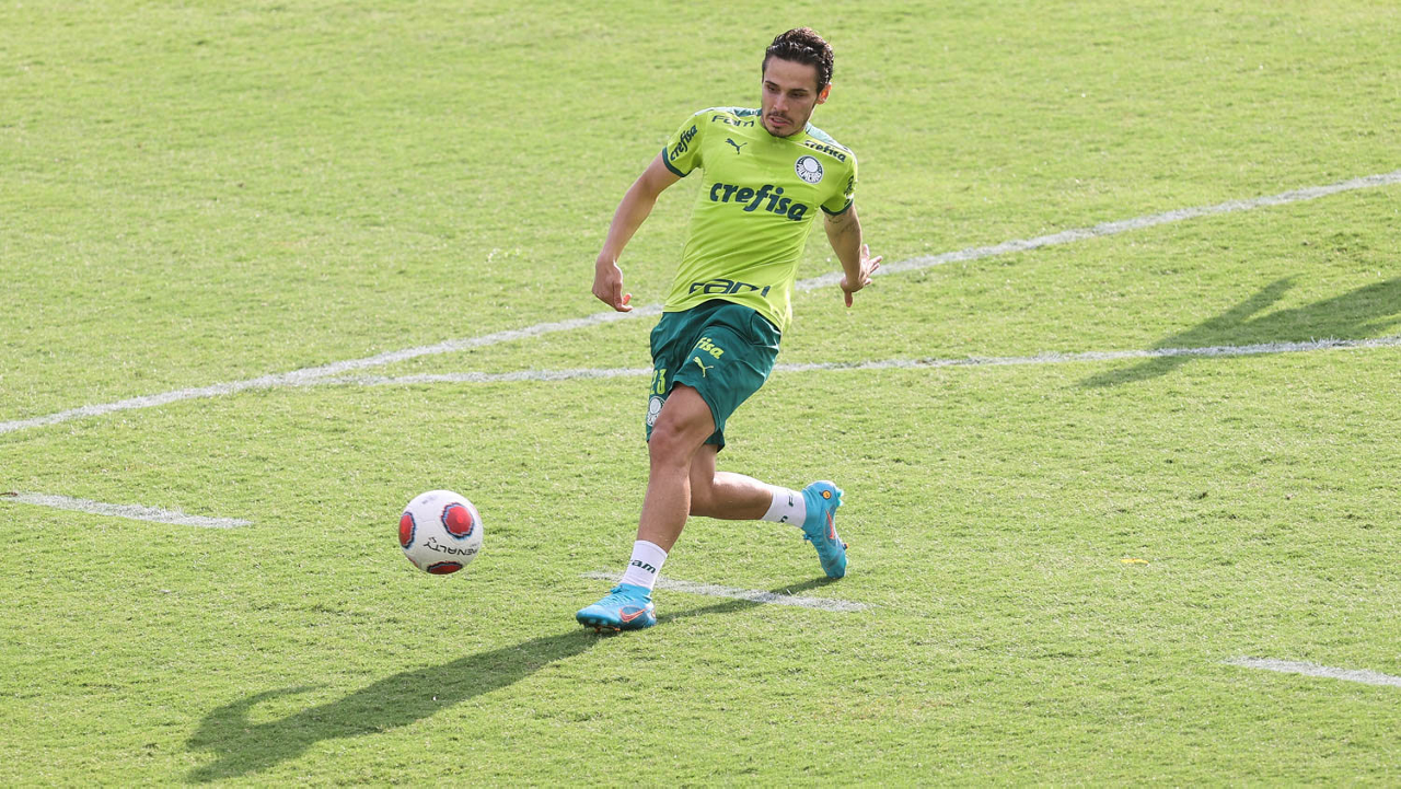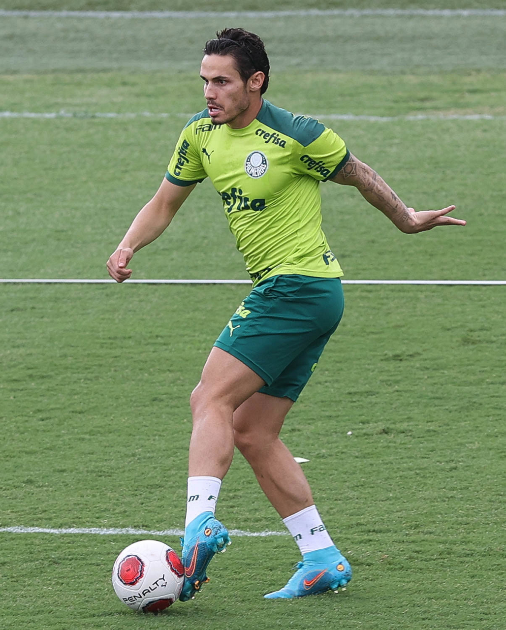 O jogador Raphael Veiga, da SE Palmeiras, durante treinamento, na Academia de Futebol. (Foto: Cesar Greco)