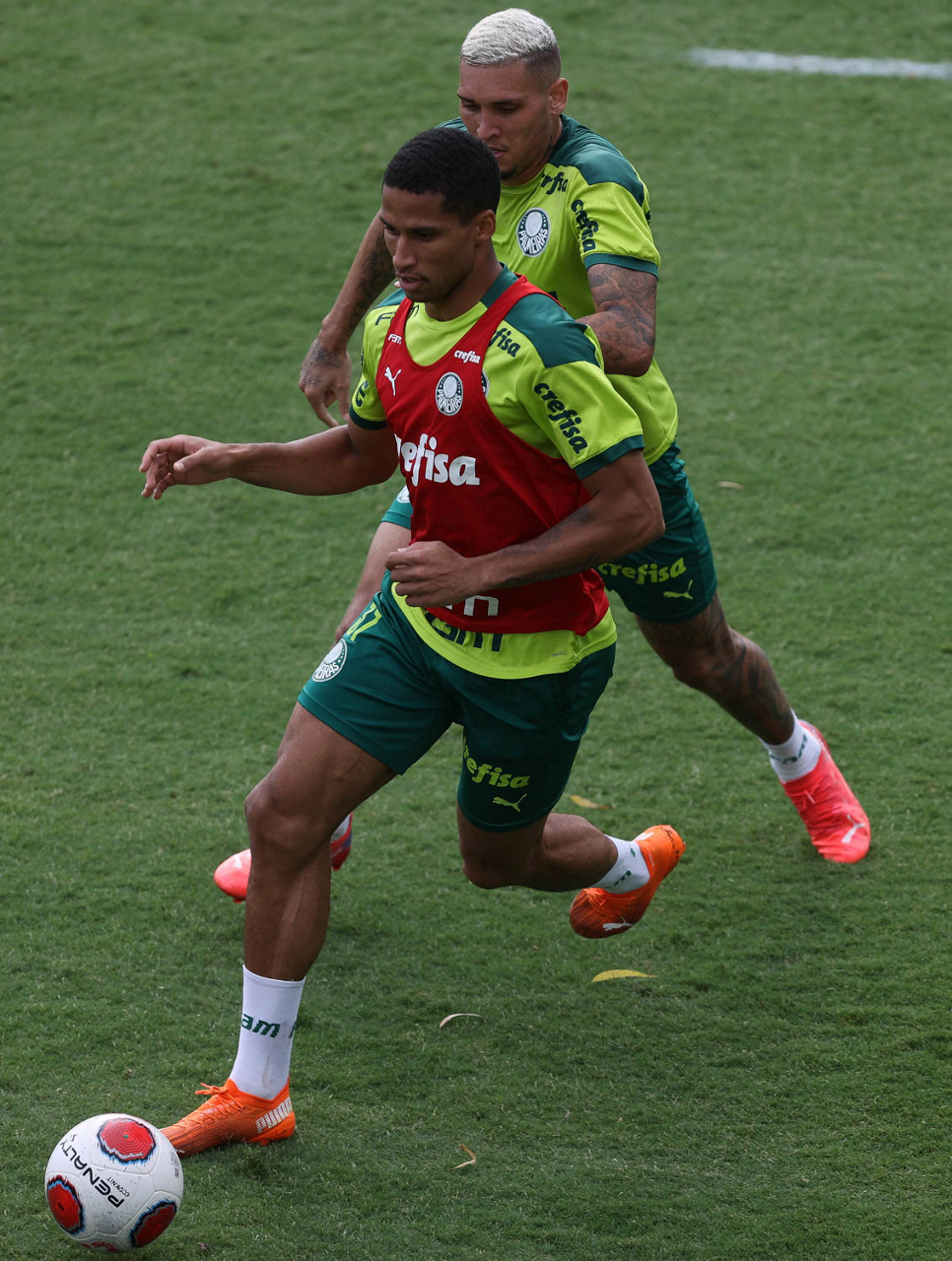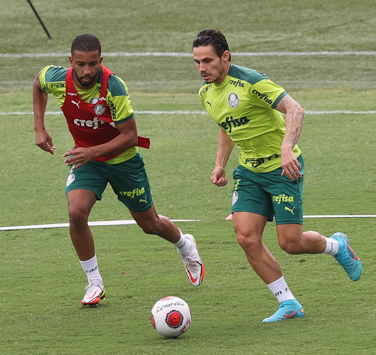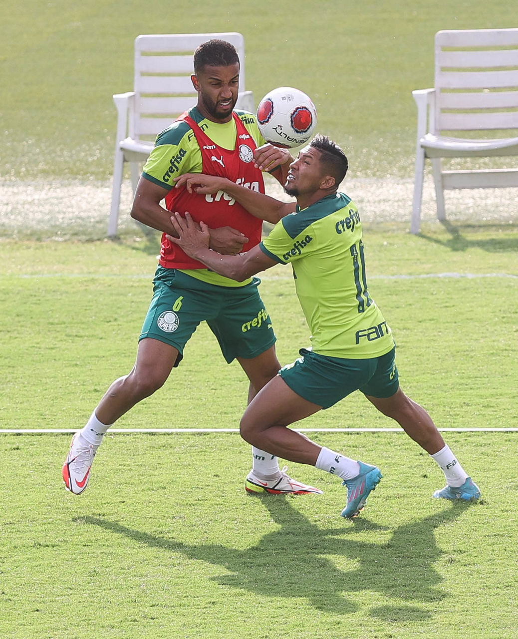 Os jogadores Jorge e Raphael Veiga (D), da SE Palmeiras, durante treinamento, na Academia de Futebol. (Foto: Cesar Greco)