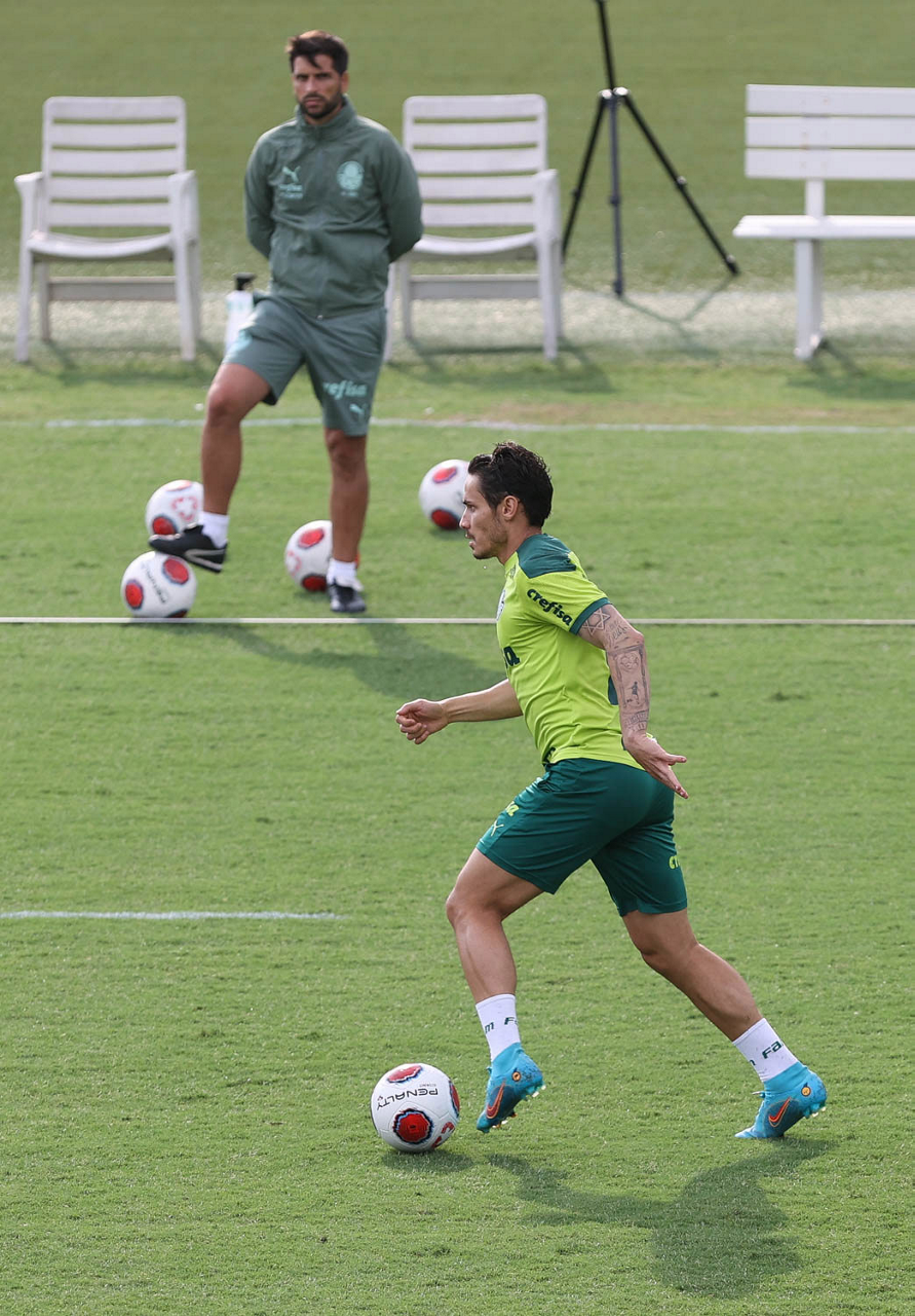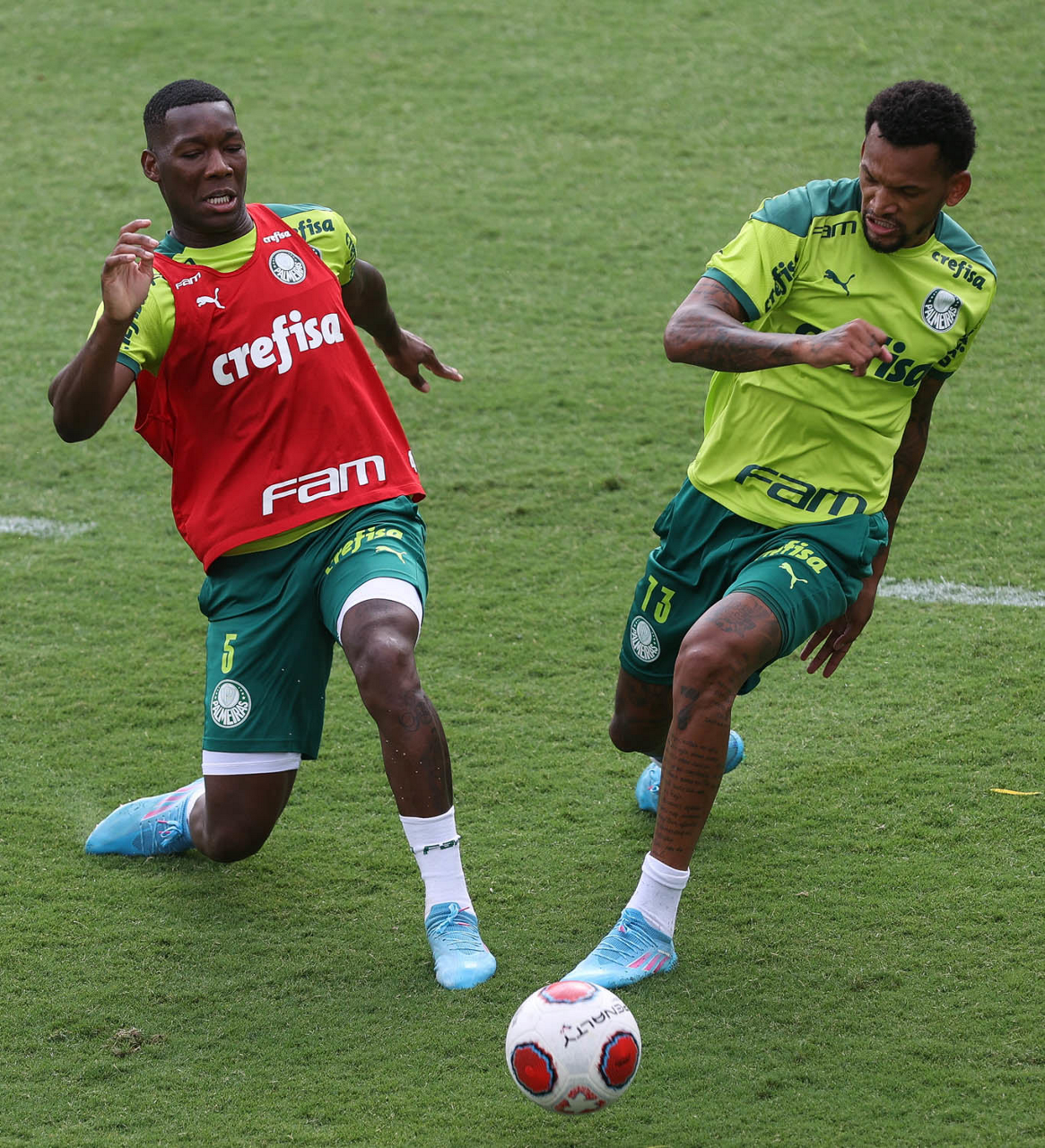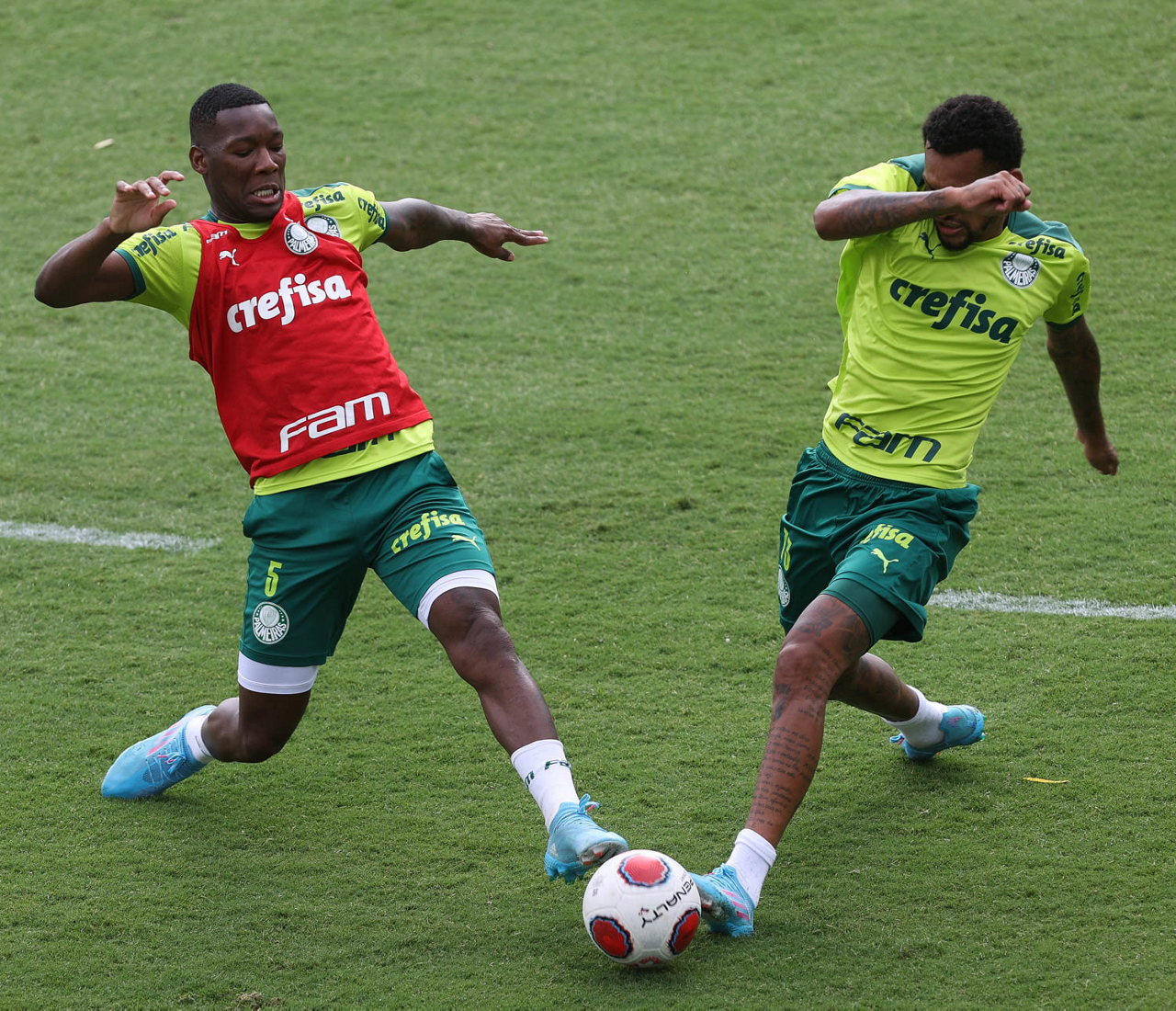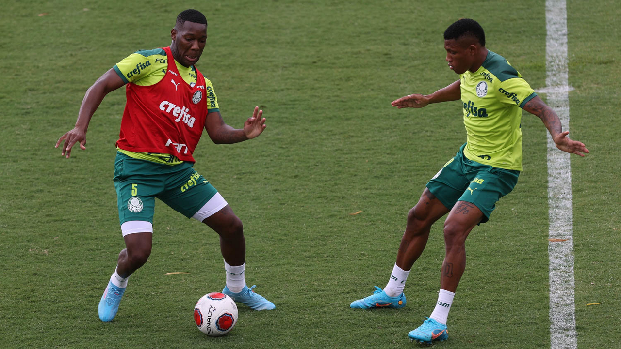 Os jogadores Jorge e Raphael Veiga (D), da SE Palmeiras, durante treinamento, na Academia de Futebol. (Foto: Cesar Greco)