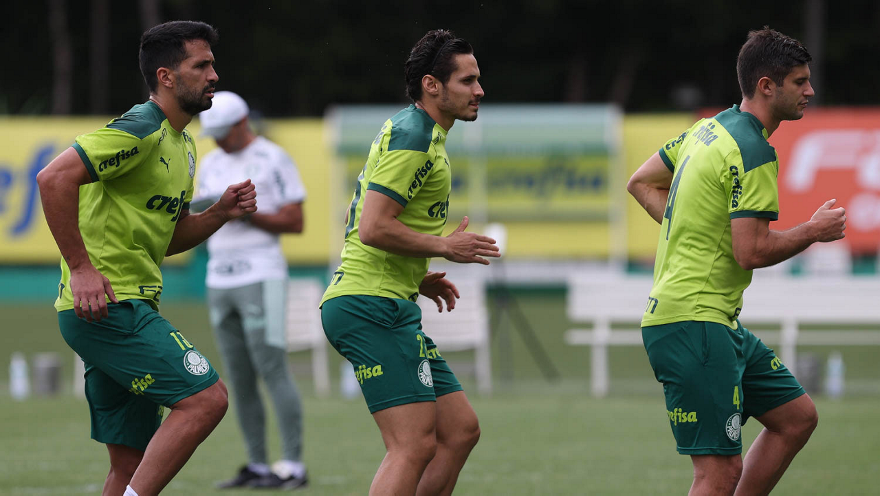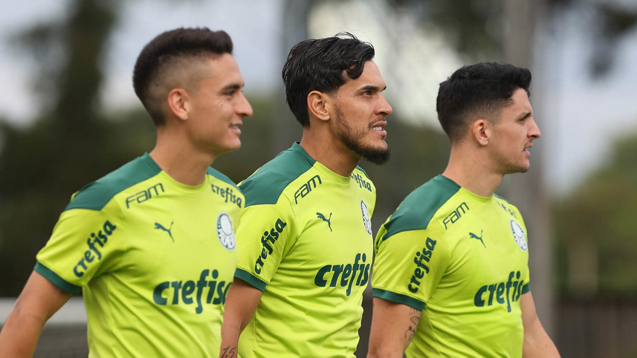 Os jogadores Luan, Raphael Veiga e Benjamín Kuscevic (E/D), da SE Palmeiras, durante treinamento, na Academia de Futebol. (Foto: Cesar Greco)