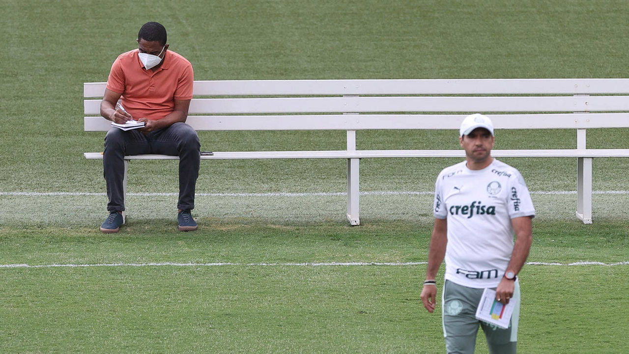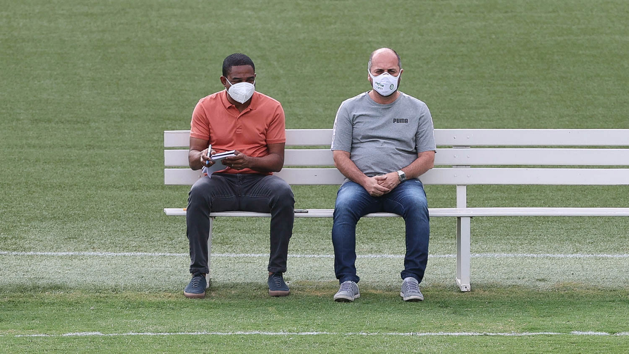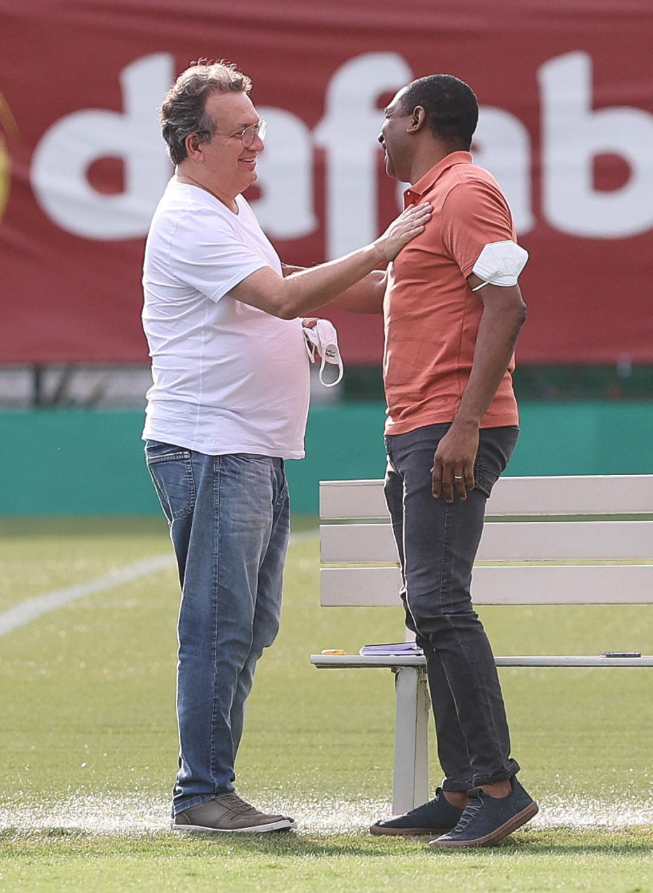 O gerente de futebol Cicero Souza, da SE Palmeiras, recebe o auxiliar técnico da Seleção Brasileira Cesar Sampaio, durante treinamento, na Academia de Futebol. (Foto: Cesar Greco)