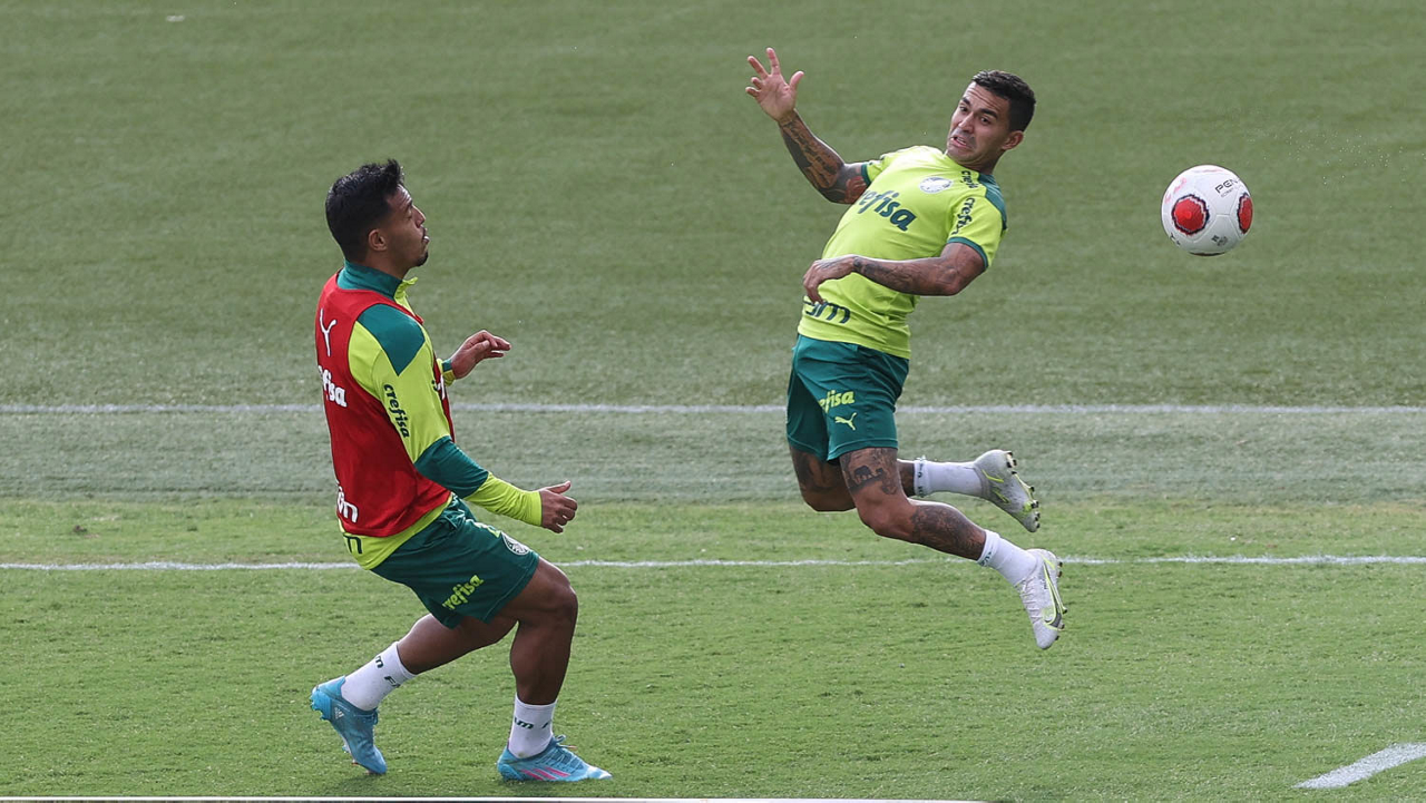 Os jogadores Gabriel Menino e Dudu (D), da SE Palmeiras, durante treinamento, na Academia de Futebol. (Foto: Cesar Greco)