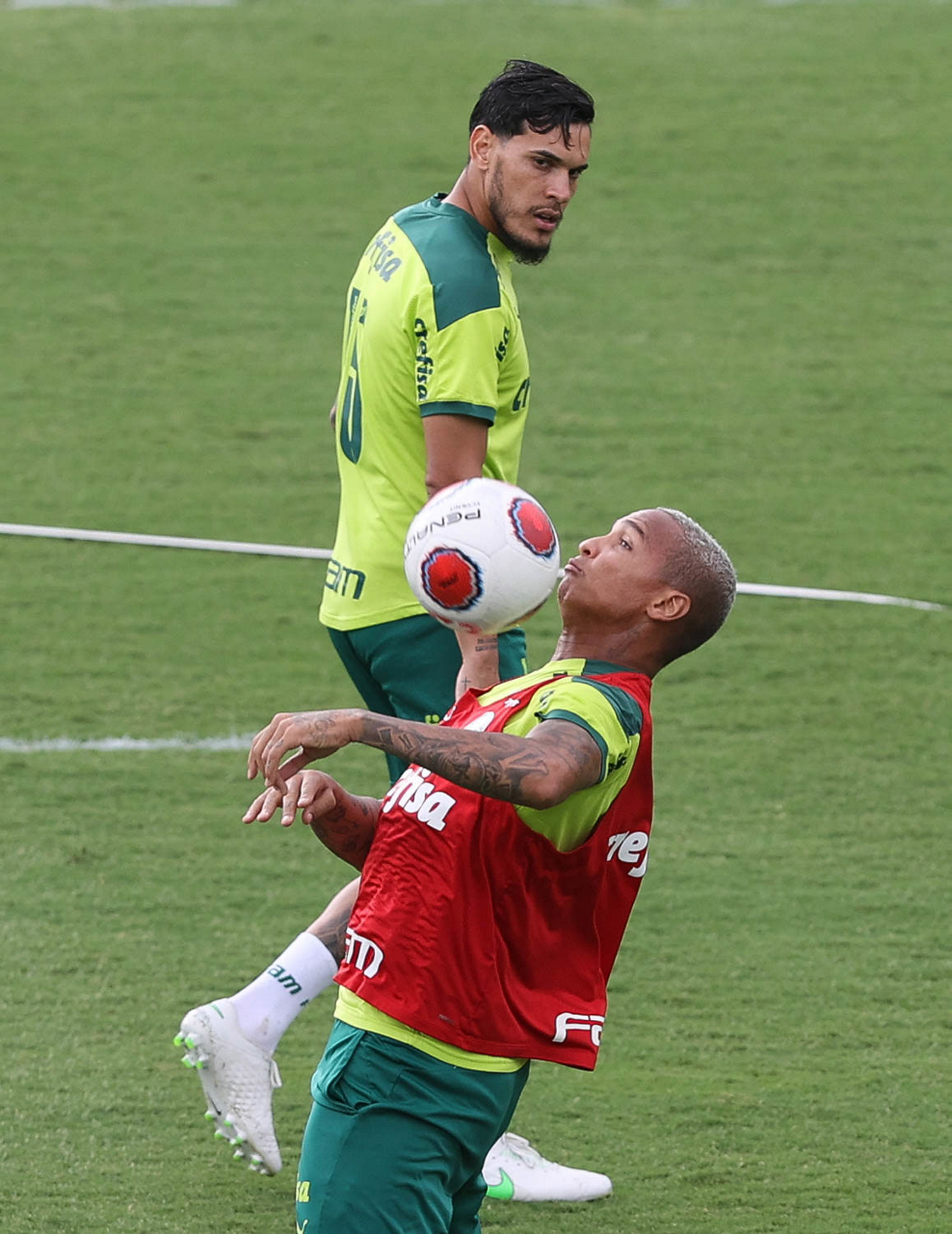 Os jogadores Renan e Deyverson (D), da SE Palmeiras, durante treinamento, na Academia de Futebol. (Foto: Cesar Greco)