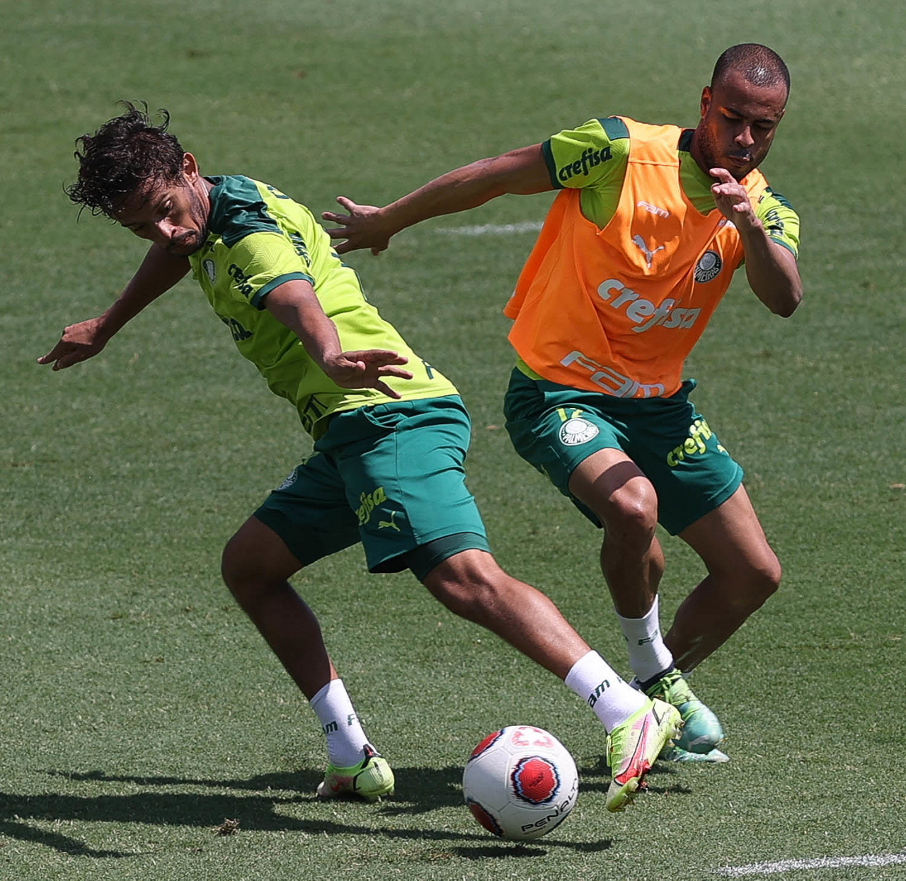 Os jogadores Raphael Veiga e Danilo (D), da SE Palmeiras, durante treinamento, na Academia de Futebol. (Foto: Cesar Greco)