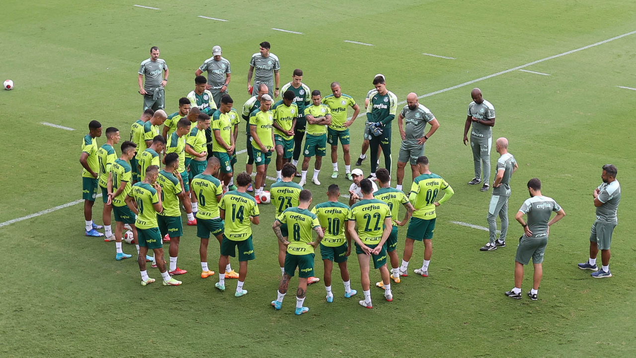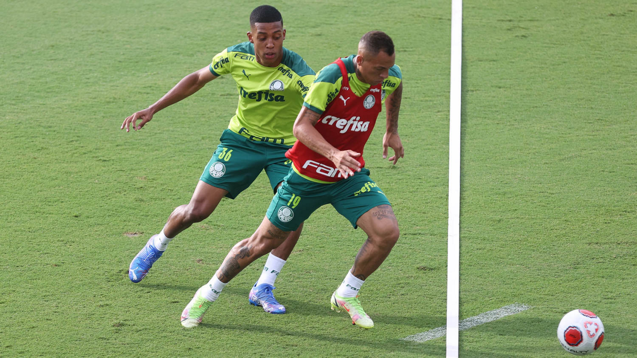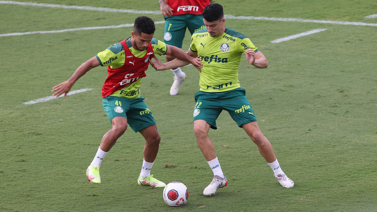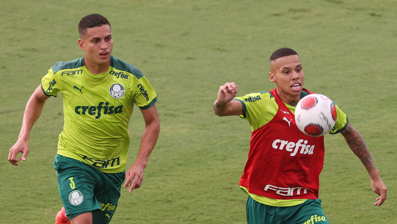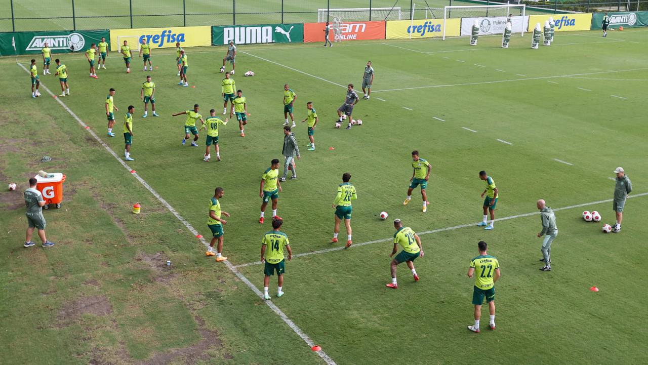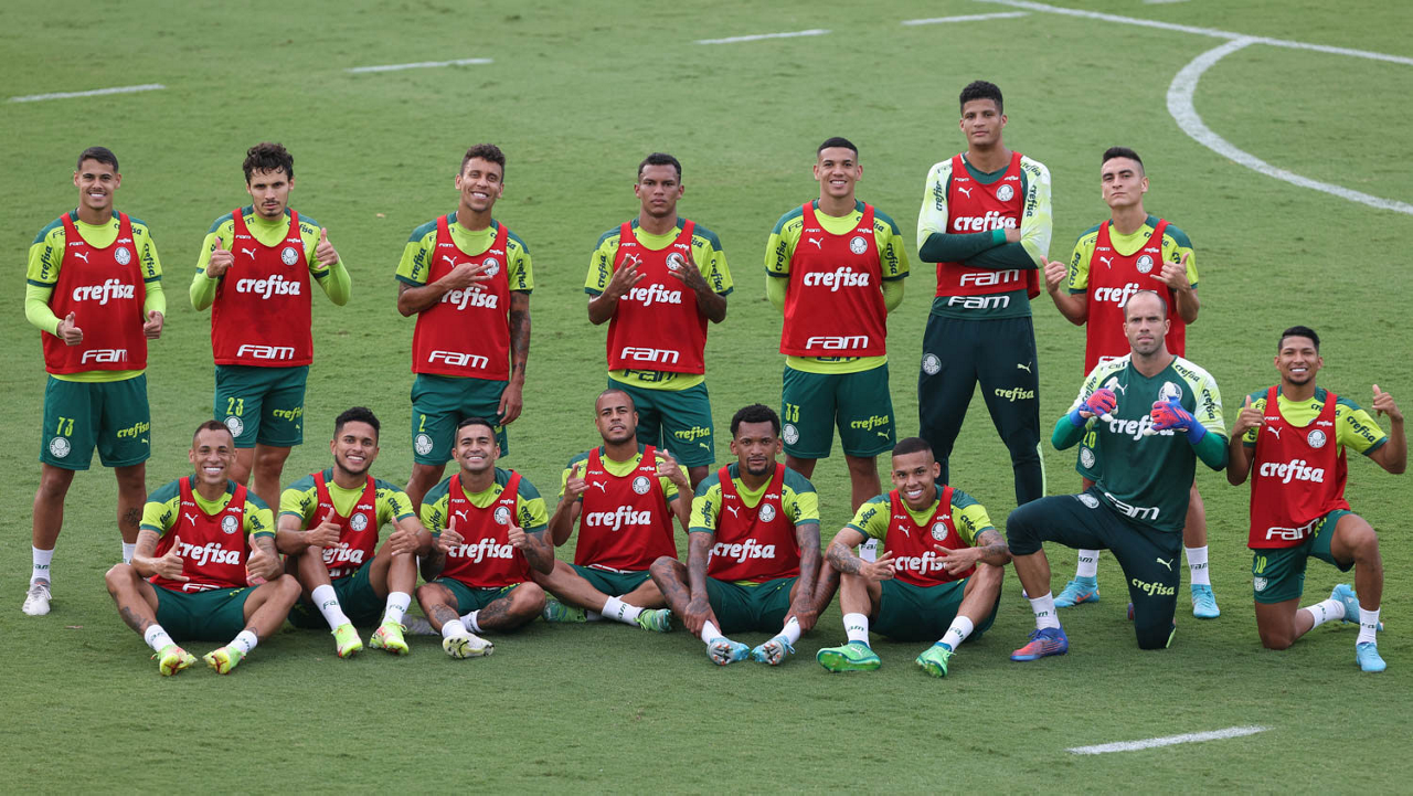 Os jogadores Lucas Freitas, Raphael Veiga, Marcos Rocha, Gabriel Veron, Naves, Mateus, Eduard Atuesta (E/D em pé) e Breno Lopes, Gabriel Silva, Dudu, Mayke, Jailson, Garcia, Marcelo Lomba e Rony (E/D agachados), da SE Palmeiras, durante treinamento, na Academia de Futebol. (Foto: Cesar Greco)