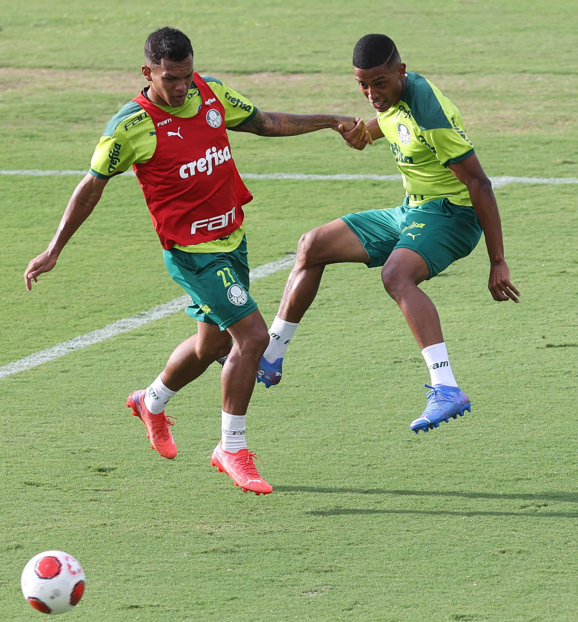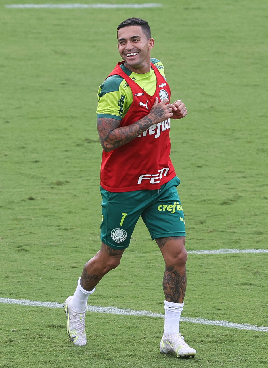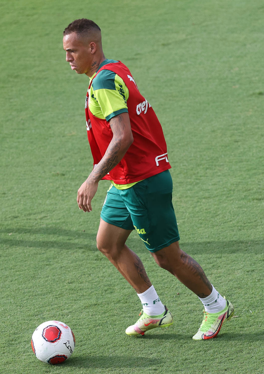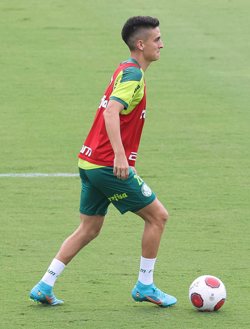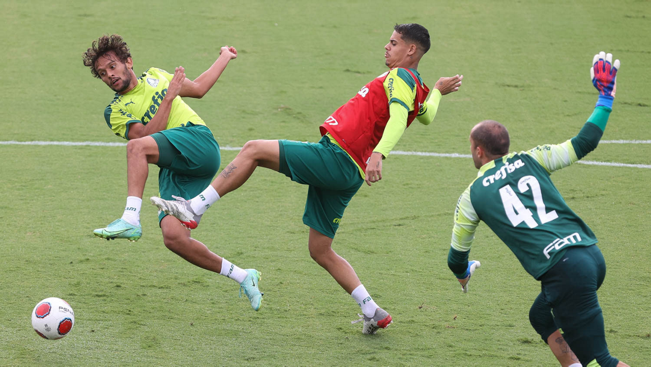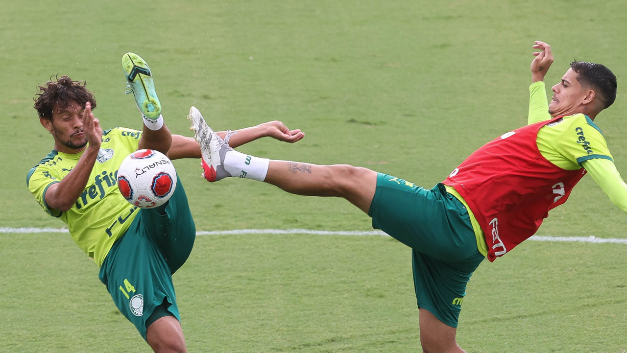 Os jogadores Lucas Freitas, Raphael Veiga, Marcos Rocha, Gabriel Veron, Naves, Mateus, Eduard Atuesta (E/D em pé) e Breno Lopes, Gabriel Silva, Dudu, Mayke, Jailson, Garcia, Marcelo Lomba e Rony (E/D agachados), da SE Palmeiras, durante treinamento, na Academia de Futebol. (Foto: Cesar Greco)