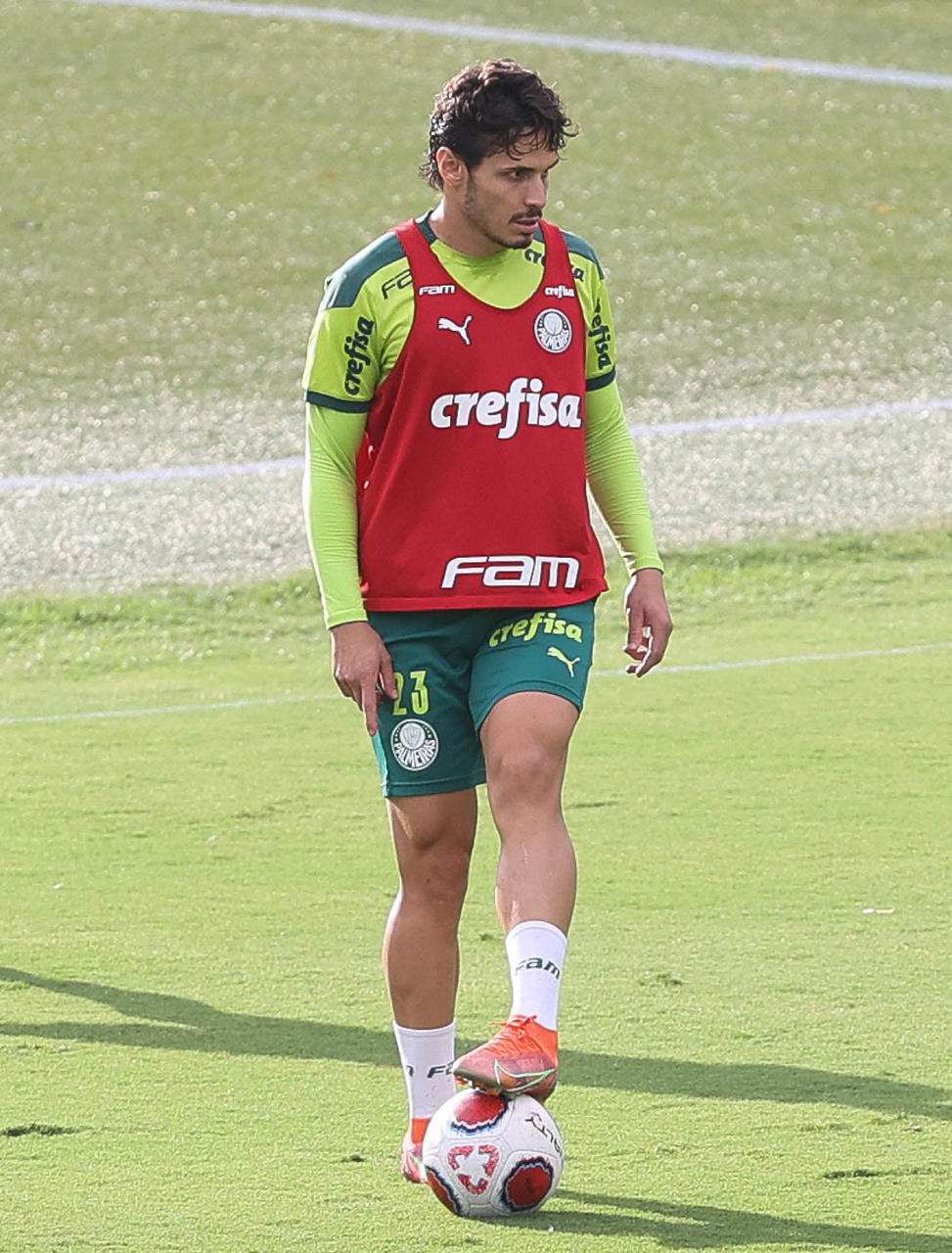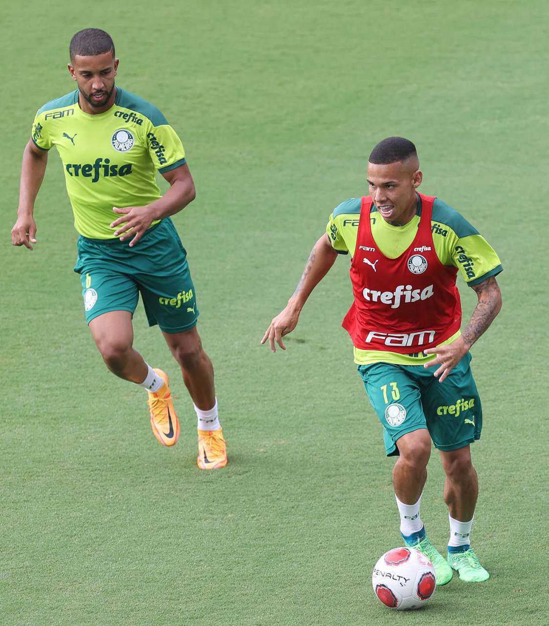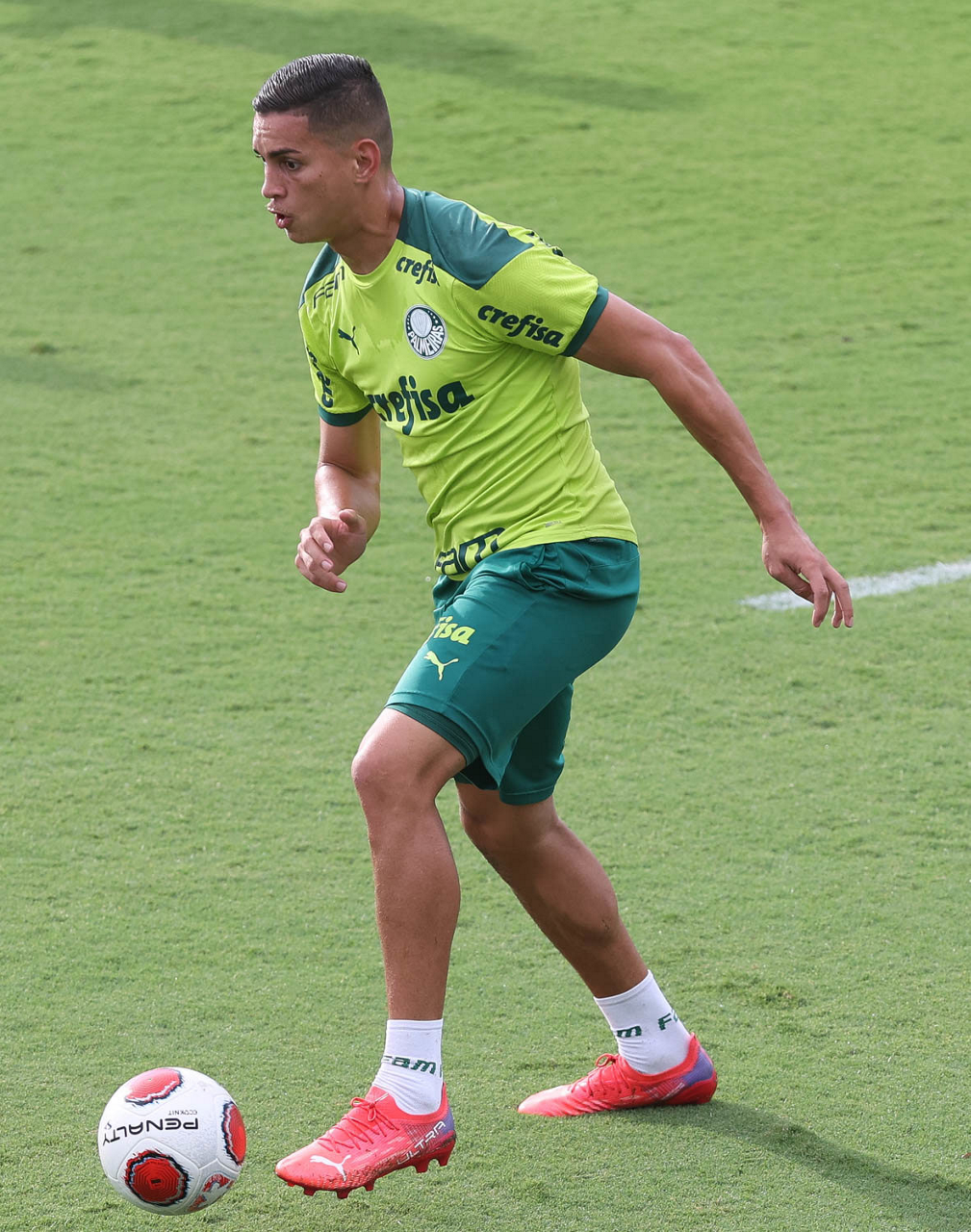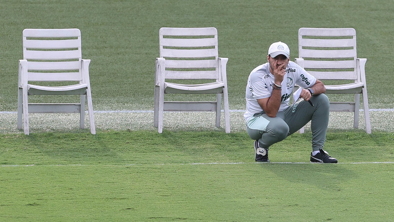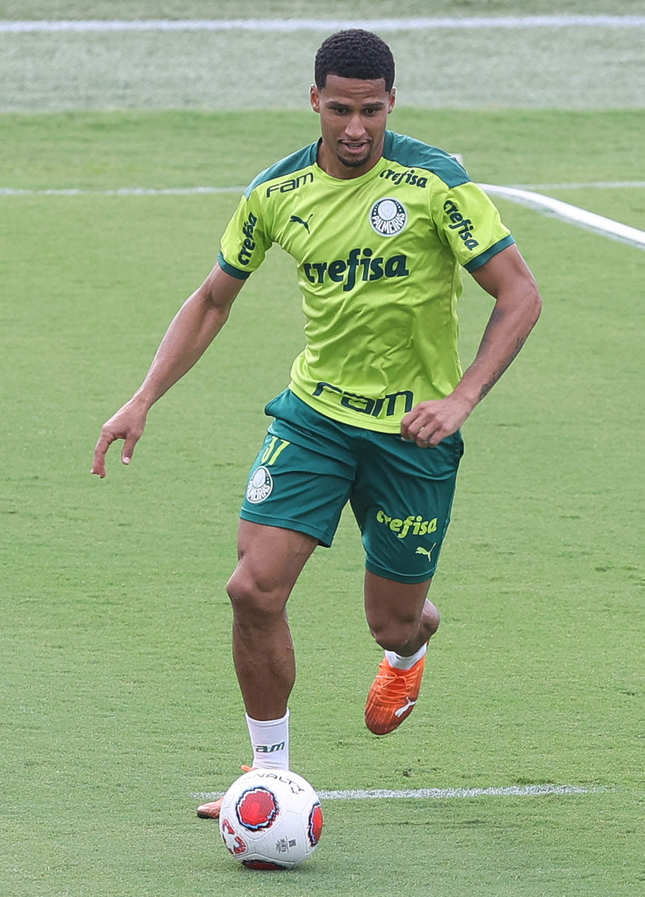 Os jogadores Lucas Freitas, Raphael Veiga, Marcos Rocha, Gabriel Veron, Naves, Mateus, Eduard Atuesta (E/D em pé) e Breno Lopes, Gabriel Silva, Dudu, Mayke, Jailson, Garcia, Marcelo Lomba e Rony (E/D agachados), da SE Palmeiras, durante treinamento, na Academia de Futebol. (Foto: Cesar Greco)