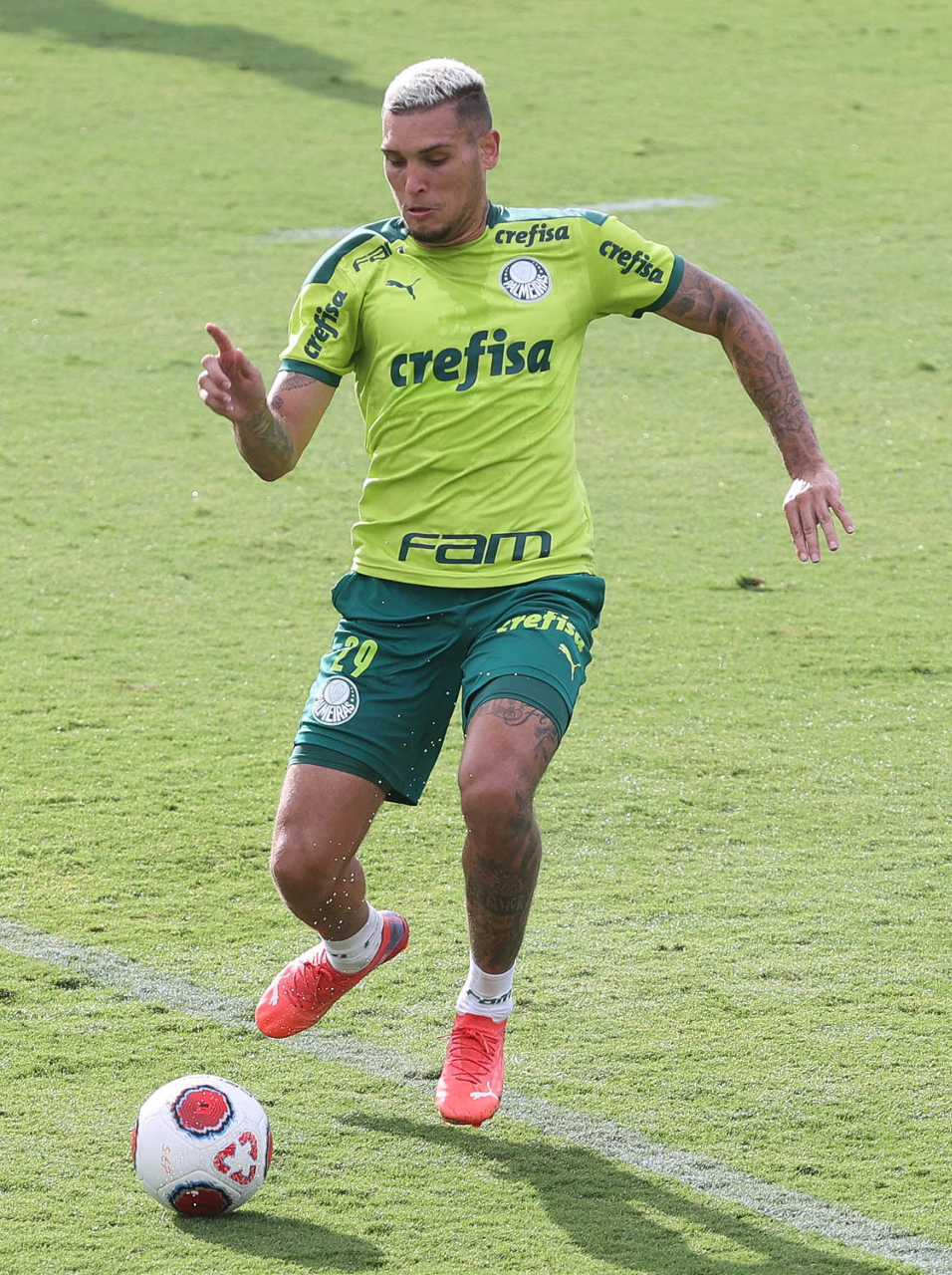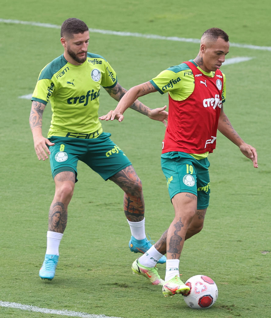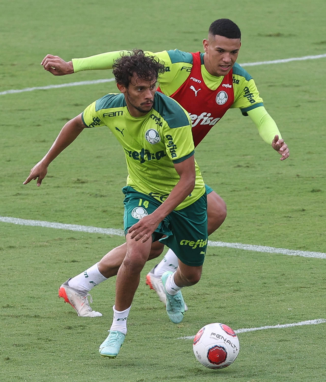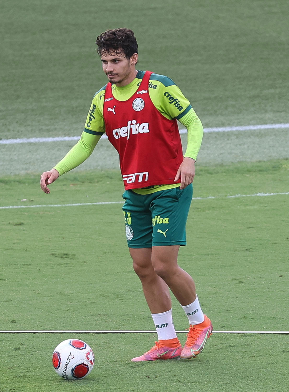 Os jogadores Lucas Freitas, Raphael Veiga, Marcos Rocha, Gabriel Veron, Naves, Mateus, Eduard Atuesta (E/D em pé) e Breno Lopes, Gabriel Silva, Dudu, Mayke, Jailson, Garcia, Marcelo Lomba e Rony (E/D agachados), da SE Palmeiras, durante treinamento, na Academia de Futebol. (Foto: Cesar Greco)