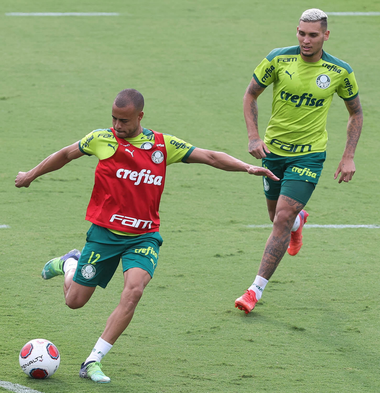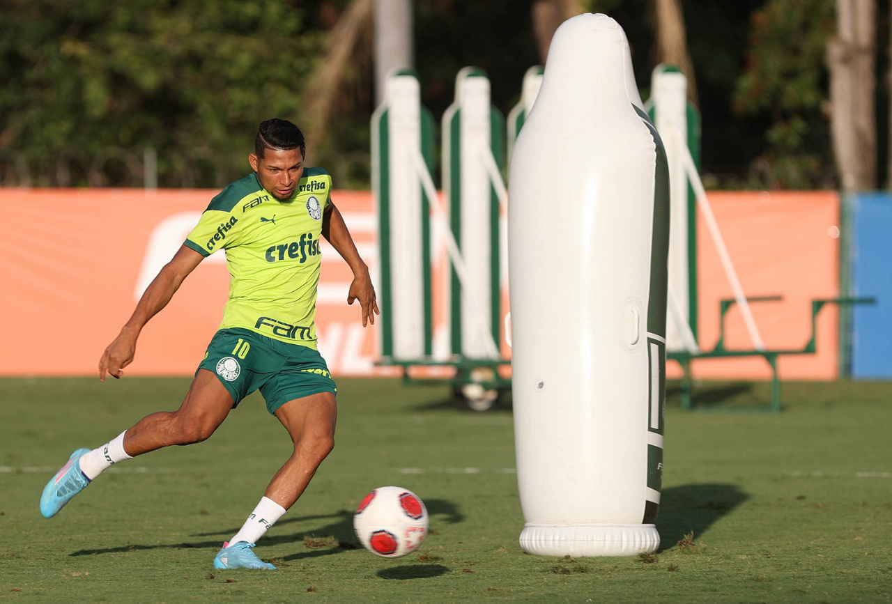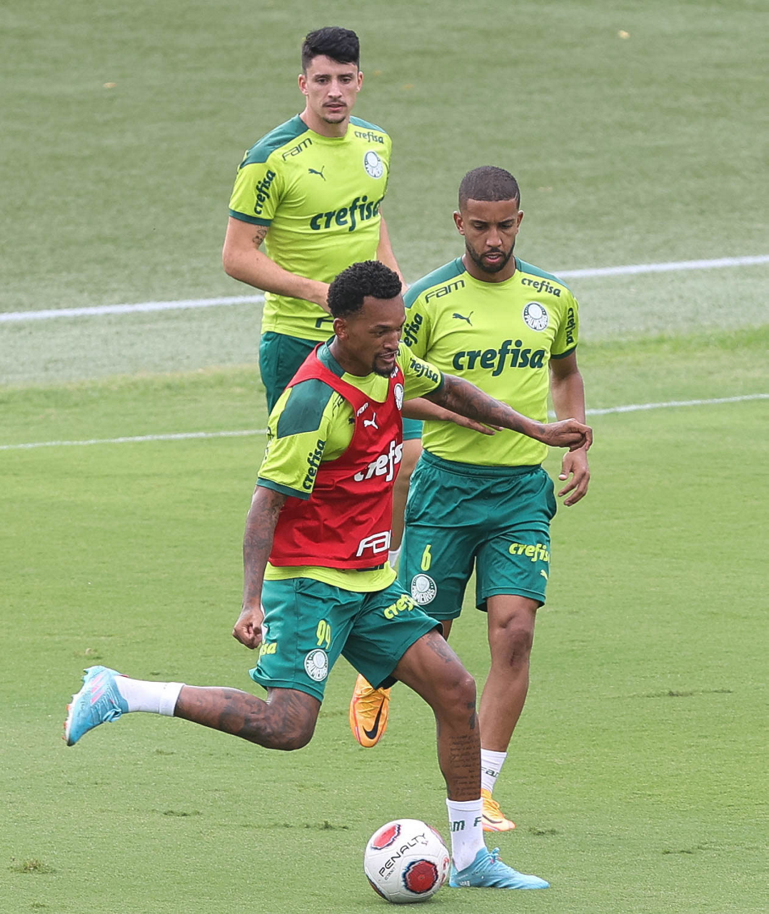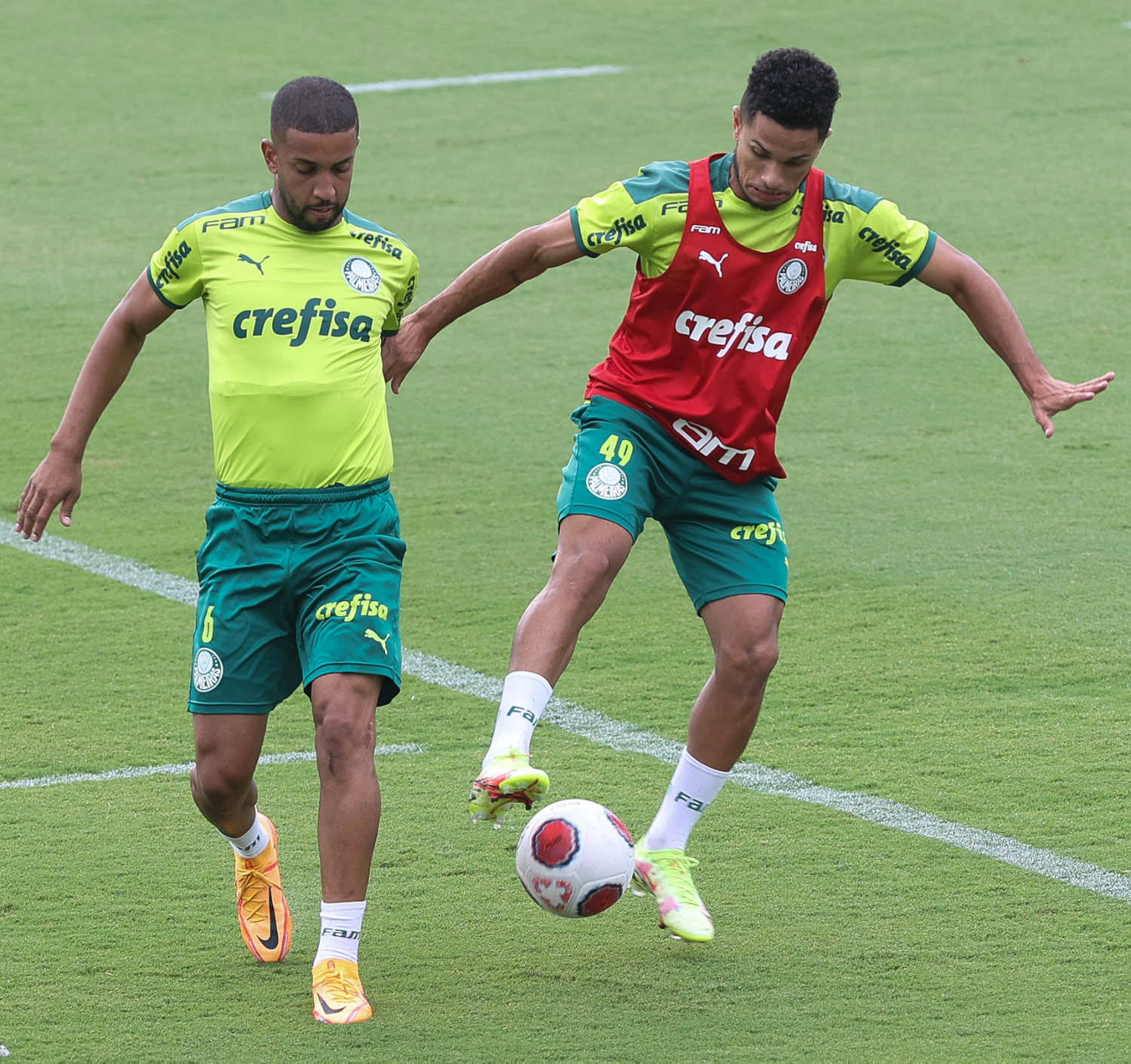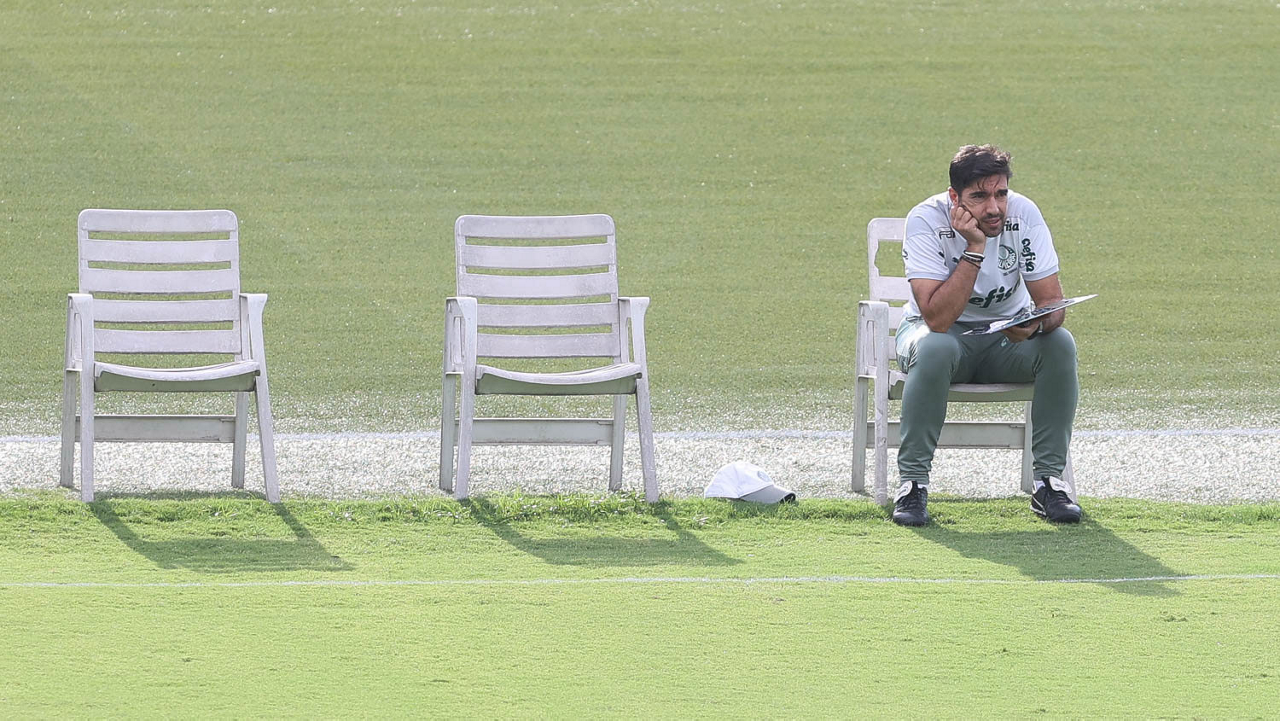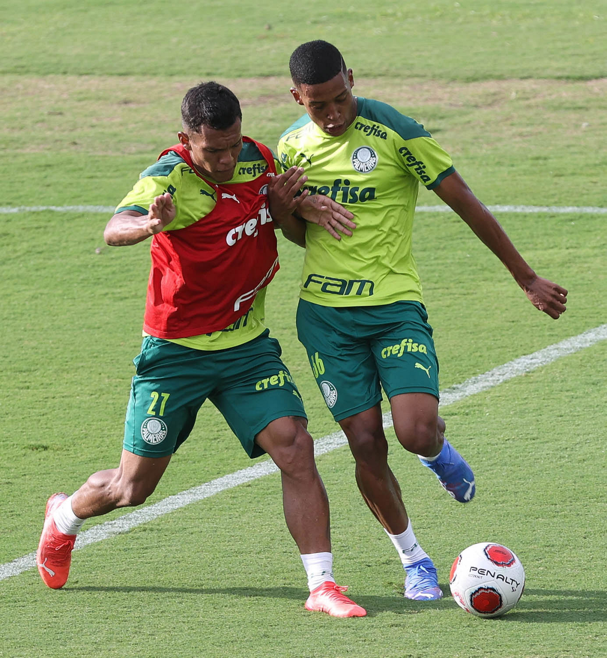 Os jogadores Lucas Freitas, Raphael Veiga, Marcos Rocha, Gabriel Veron, Naves, Mateus, Eduard Atuesta (E/D em pé) e Breno Lopes, Gabriel Silva, Dudu, Mayke, Jailson, Garcia, Marcelo Lomba e Rony (E/D agachados), da SE Palmeiras, durante treinamento, na Academia de Futebol. (Foto: Cesar Greco)