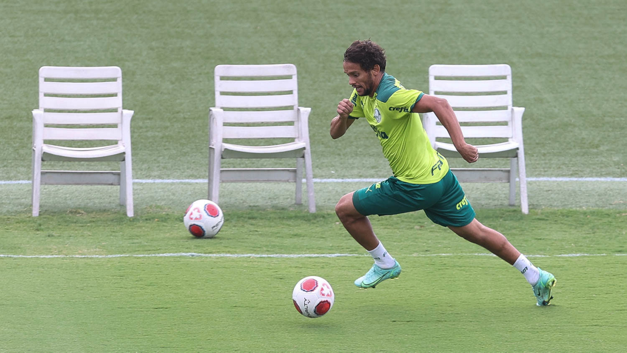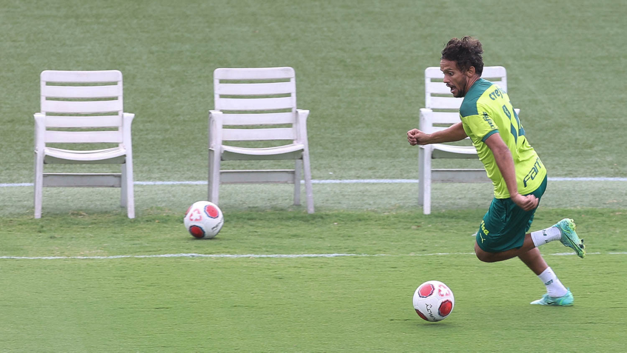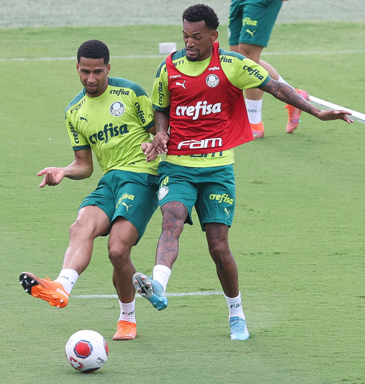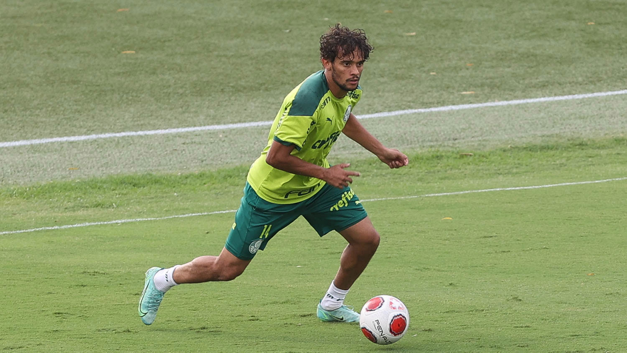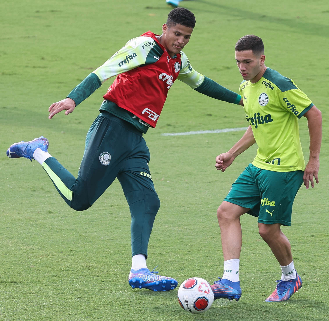 Os jogadores Lucas Freitas, Raphael Veiga, Marcos Rocha, Gabriel Veron, Naves, Mateus, Eduard Atuesta (E/D em pé) e Breno Lopes, Gabriel Silva, Dudu, Mayke, Jailson, Garcia, Marcelo Lomba e Rony (E/D agachados), da SE Palmeiras, durante treinamento, na Academia de Futebol. (Foto: Cesar Greco)