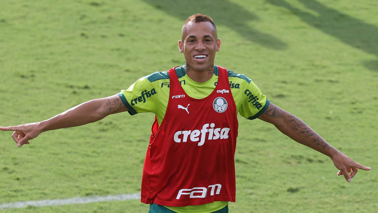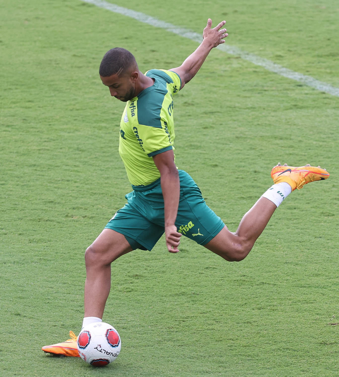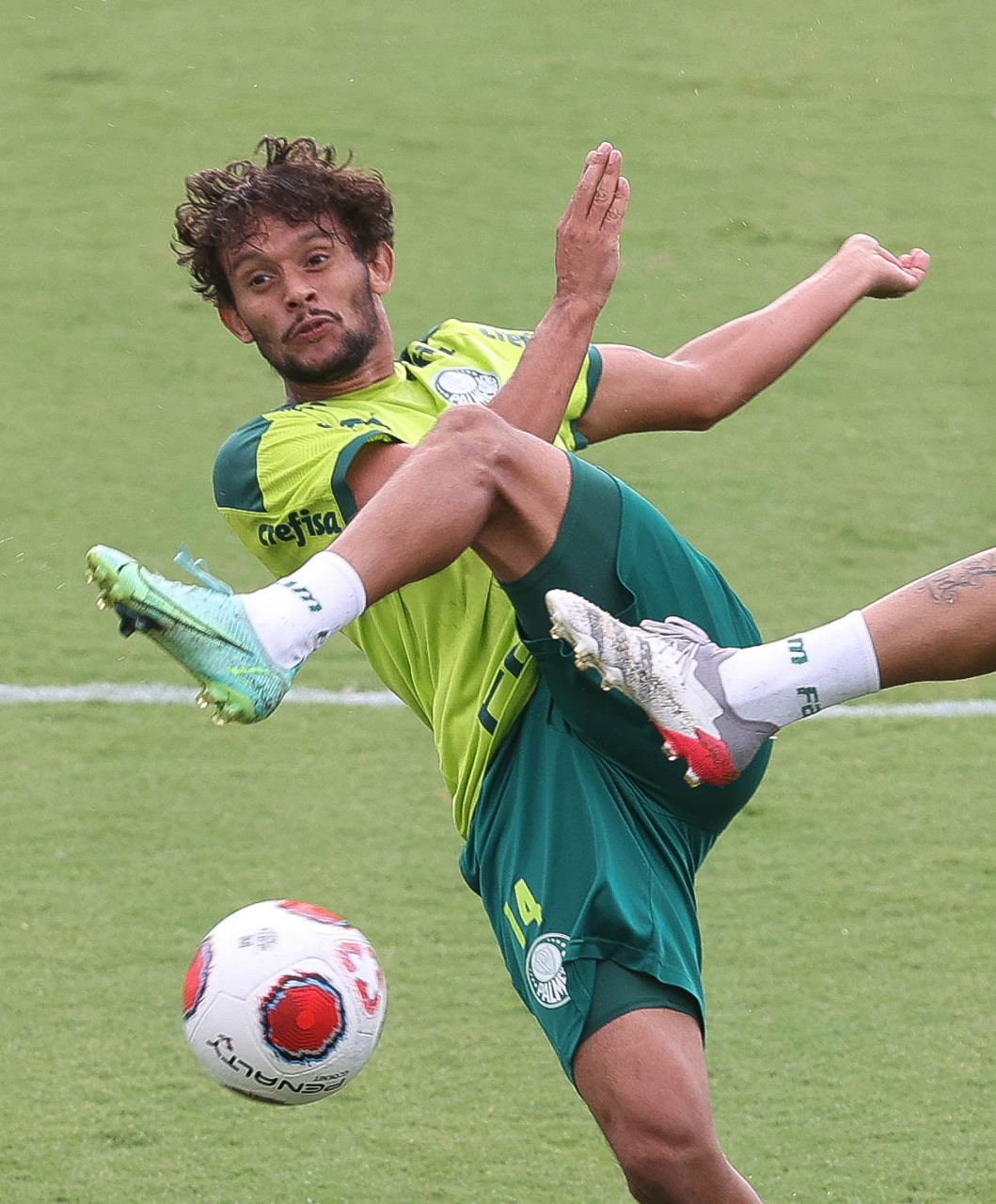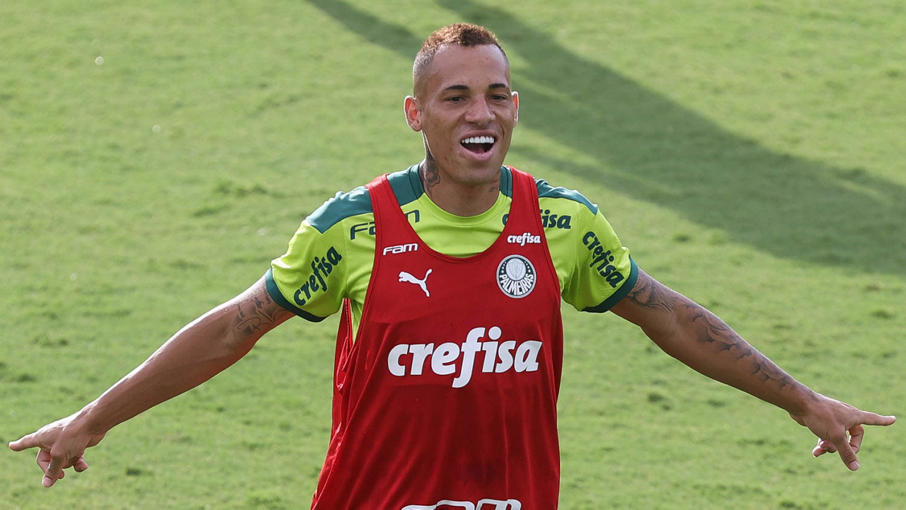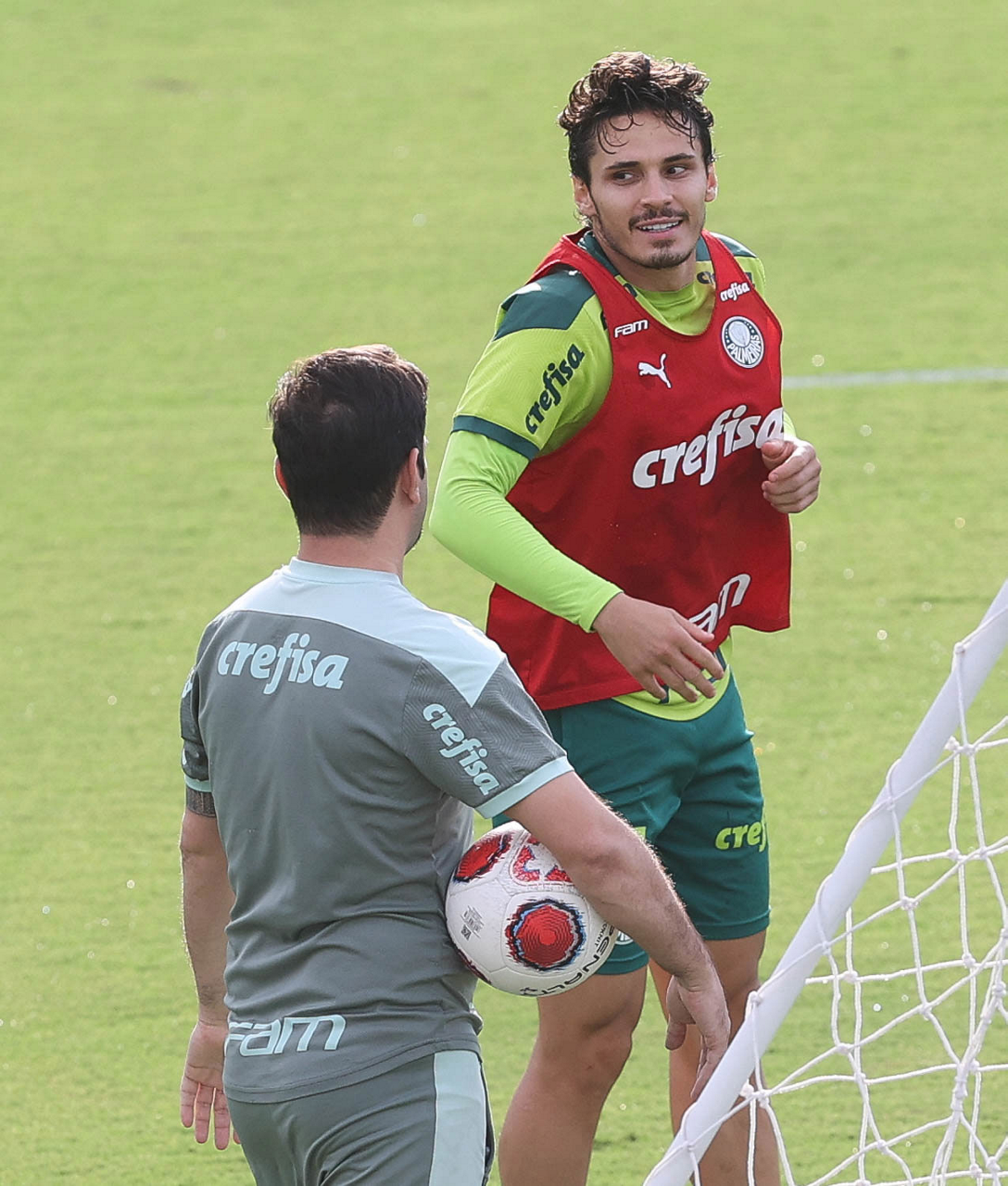 Os jogadores Lucas Freitas, Raphael Veiga, Marcos Rocha, Gabriel Veron, Naves, Mateus, Eduard Atuesta (E/D em pé) e Breno Lopes, Gabriel Silva, Dudu, Mayke, Jailson, Garcia, Marcelo Lomba e Rony (E/D agachados), da SE Palmeiras, durante treinamento, na Academia de Futebol. (Foto: Cesar Greco)
