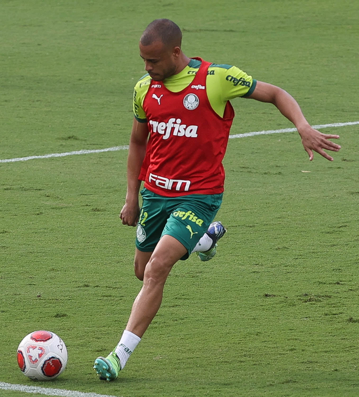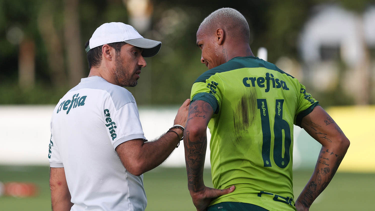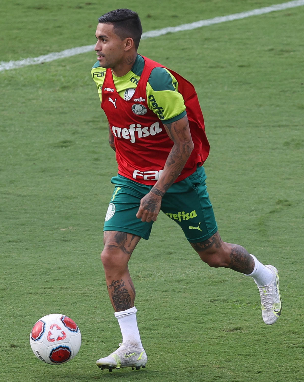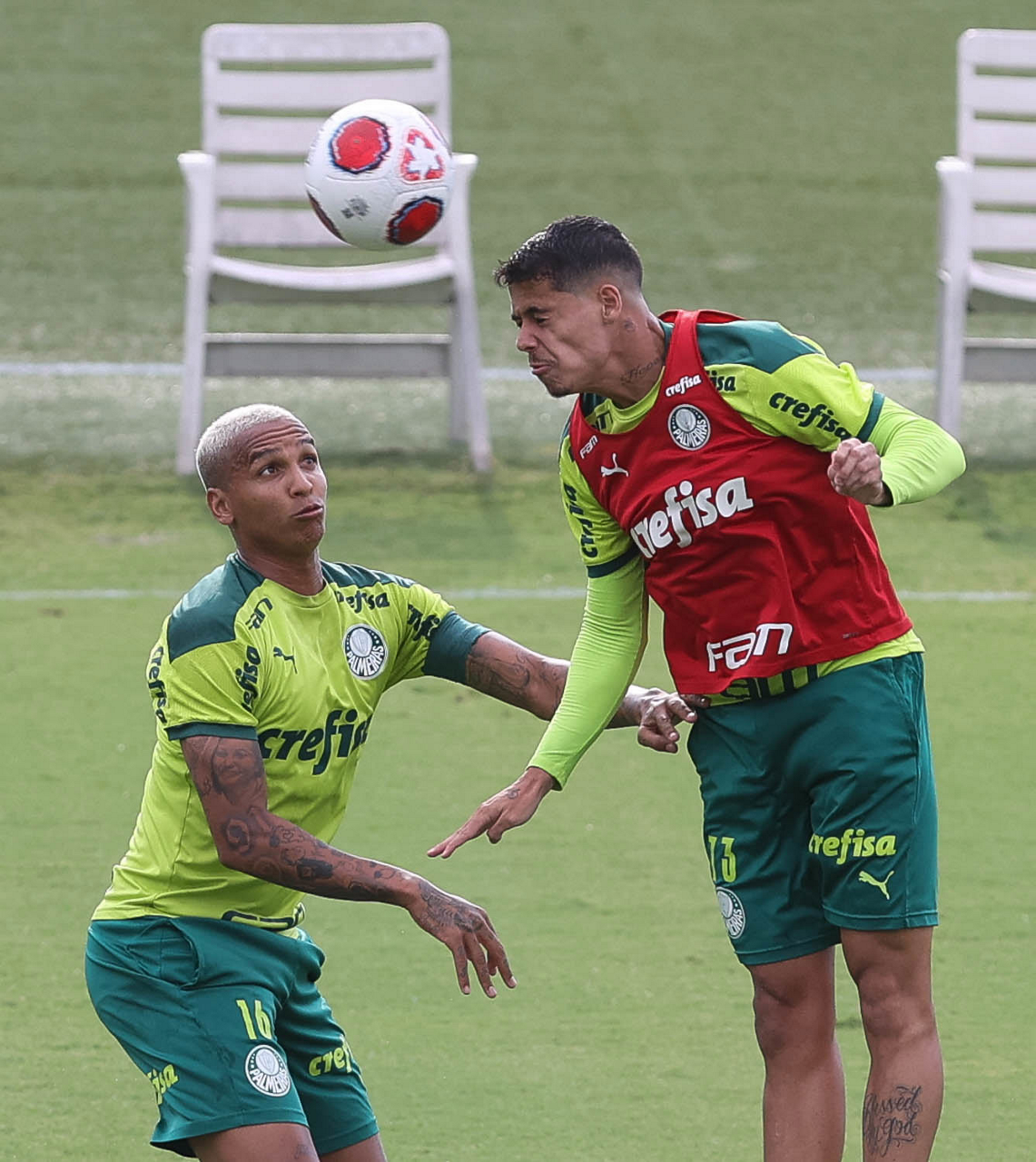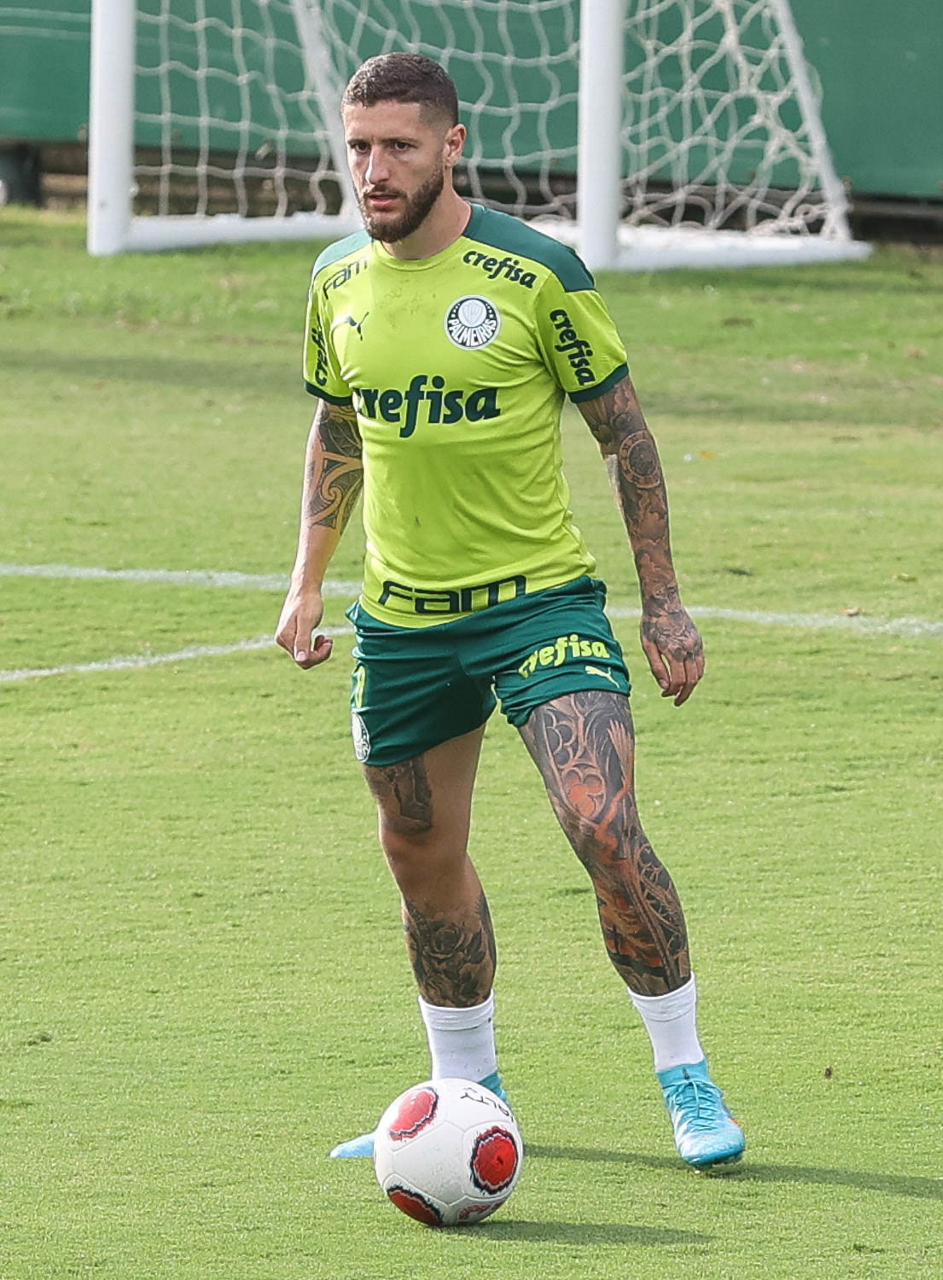 Os jogadores Lucas Freitas, Raphael Veiga, Marcos Rocha, Gabriel Veron, Naves, Mateus, Eduard Atuesta (E/D em pé) e Breno Lopes, Gabriel Silva, Dudu, Mayke, Jailson, Garcia, Marcelo Lomba e Rony (E/D agachados), da SE Palmeiras, durante treinamento, na Academia de Futebol. (Foto: Cesar Greco)