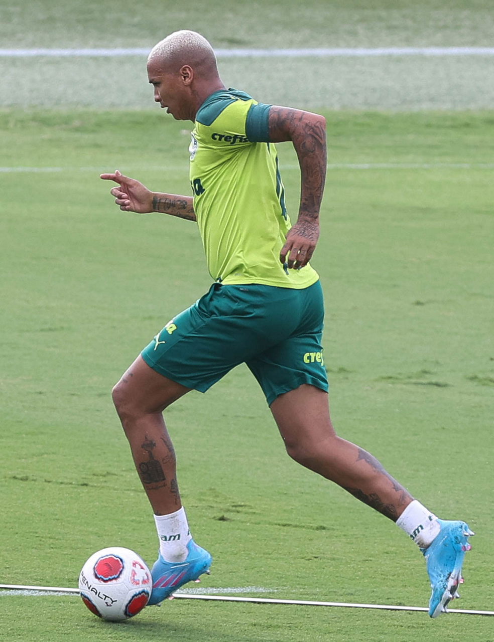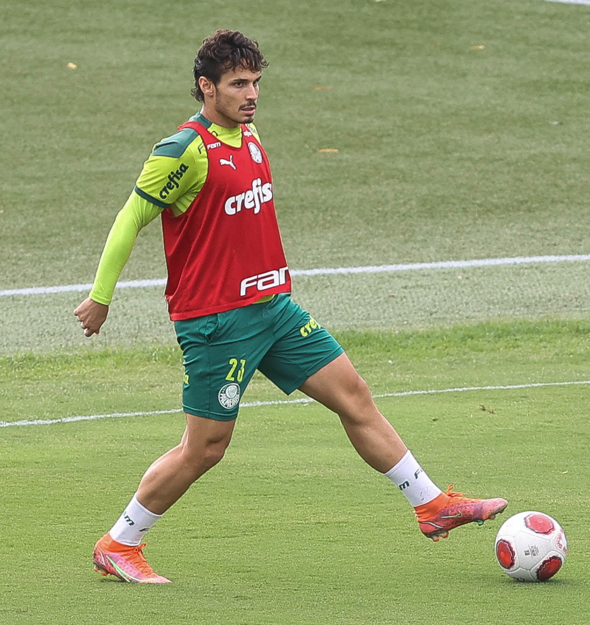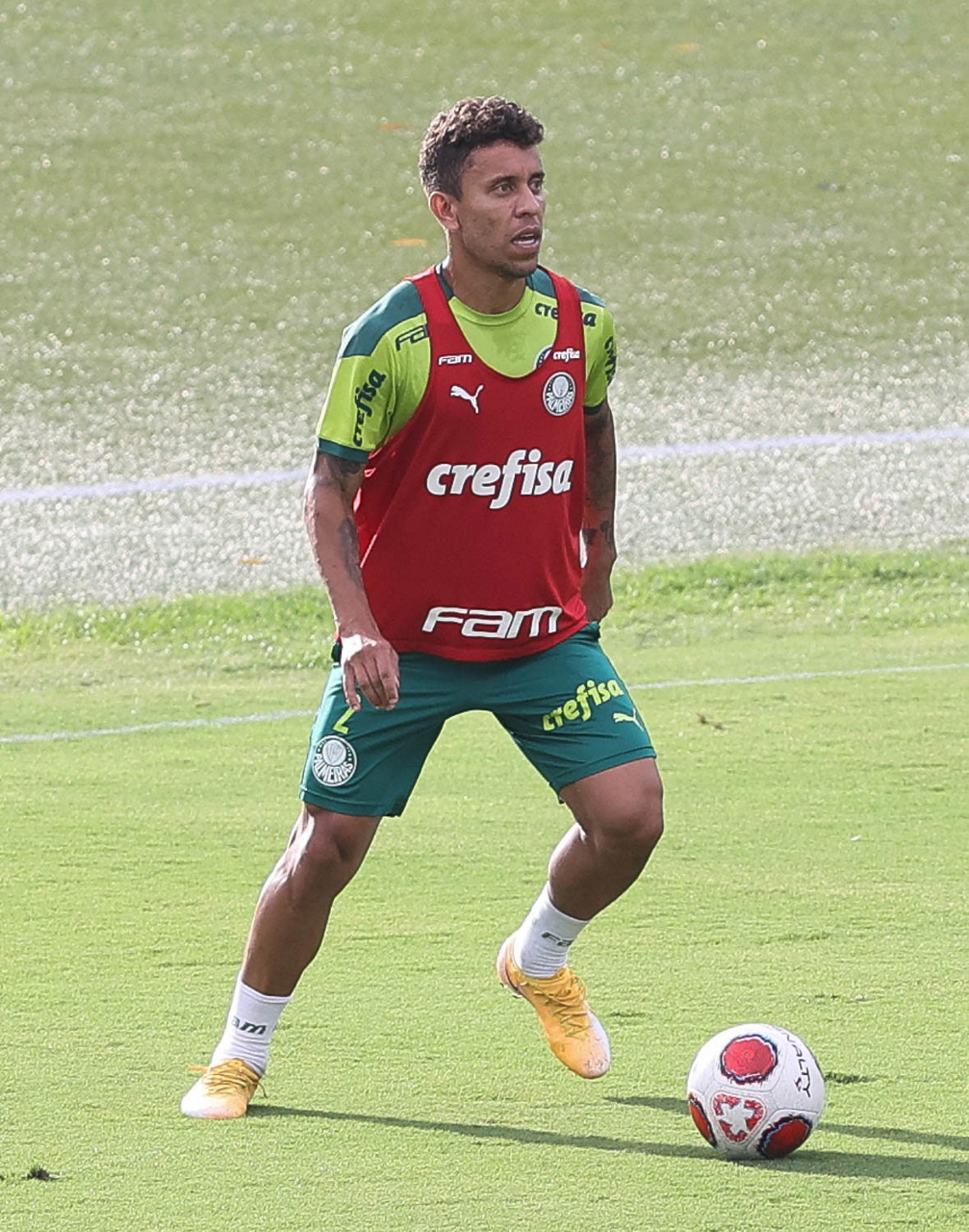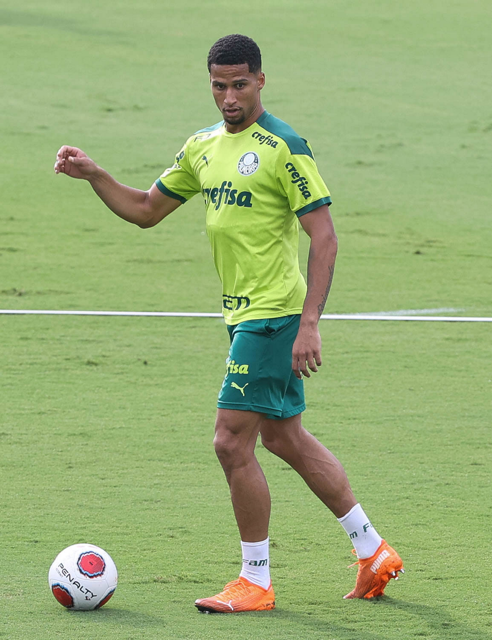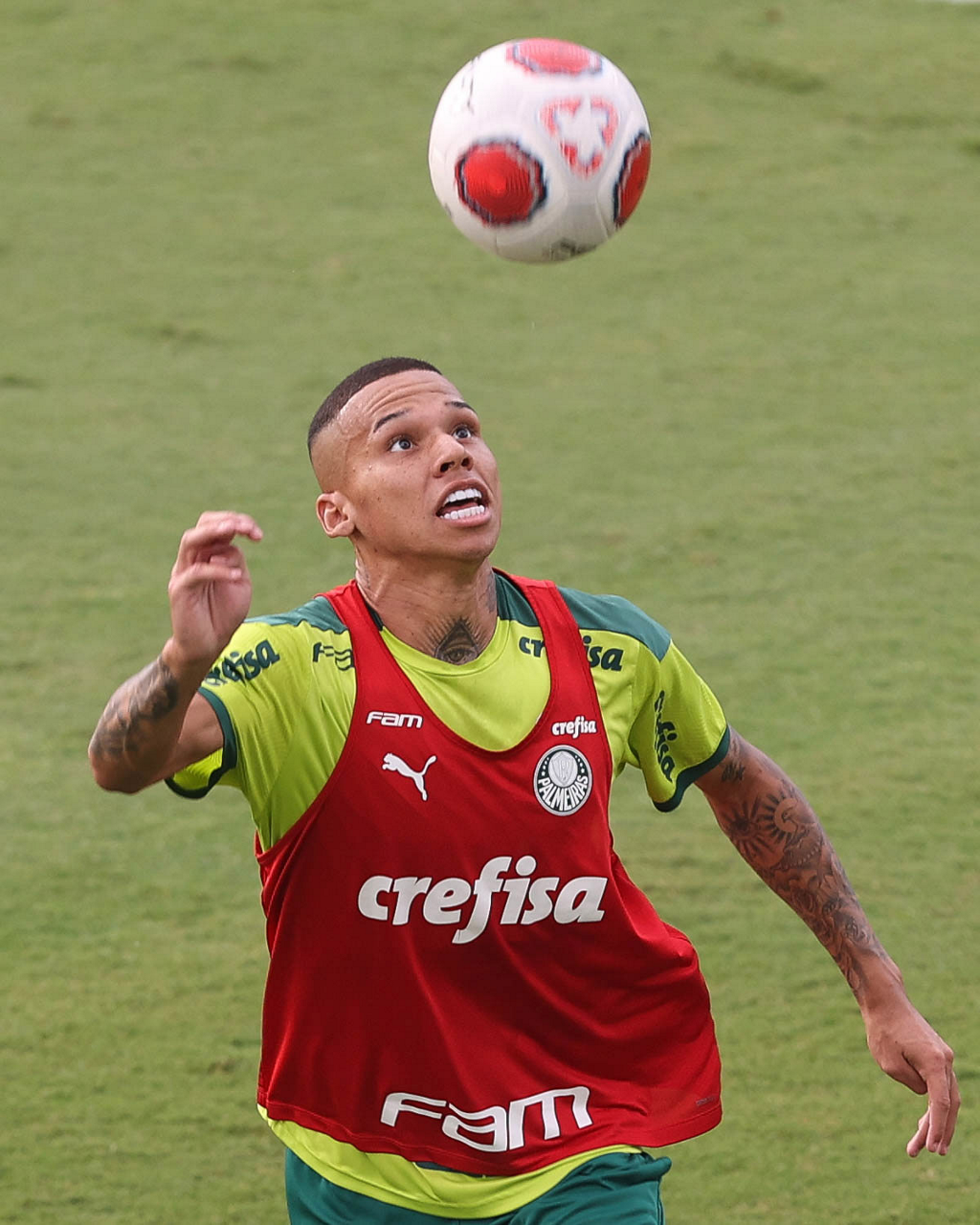 Os jogadores Lucas Freitas, Raphael Veiga, Marcos Rocha, Gabriel Veron, Naves, Mateus, Eduard Atuesta (E/D em pé) e Breno Lopes, Gabriel Silva, Dudu, Mayke, Jailson, Garcia, Marcelo Lomba e Rony (E/D agachados), da SE Palmeiras, durante treinamento, na Academia de Futebol. (Foto: Cesar Greco)
