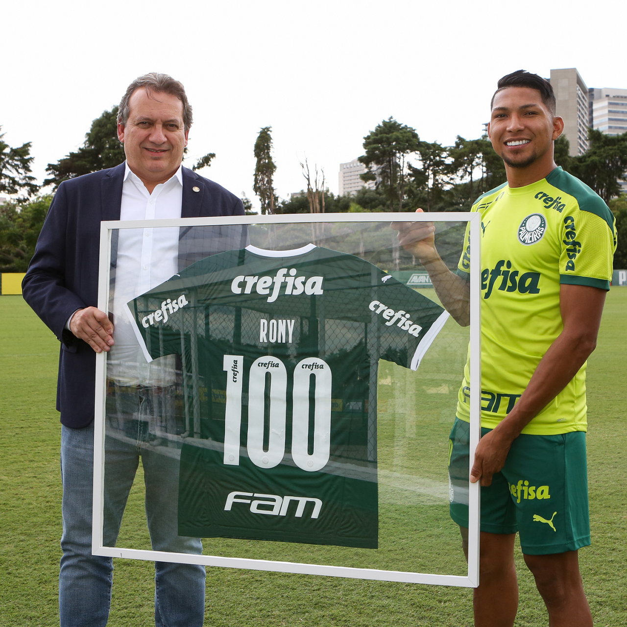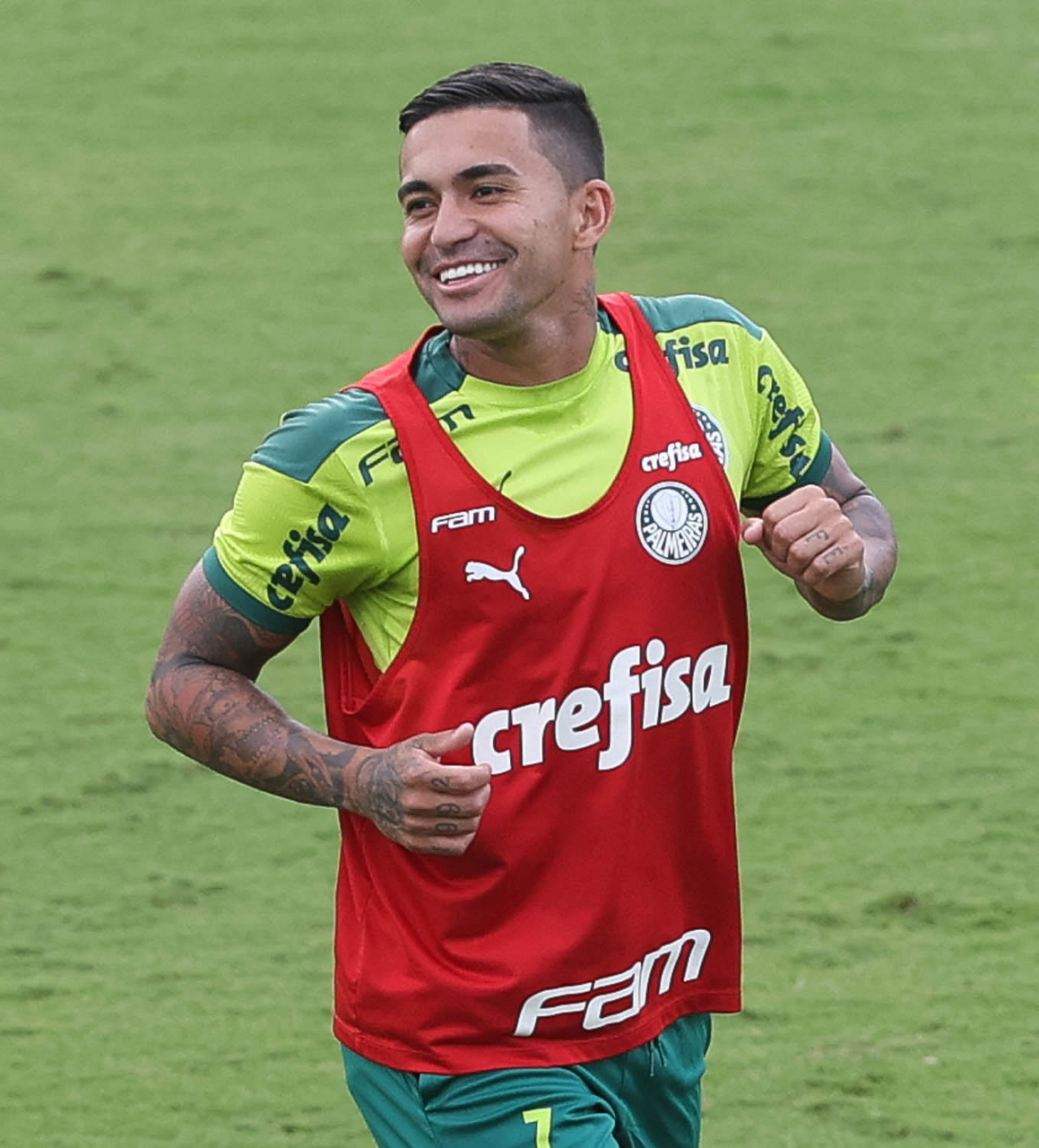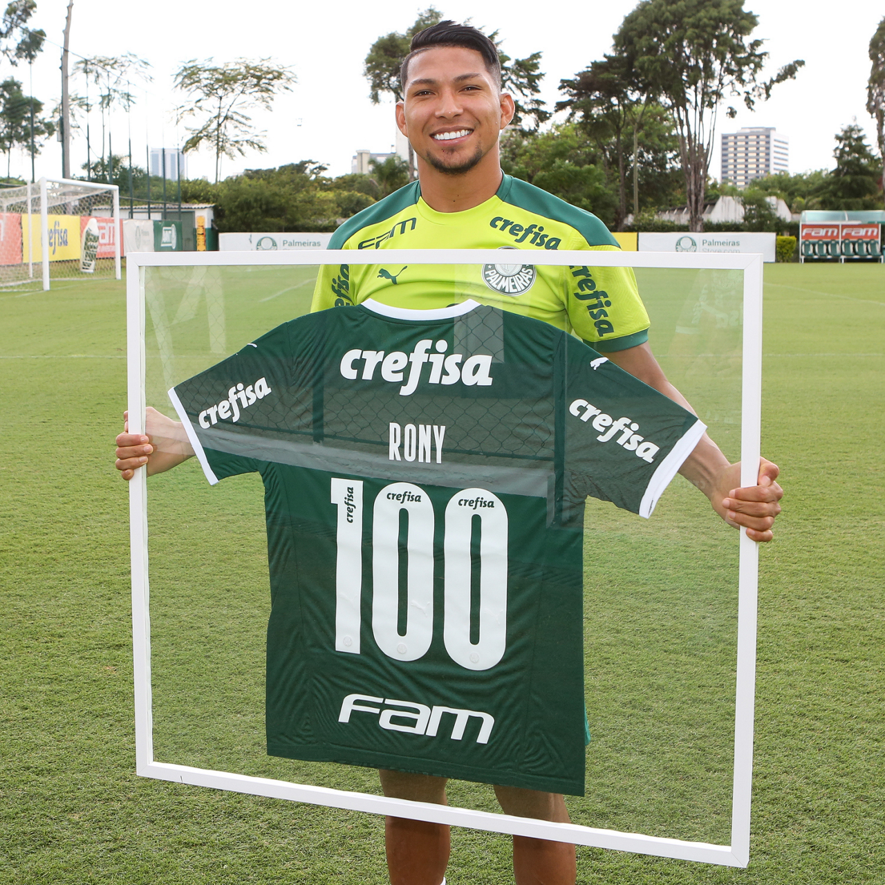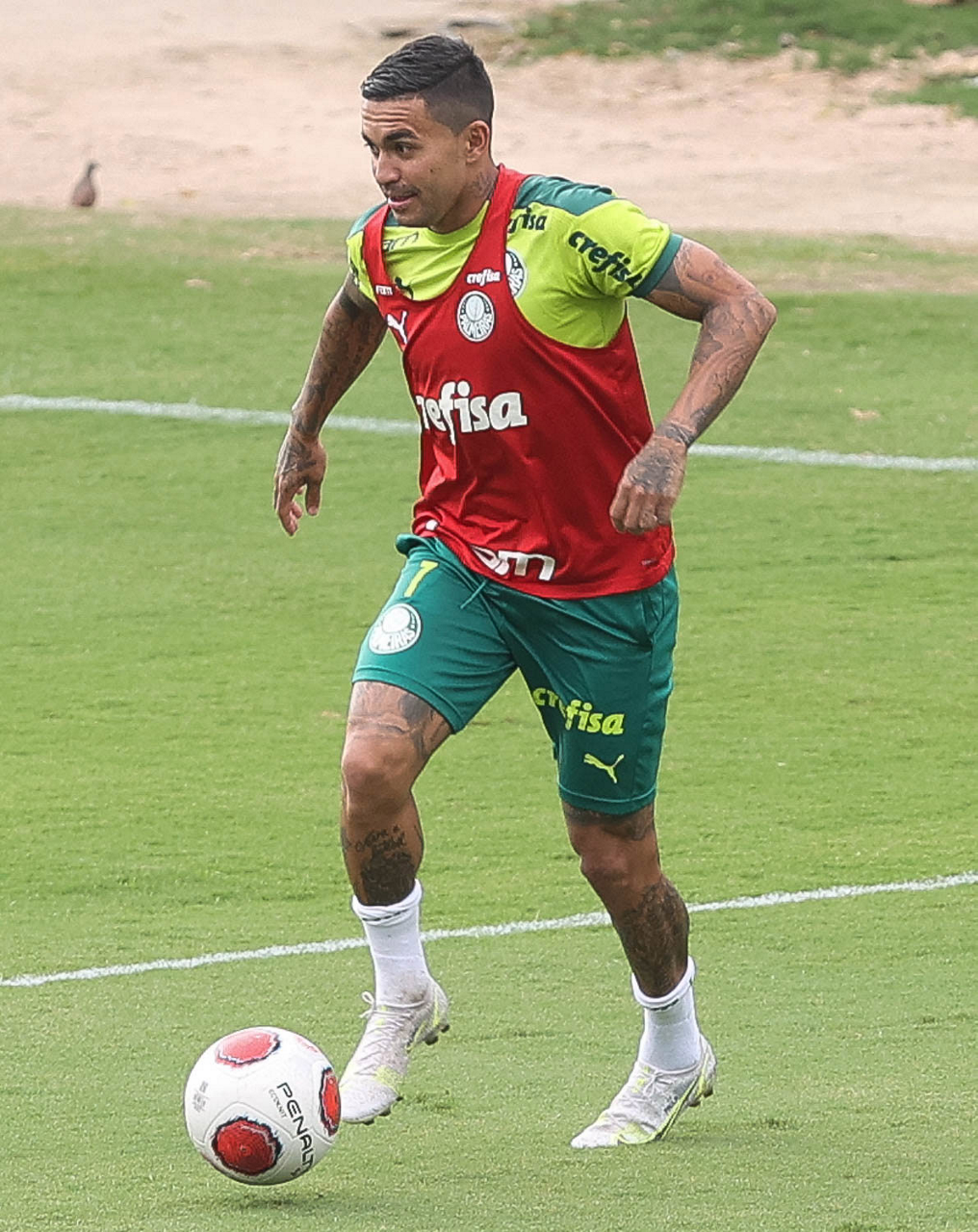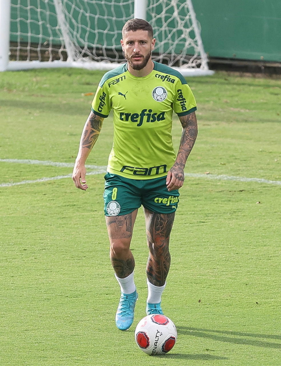 Os jogadores Lucas Freitas, Raphael Veiga, Marcos Rocha, Gabriel Veron, Naves, Mateus, Eduard Atuesta (E/D em pé) e Breno Lopes, Gabriel Silva, Dudu, Mayke, Jailson, Garcia, Marcelo Lomba e Rony (E/D agachados), da SE Palmeiras, durante treinamento, na Academia de Futebol. (Foto: Cesar Greco)
