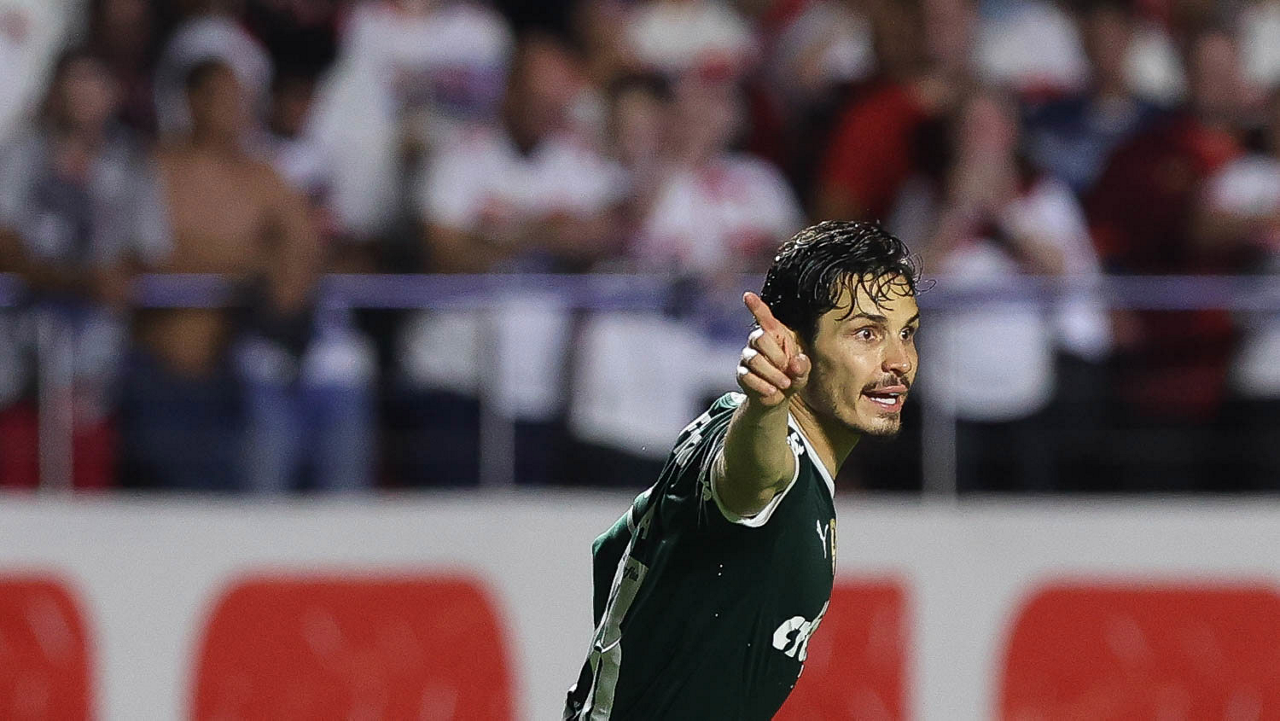 O jogador Raphael Veiga, da SE Palmeiras, comemora seu gol contra a equipe do São Paulo FC, durante partida válida pela final, ida, do Campeonato Paulista, Série A1, no Estádio do Morumbi. (Foto: Cesar Greco)