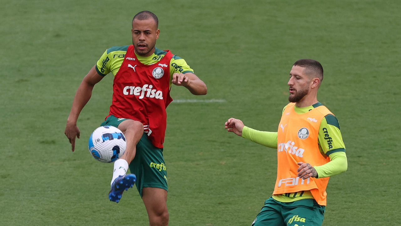 Os jogadores Raphael Veiga e Mayke (D), da SE Palmeiras, durante treinamento, na Academia de Futebol. (Foto: Cesar Greco)