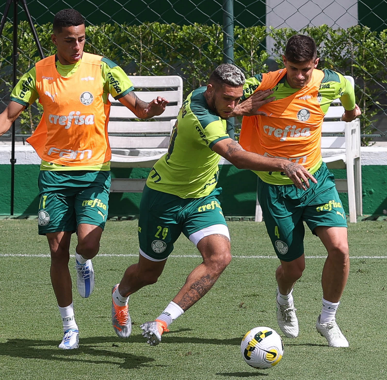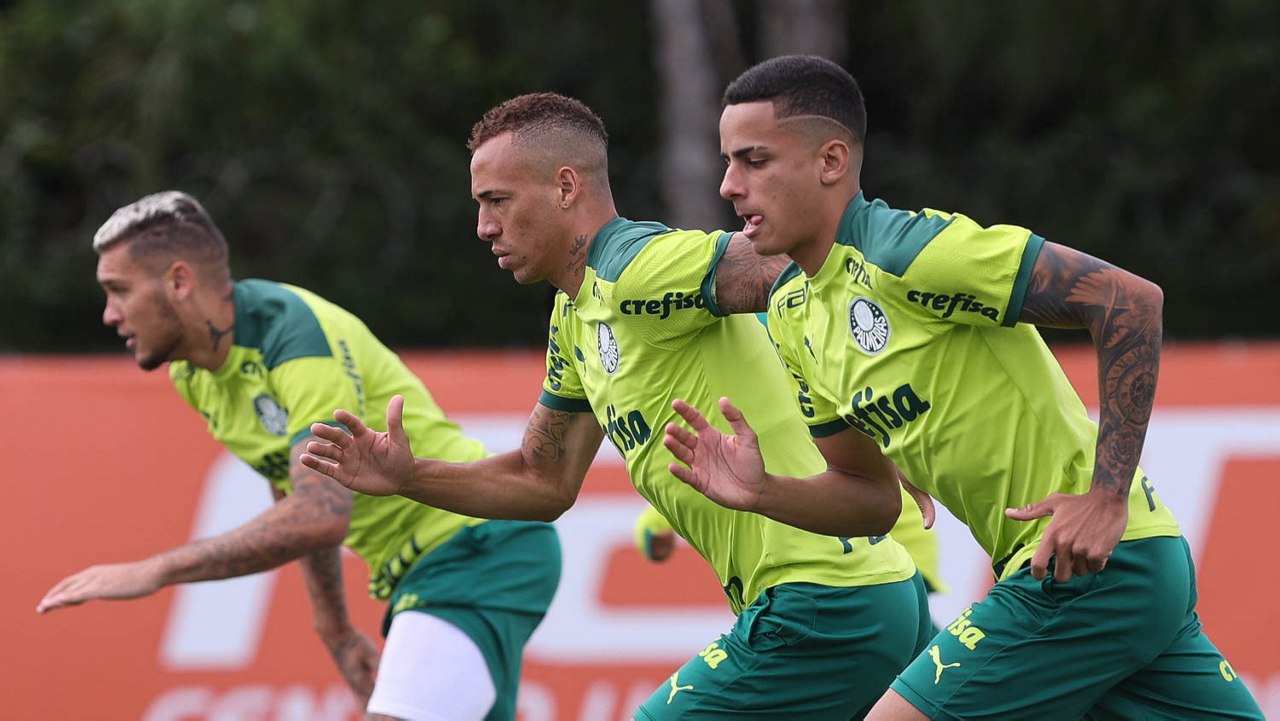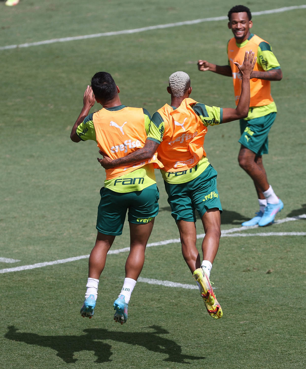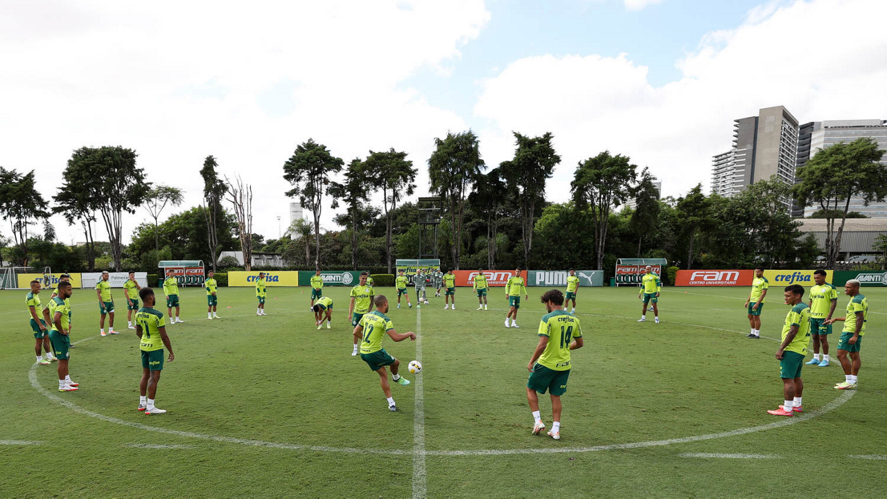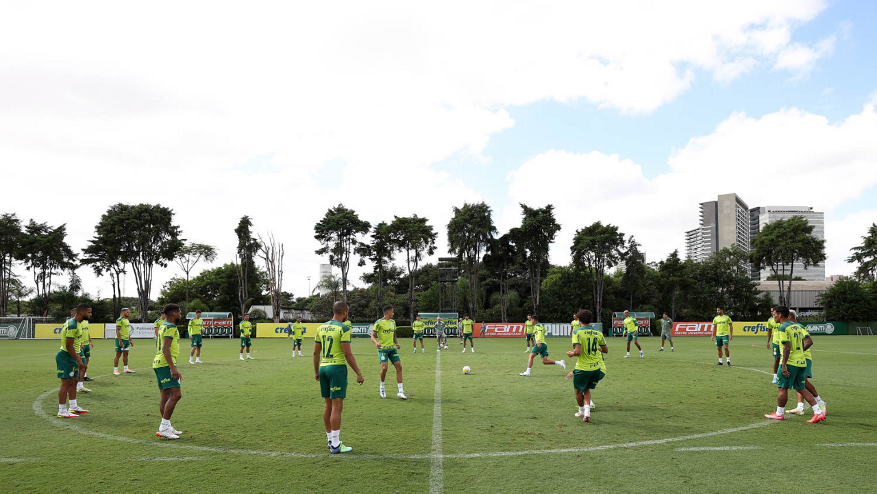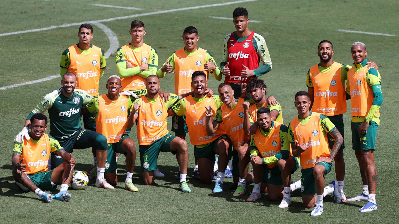 Os jogadores Lucas Freitas, Benjamín Kuscevic, Pedro Bicalho, Mateus, Jorge e Deyverson (E/D em pé) e Jailson, Weverton, Danilo, Mayke, Gabriel Menino, Breno Lopes, Gustavo Scarpa, Rony e Giovani (E/D agachados), da SE Palmeiras, durante treinamento, na Academia de Futebol. (Foto: Cesar Greco)