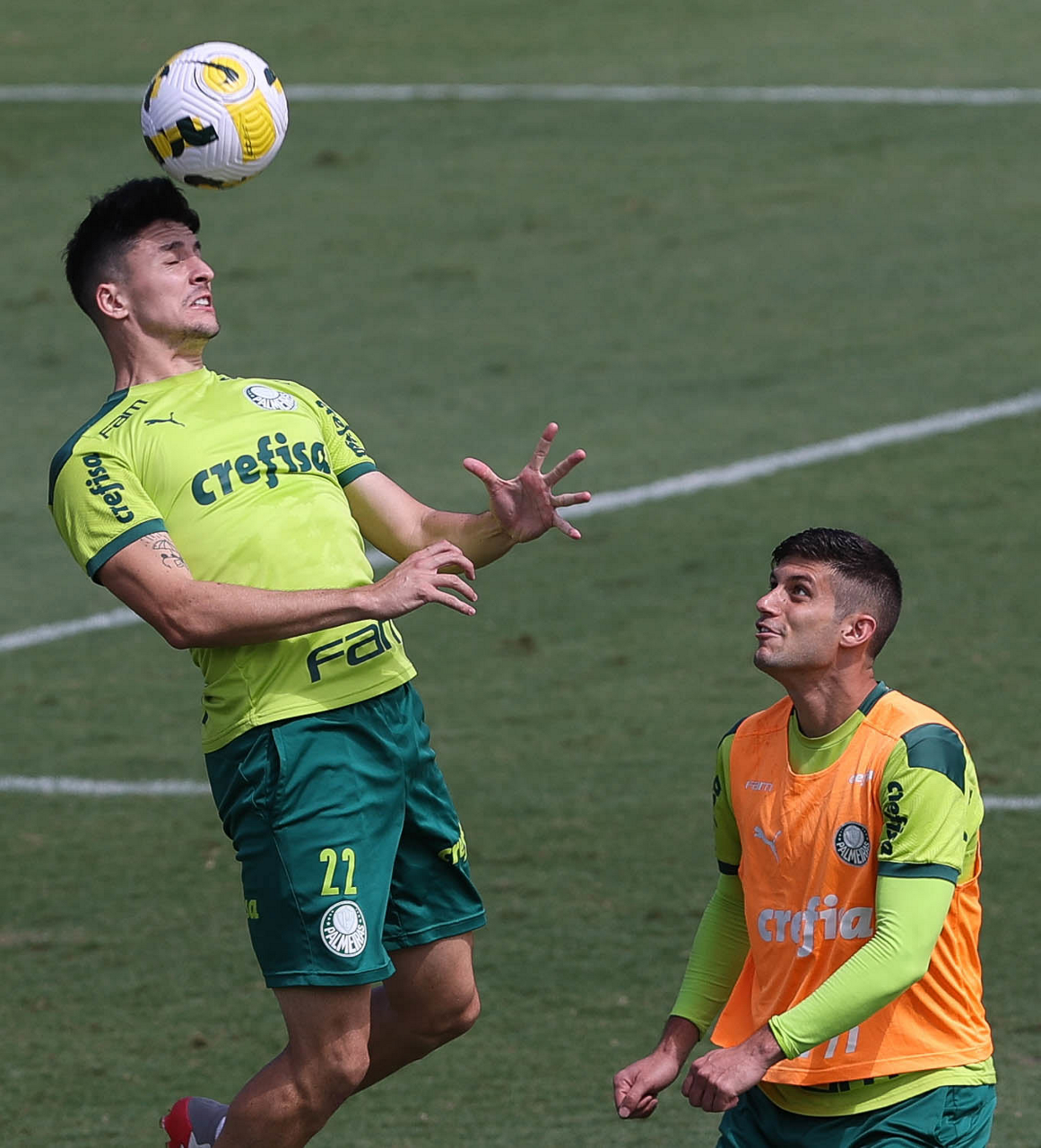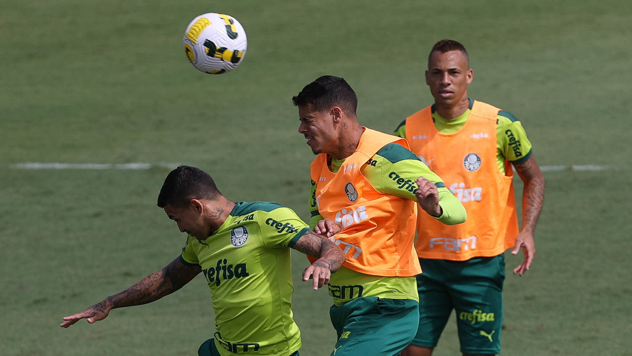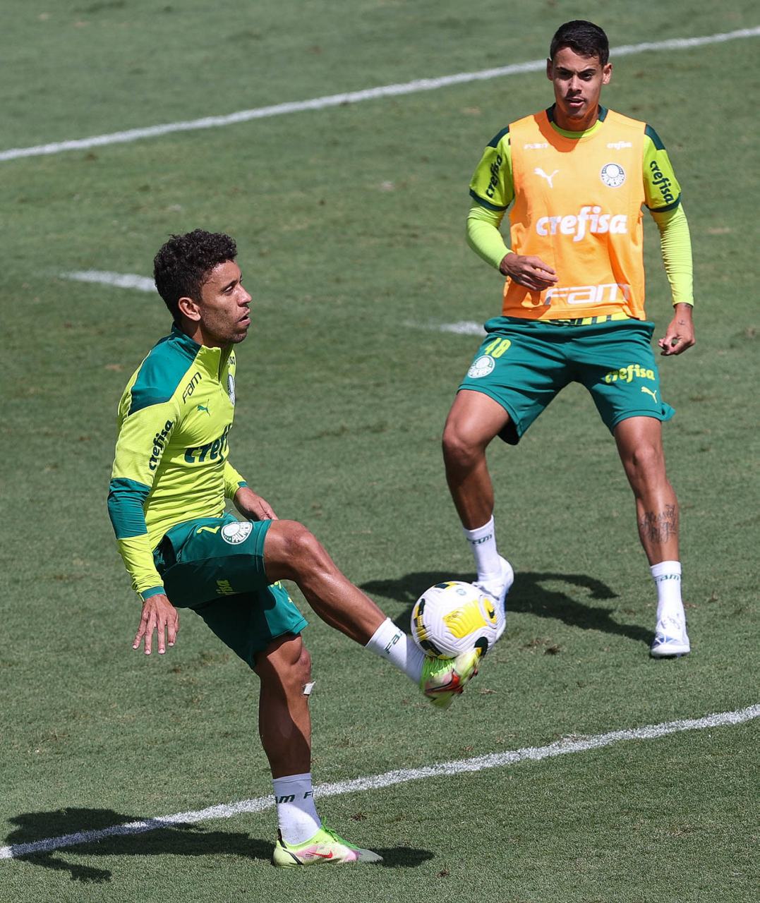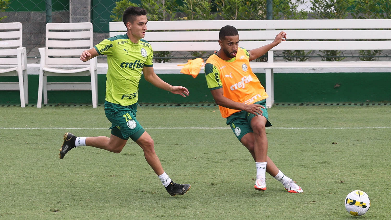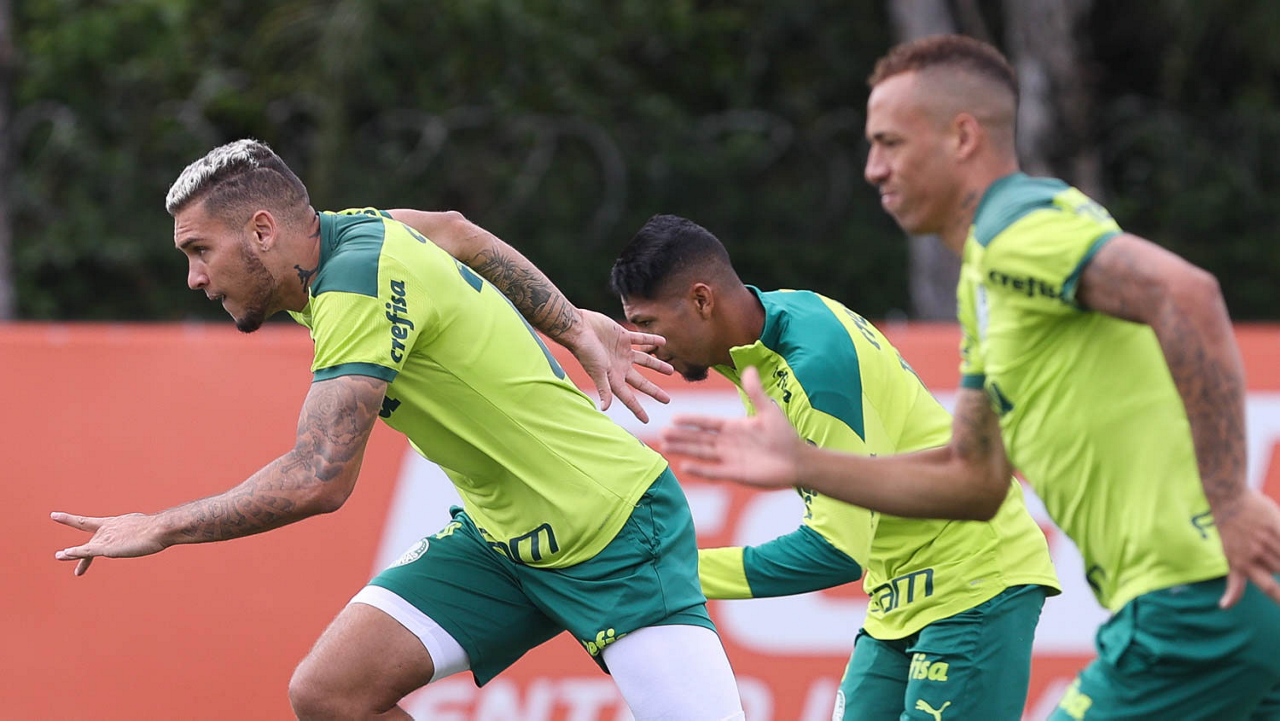 Os jogadores Lucas Freitas, Benjamín Kuscevic, Pedro Bicalho, Mateus, Jorge e Deyverson (E/D em pé) e Jailson, Weverton, Danilo, Mayke, Gabriel Menino, Breno Lopes, Gustavo Scarpa, Rony e Giovani (E/D agachados), da SE Palmeiras, durante treinamento, na Academia de Futebol. (Foto: Cesar Greco)