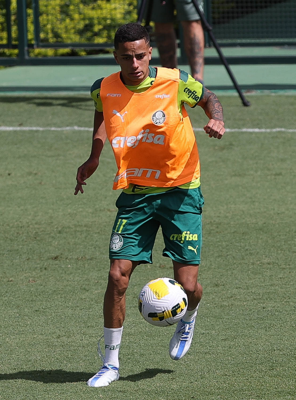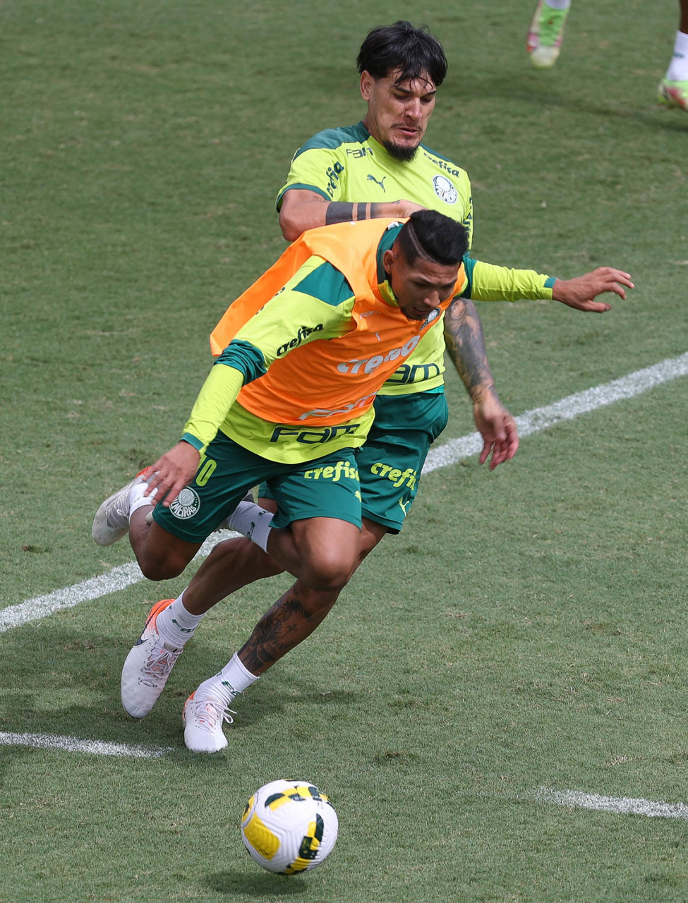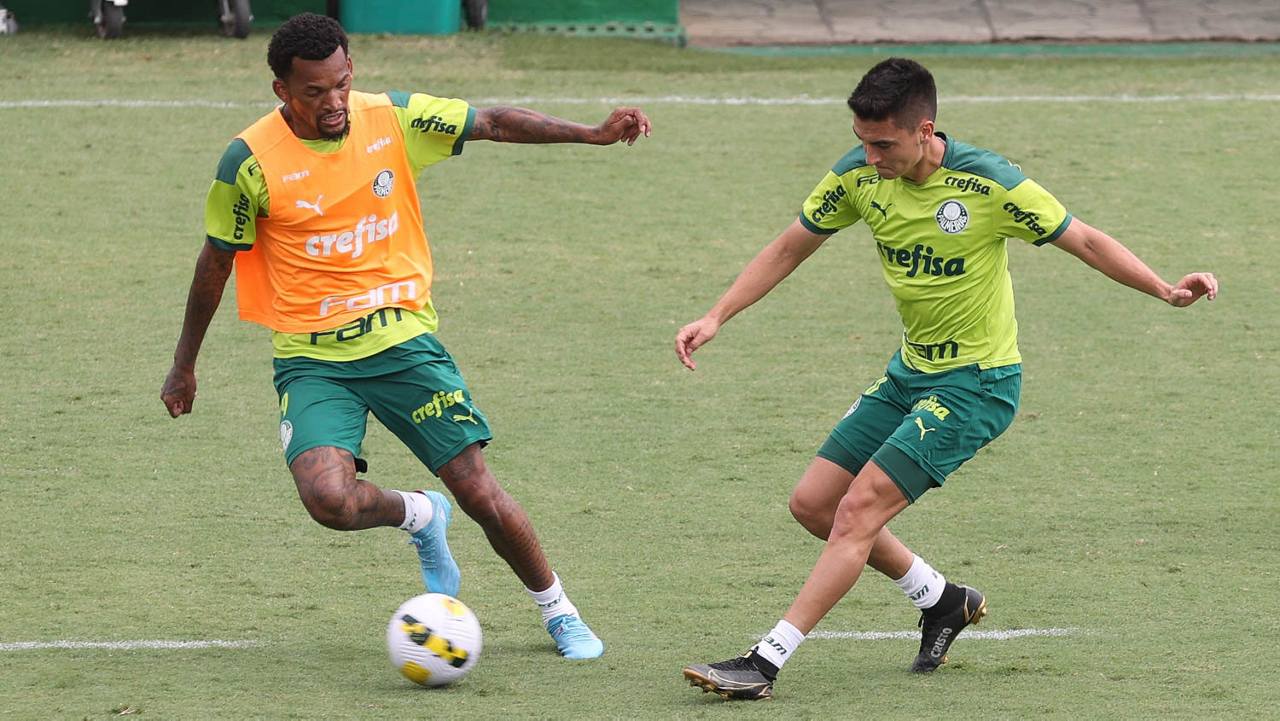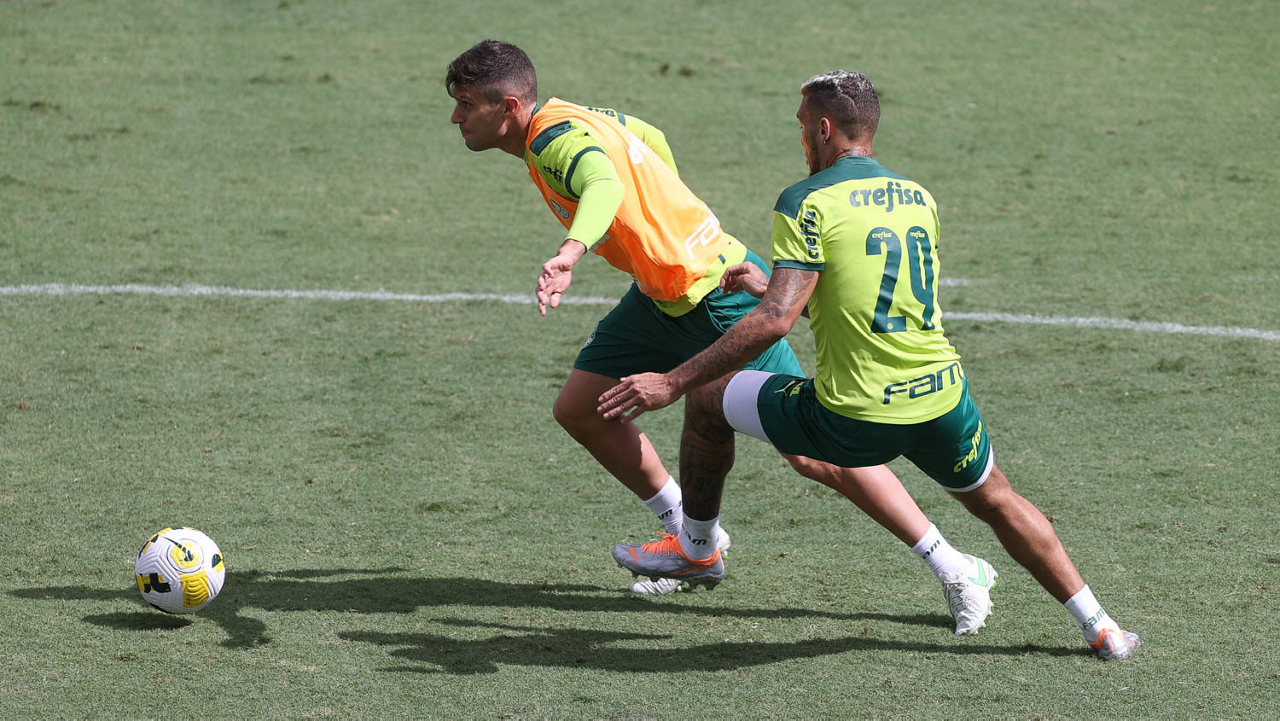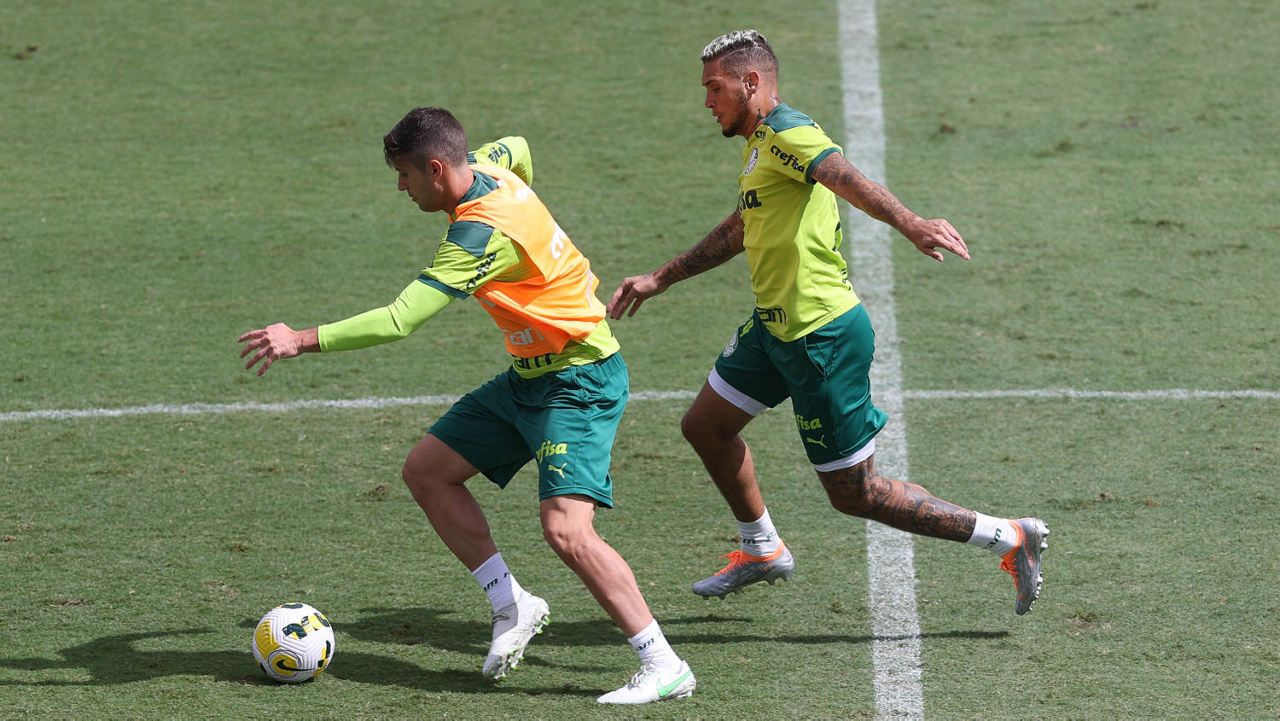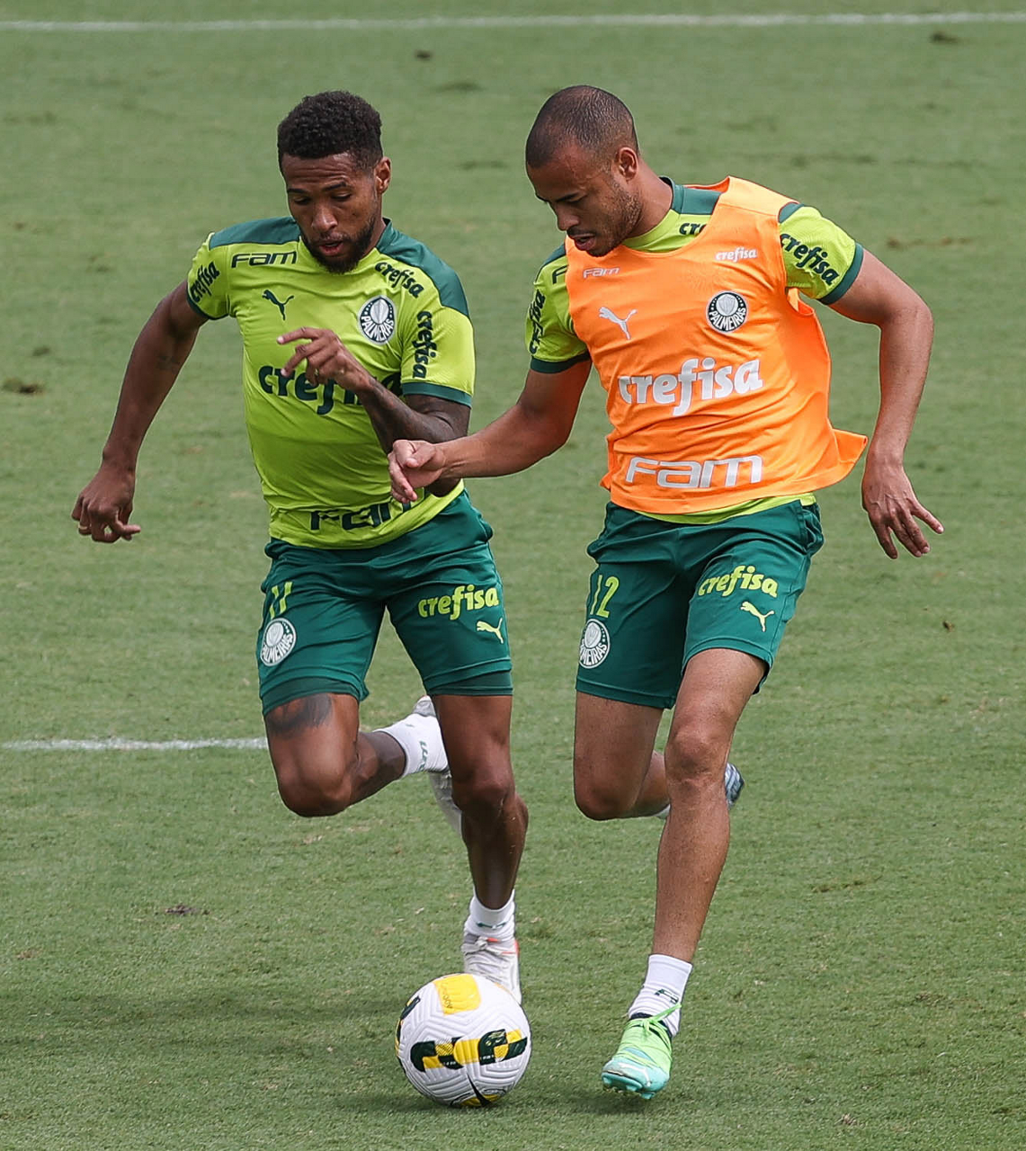 Os jogadores Lucas Freitas, Benjamín Kuscevic, Pedro Bicalho, Mateus, Jorge e Deyverson (E/D em pé) e Jailson, Weverton, Danilo, Mayke, Gabriel Menino, Breno Lopes, Gustavo Scarpa, Rony e Giovani (E/D agachados), da SE Palmeiras, durante treinamento, na Academia de Futebol. (Foto: Cesar Greco)