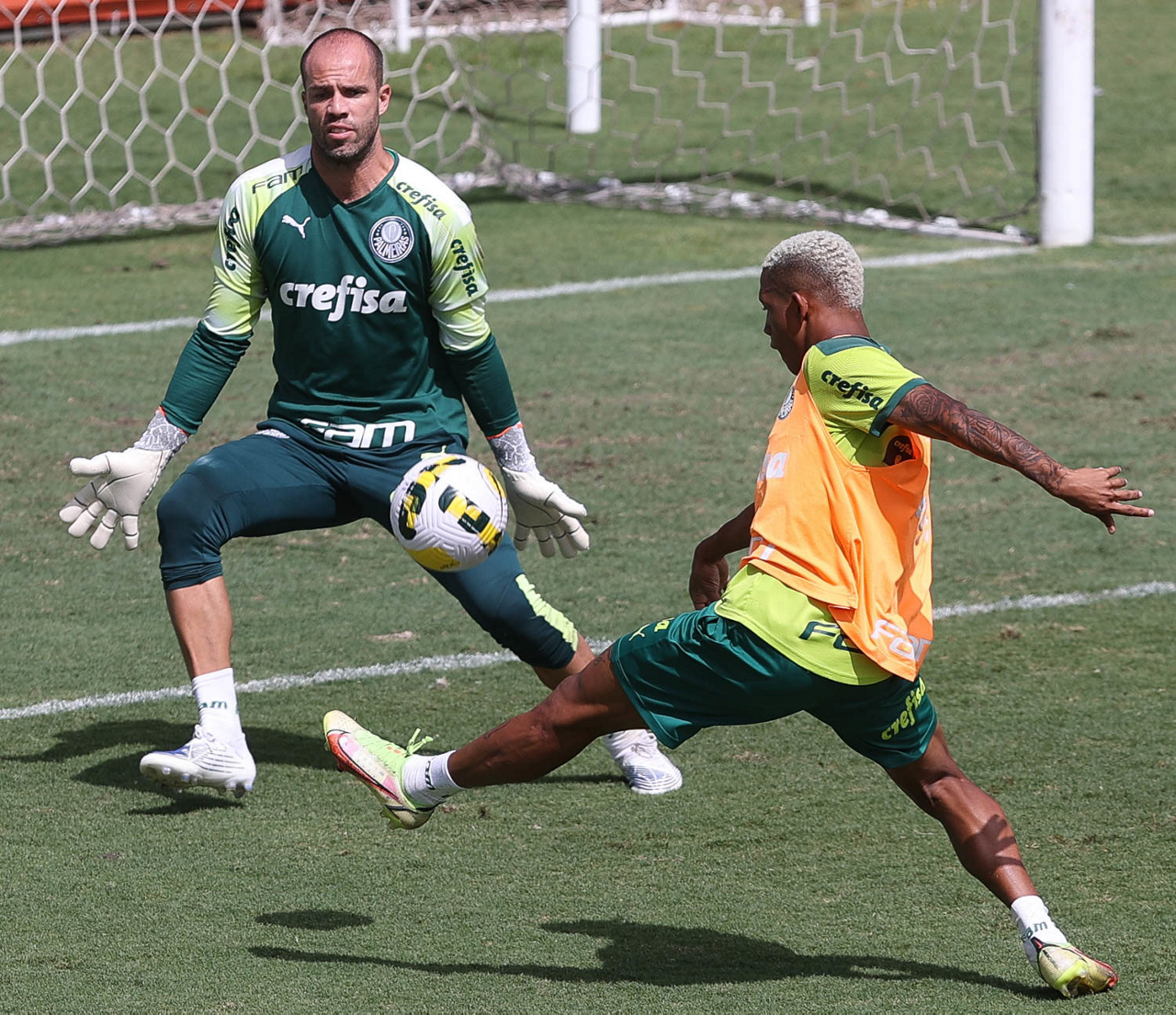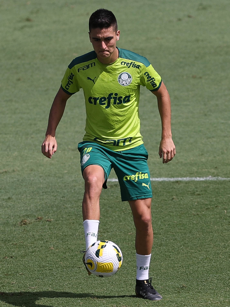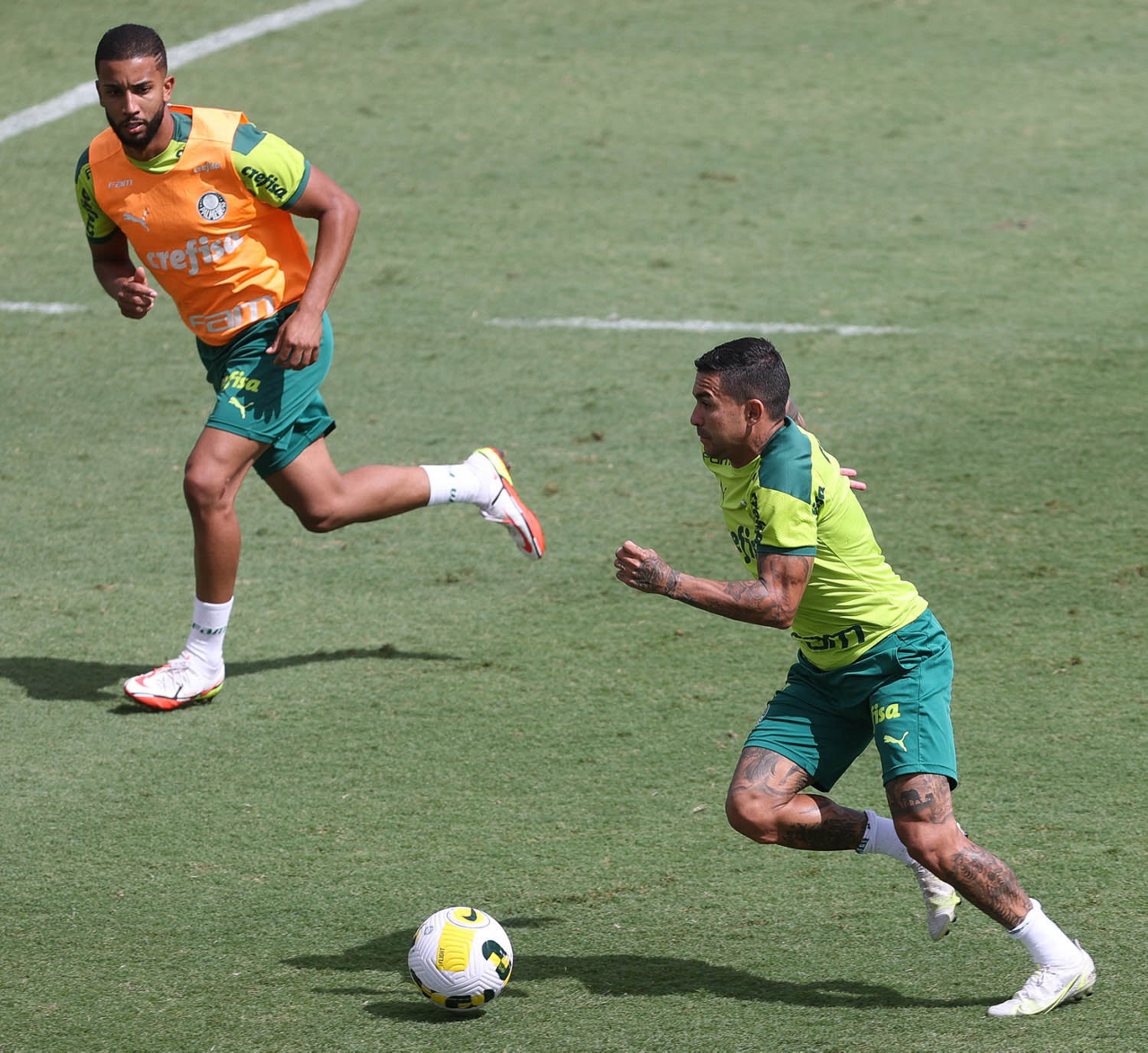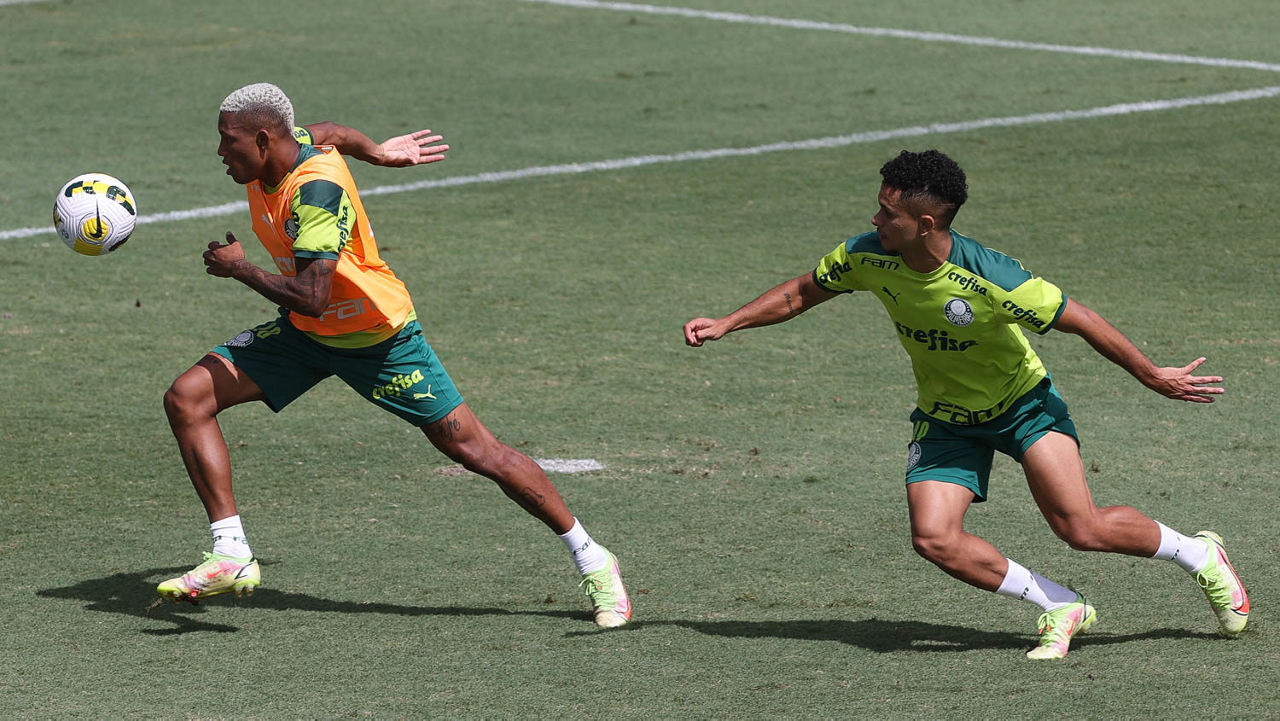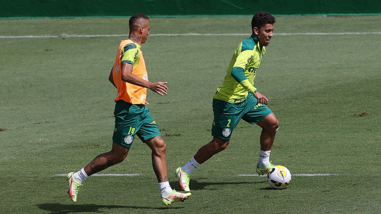 Os jogadores Lucas Freitas, Benjamín Kuscevic, Pedro Bicalho, Mateus, Jorge e Deyverson (E/D em pé) e Jailson, Weverton, Danilo, Mayke, Gabriel Menino, Breno Lopes, Gustavo Scarpa, Rony e Giovani (E/D agachados), da SE Palmeiras, durante treinamento, na Academia de Futebol. (Foto: Cesar Greco)