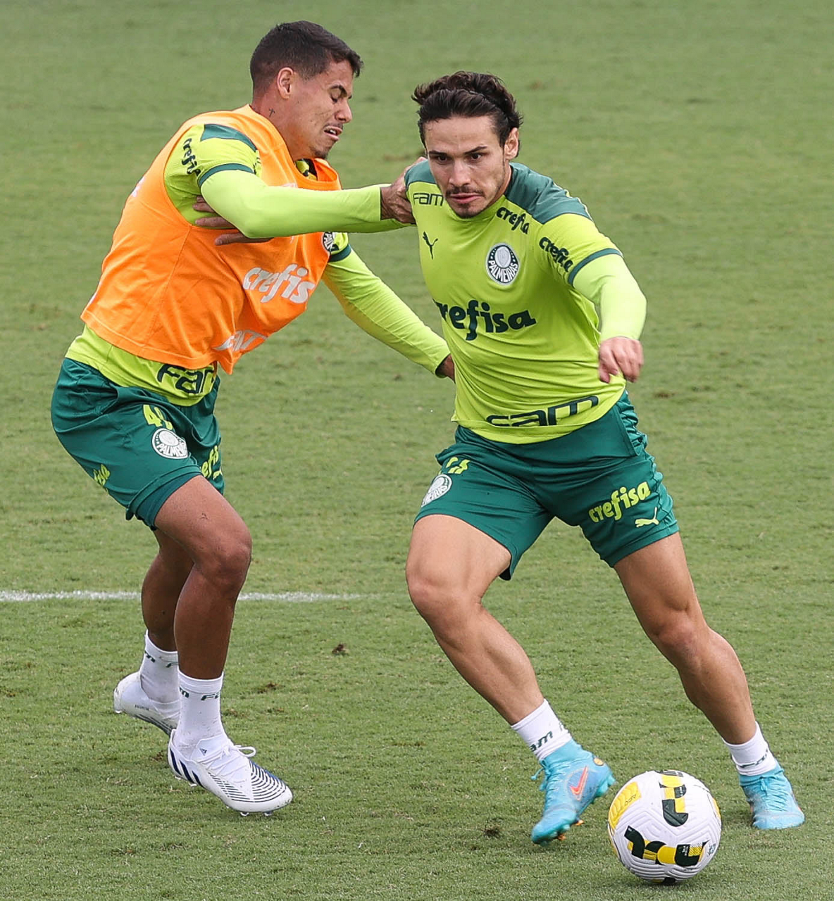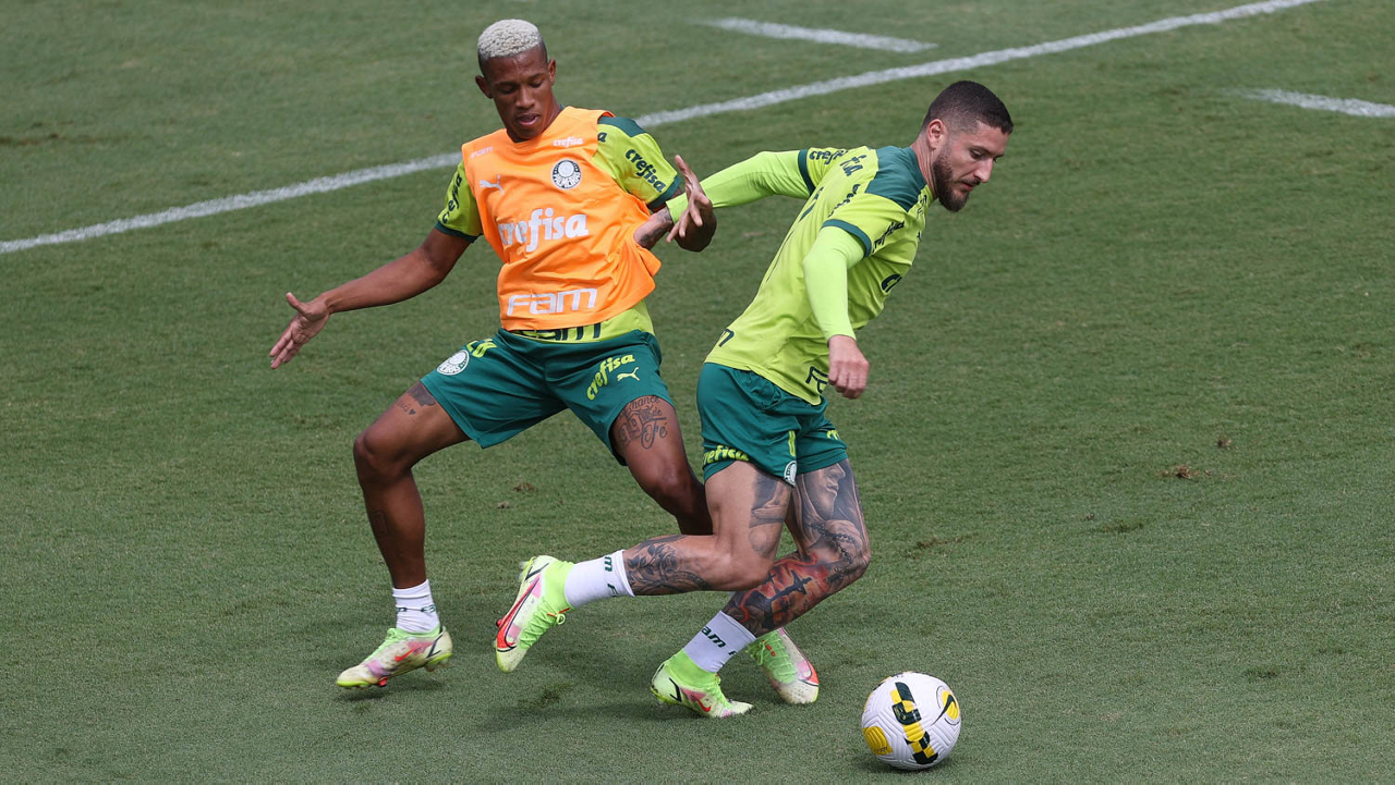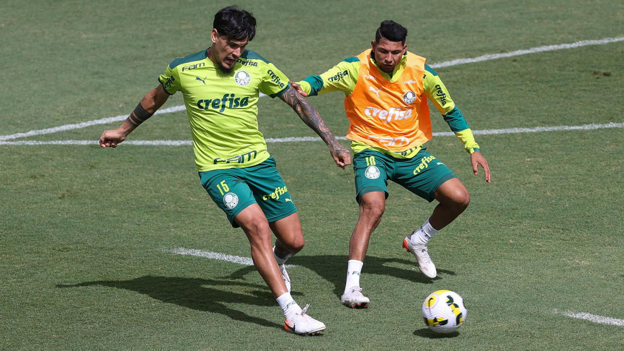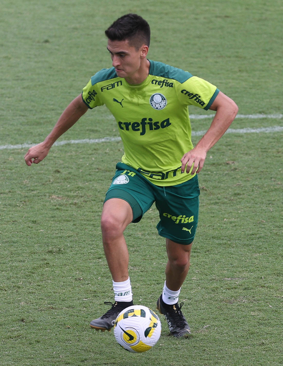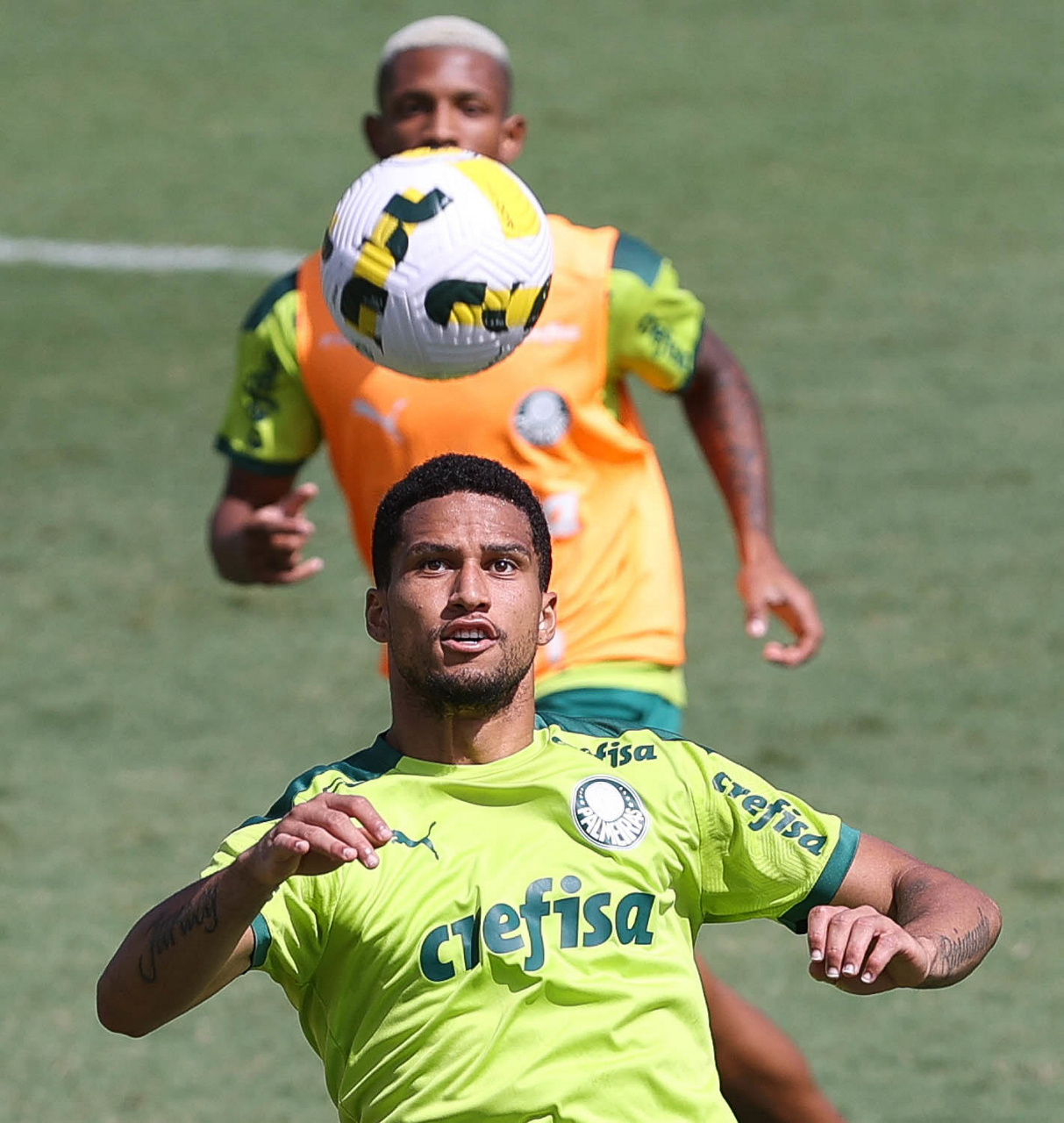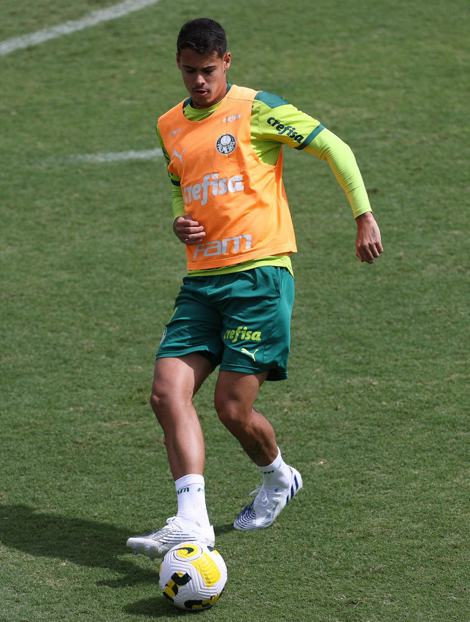 Os jogadores Lucas Freitas, Benjamín Kuscevic, Pedro Bicalho, Mateus, Jorge e Deyverson (E/D em pé) e Jailson, Weverton, Danilo, Mayke, Gabriel Menino, Breno Lopes, Gustavo Scarpa, Rony e Giovani (E/D agachados), da SE Palmeiras, durante treinamento, na Academia de Futebol. (Foto: Cesar Greco)