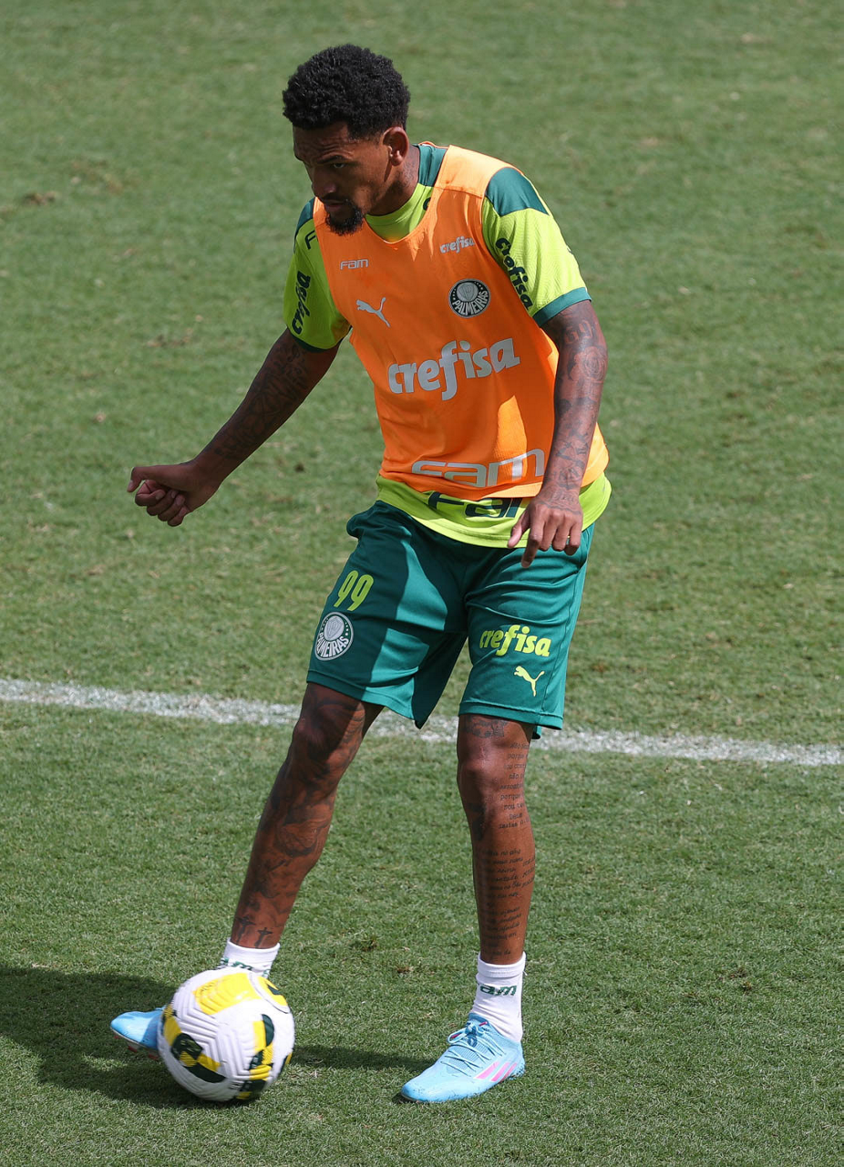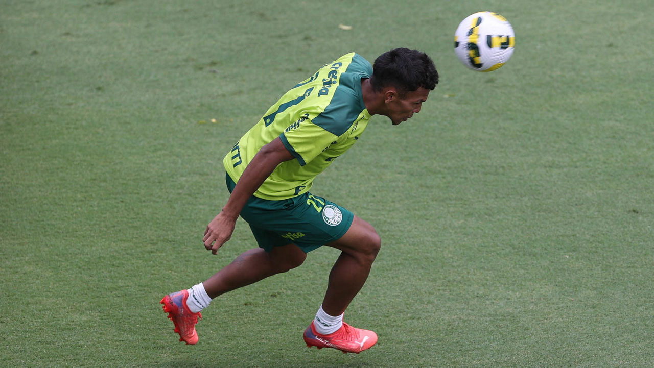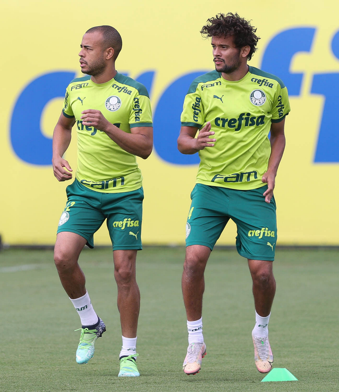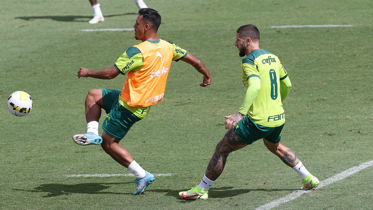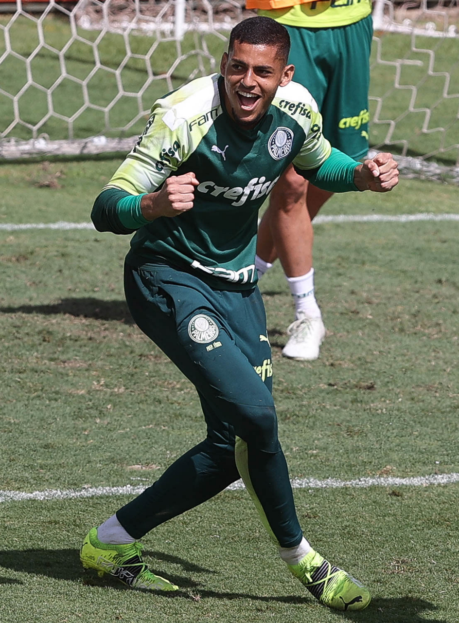 Os jogadores Lucas Freitas, Benjamín Kuscevic, Pedro Bicalho, Mateus, Jorge e Deyverson (E/D em pé) e Jailson, Weverton, Danilo, Mayke, Gabriel Menino, Breno Lopes, Gustavo Scarpa, Rony e Giovani (E/D agachados), da SE Palmeiras, durante treinamento, na Academia de Futebol. (Foto: Cesar Greco)