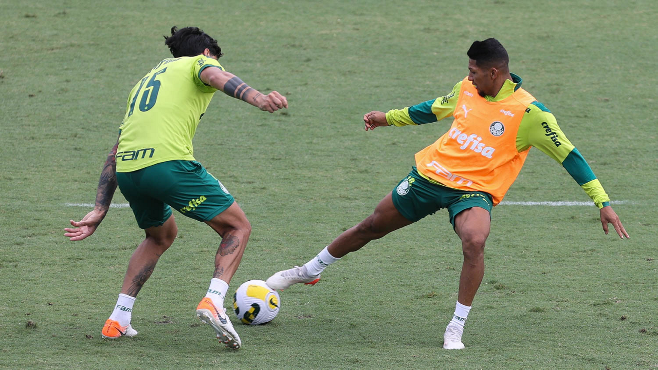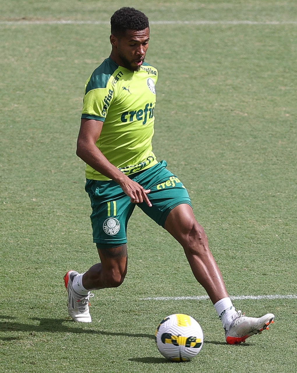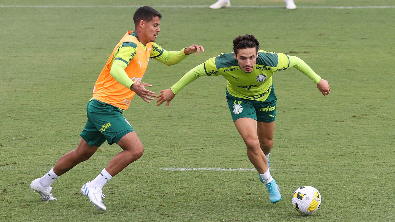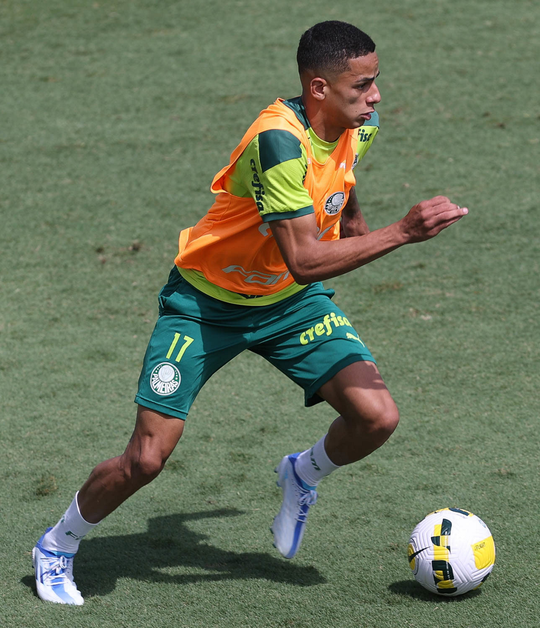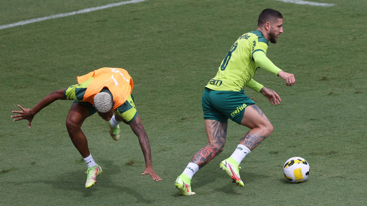 Os jogadores Lucas Freitas, Benjamín Kuscevic, Pedro Bicalho, Mateus, Jorge e Deyverson (E/D em pé) e Jailson, Weverton, Danilo, Mayke, Gabriel Menino, Breno Lopes, Gustavo Scarpa, Rony e Giovani (E/D agachados), da SE Palmeiras, durante treinamento, na Academia de Futebol. (Foto: Cesar Greco)