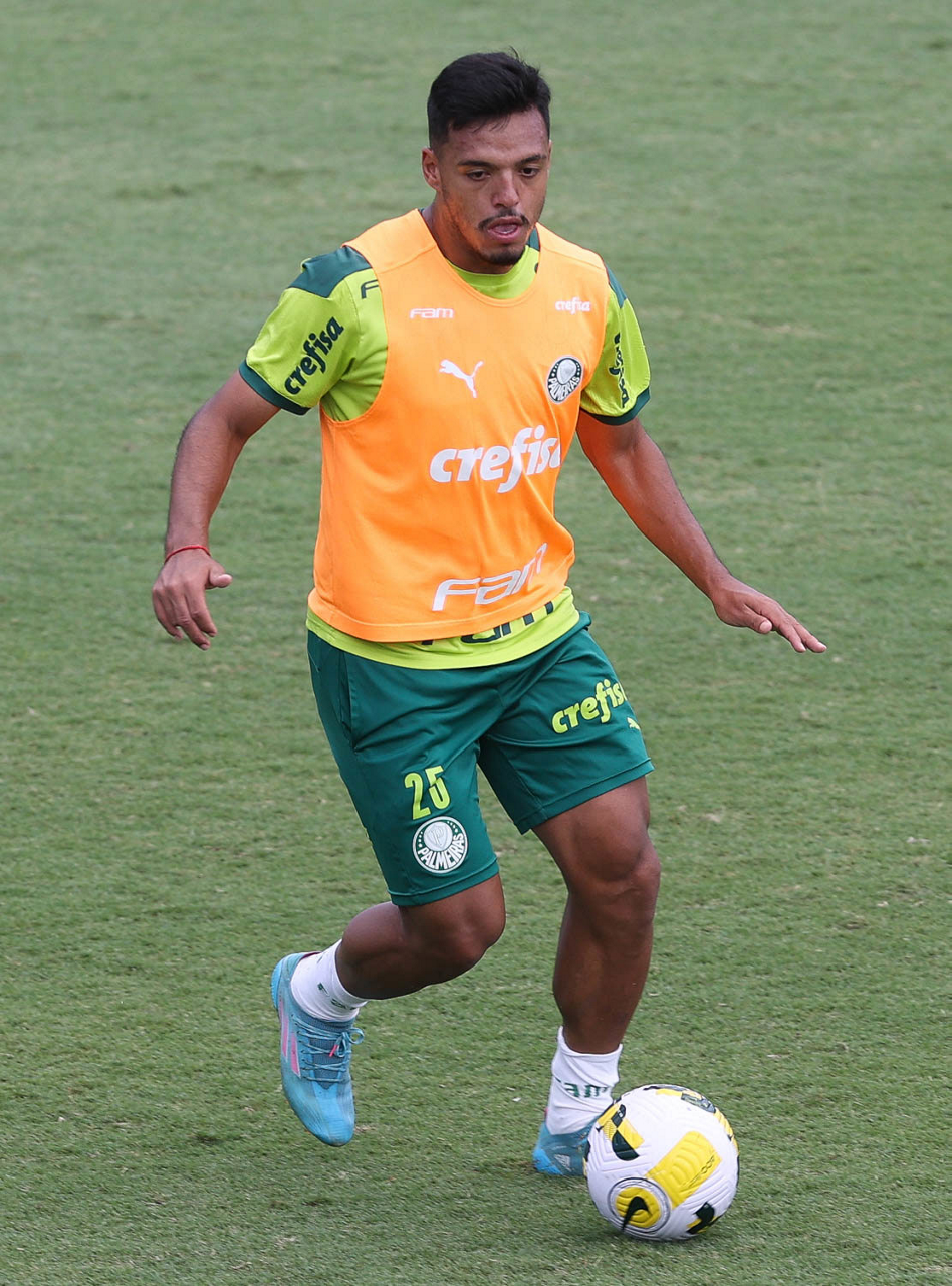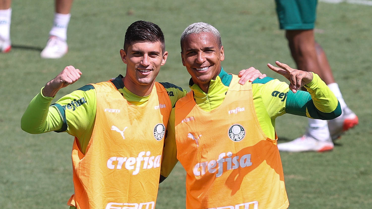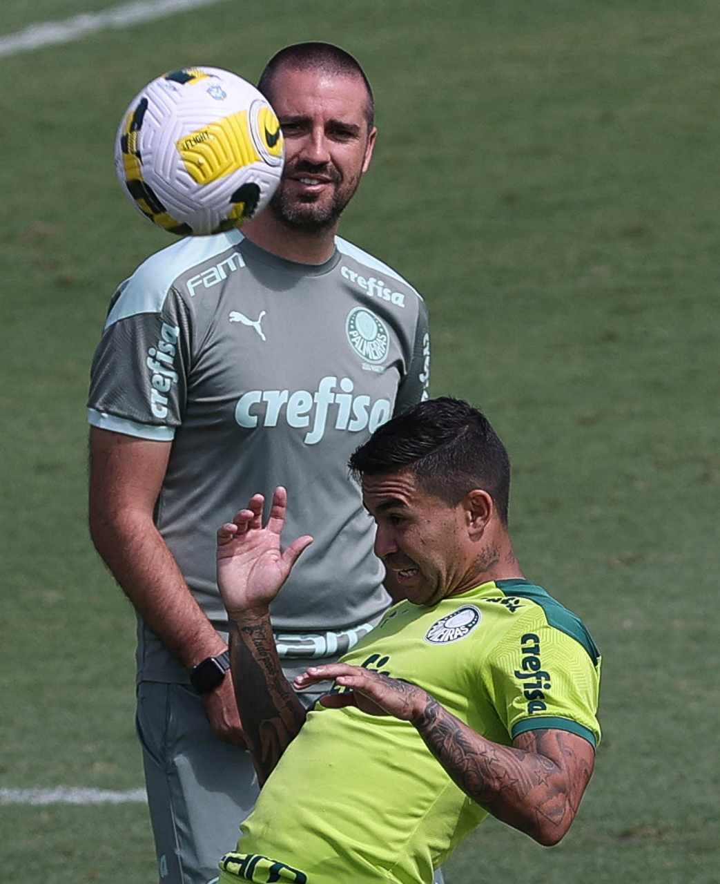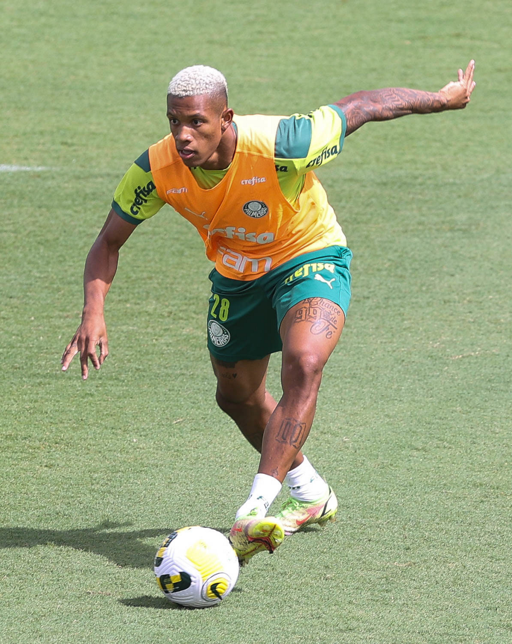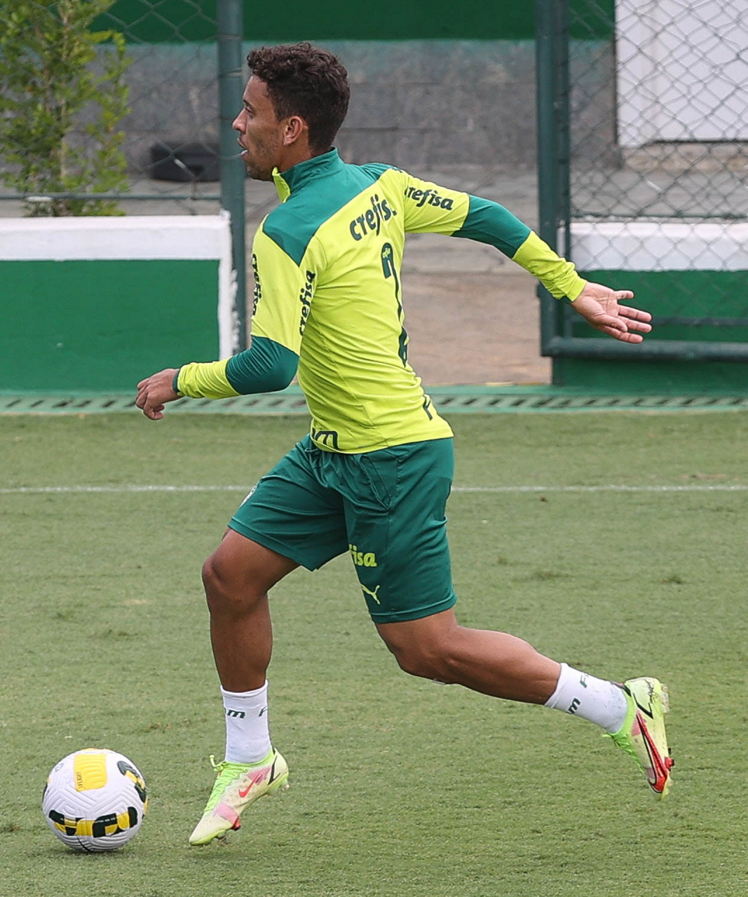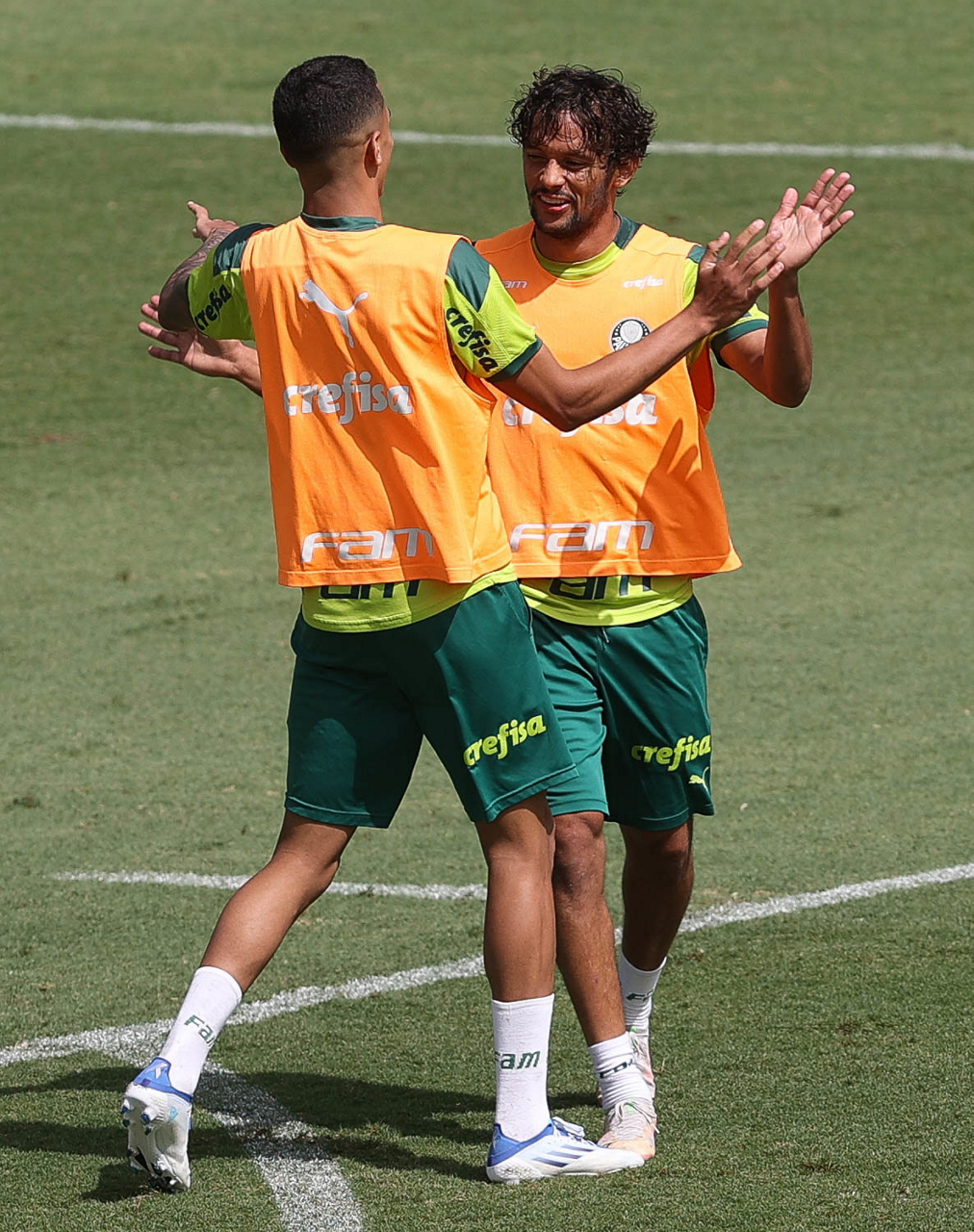 Os jogadores Lucas Freitas, Benjamín Kuscevic, Pedro Bicalho, Mateus, Jorge e Deyverson (E/D em pé) e Jailson, Weverton, Danilo, Mayke, Gabriel Menino, Breno Lopes, Gustavo Scarpa, Rony e Giovani (E/D agachados), da SE Palmeiras, durante treinamento, na Academia de Futebol. (Foto: Cesar Greco)