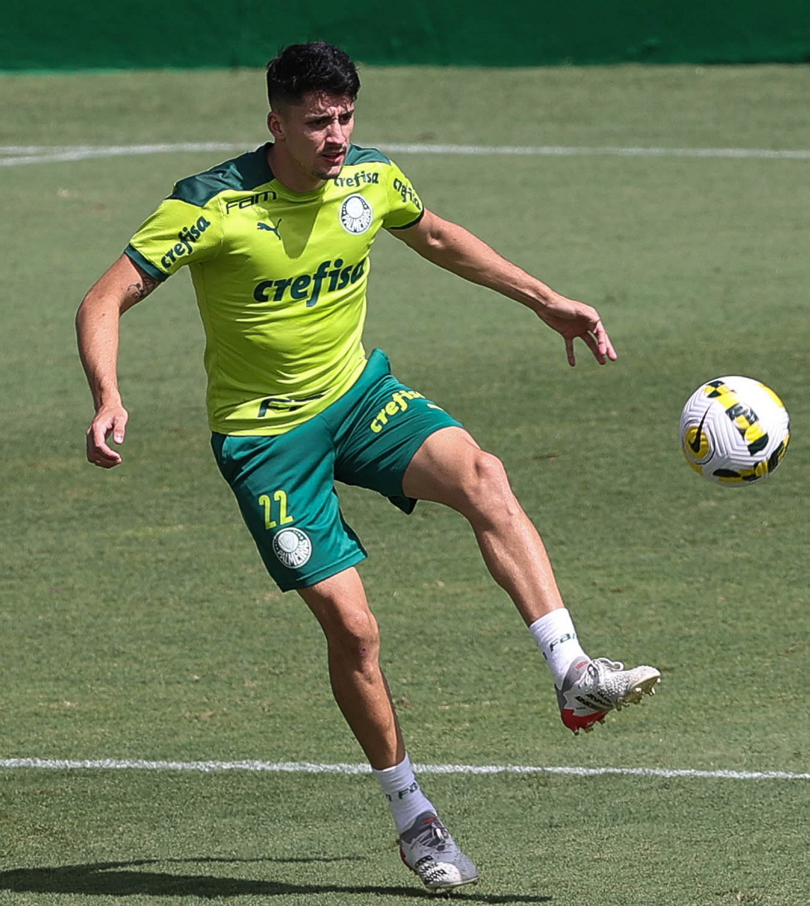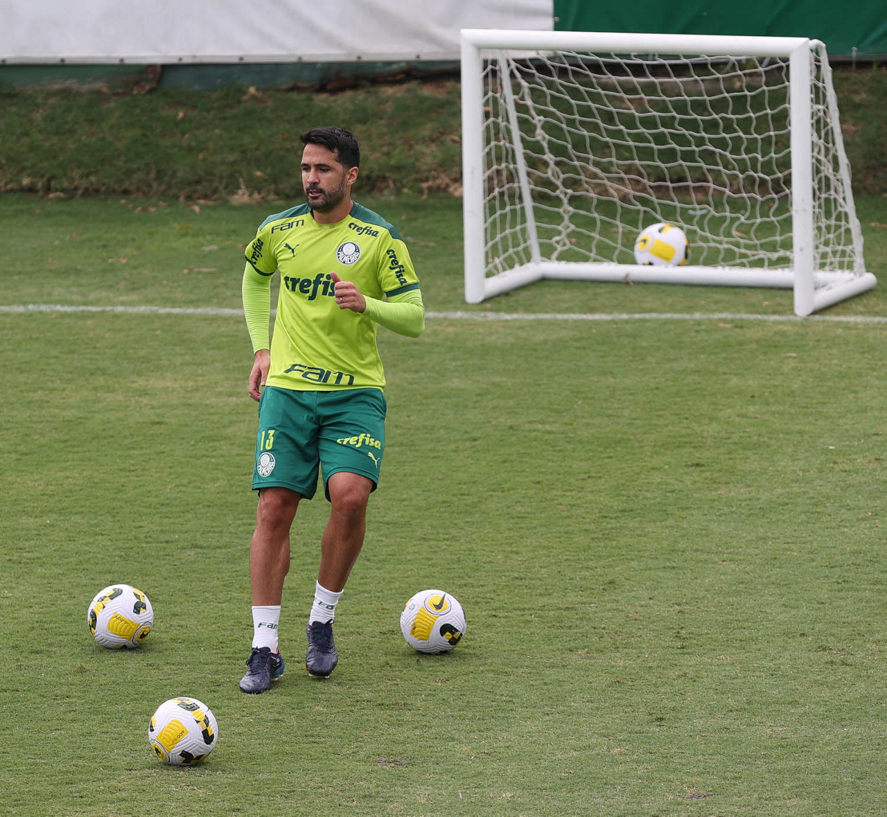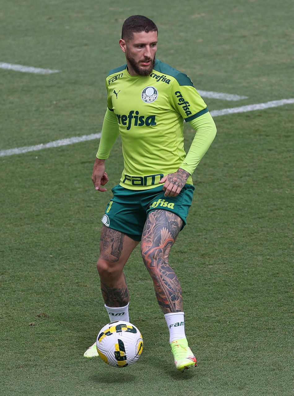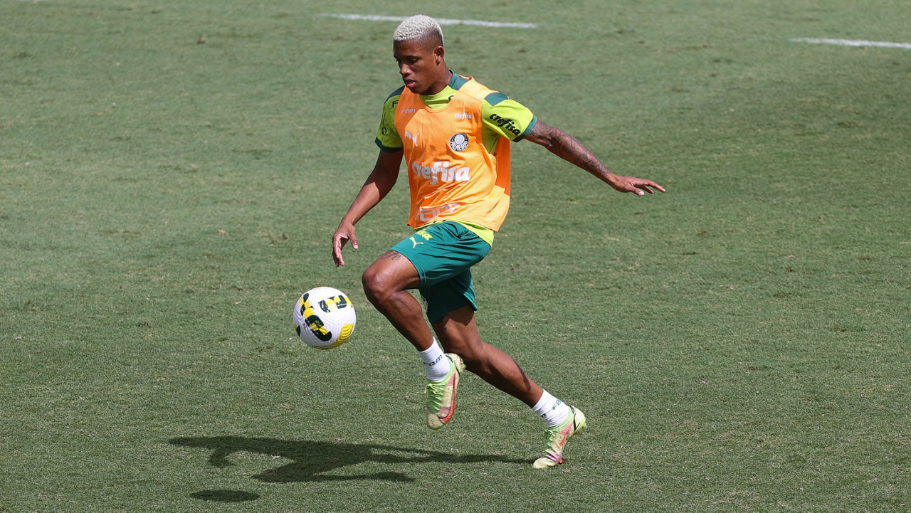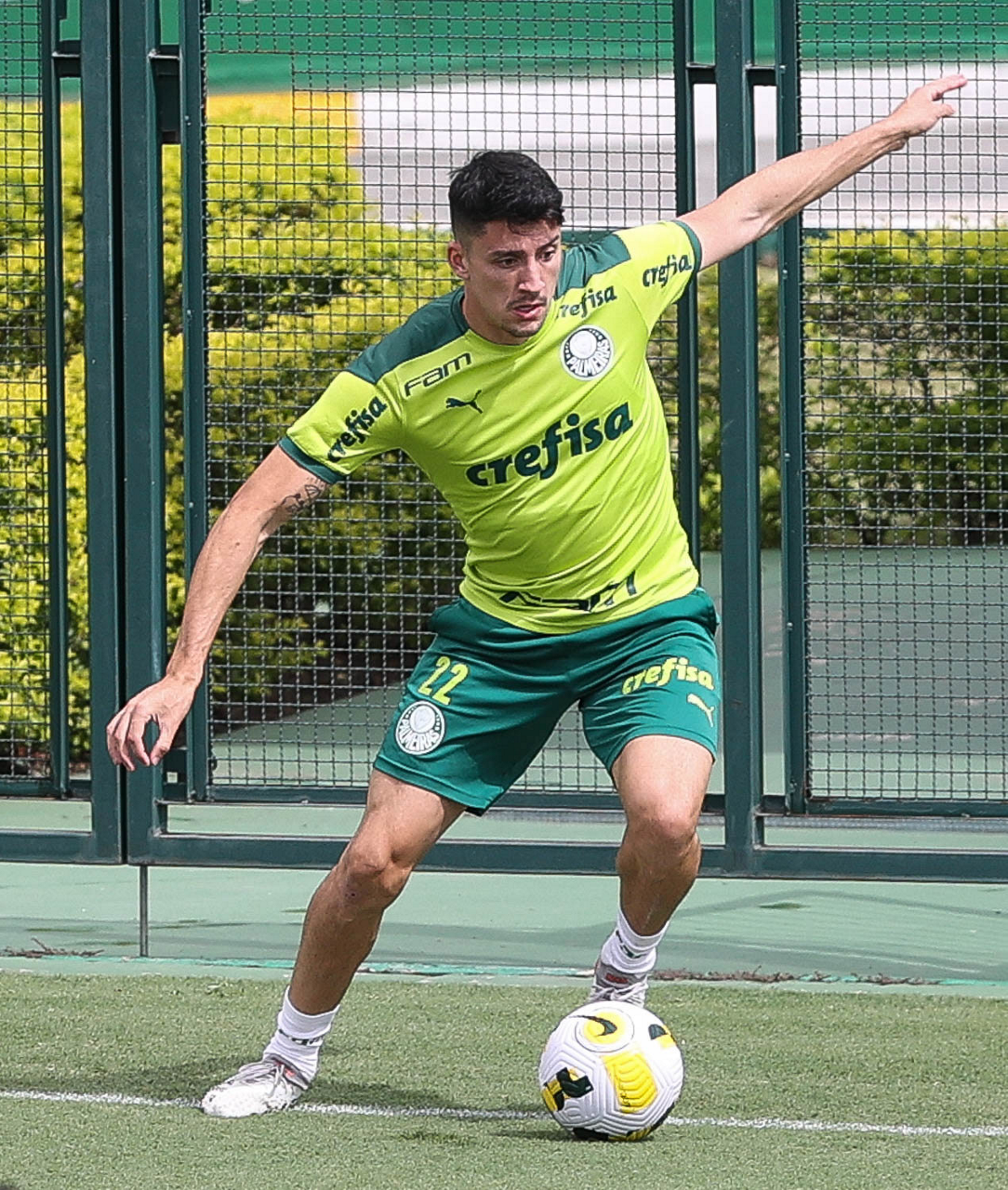 Os jogadores Lucas Freitas, Benjamín Kuscevic, Pedro Bicalho, Mateus, Jorge e Deyverson (E/D em pé) e Jailson, Weverton, Danilo, Mayke, Gabriel Menino, Breno Lopes, Gustavo Scarpa, Rony e Giovani (E/D agachados), da SE Palmeiras, durante treinamento, na Academia de Futebol. (Foto: Cesar Greco)