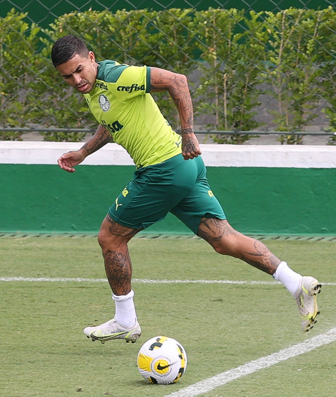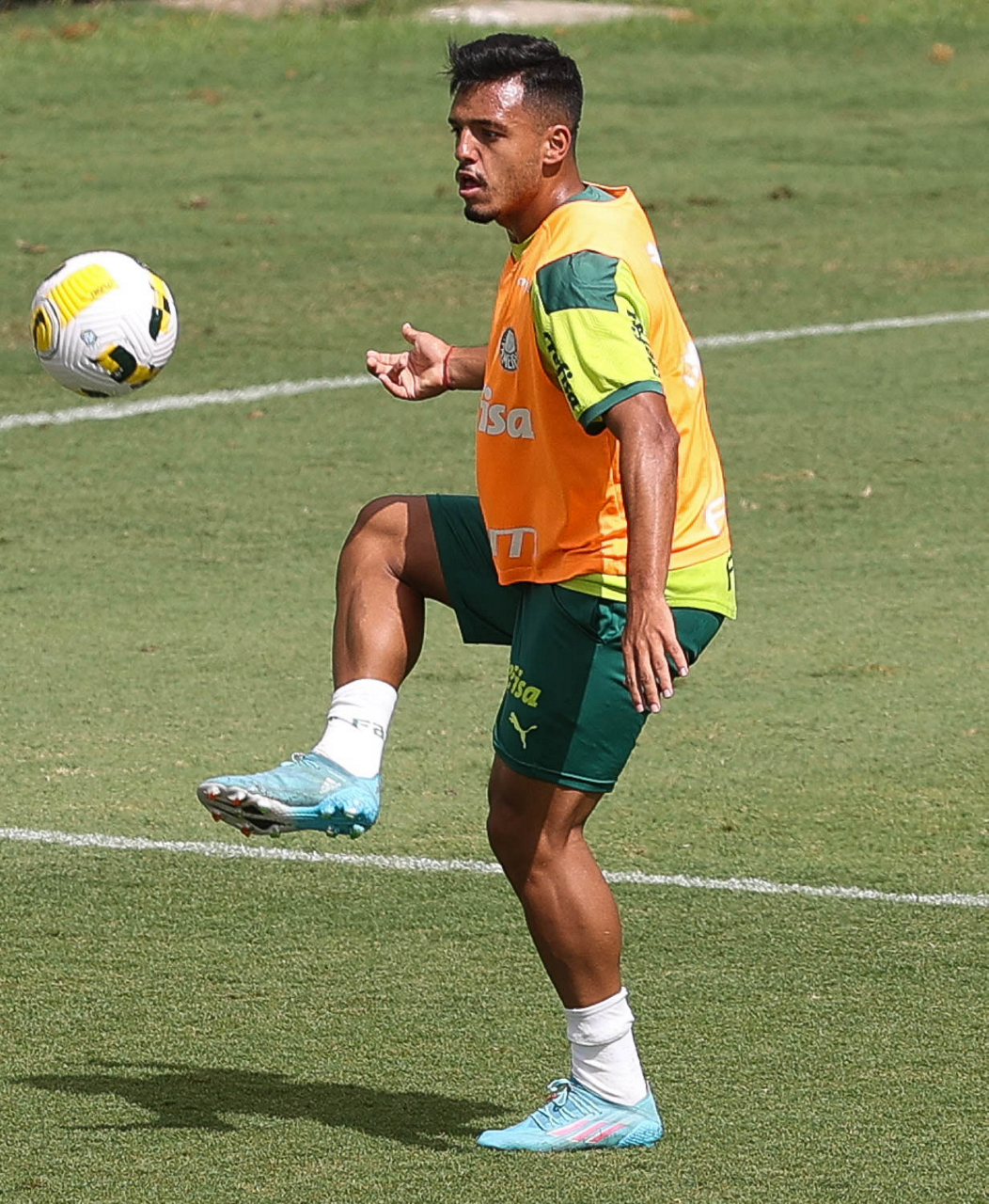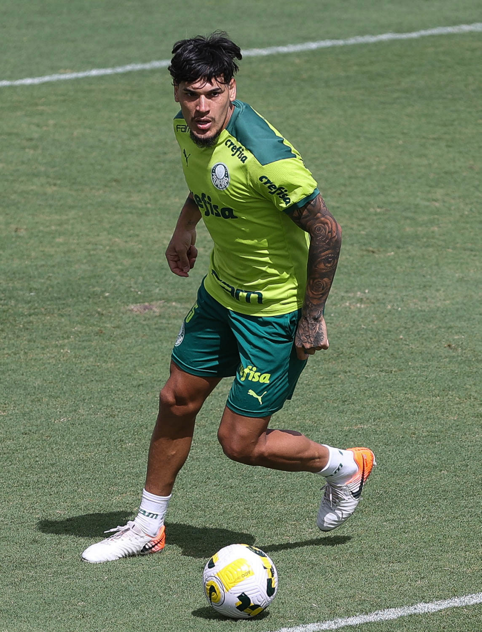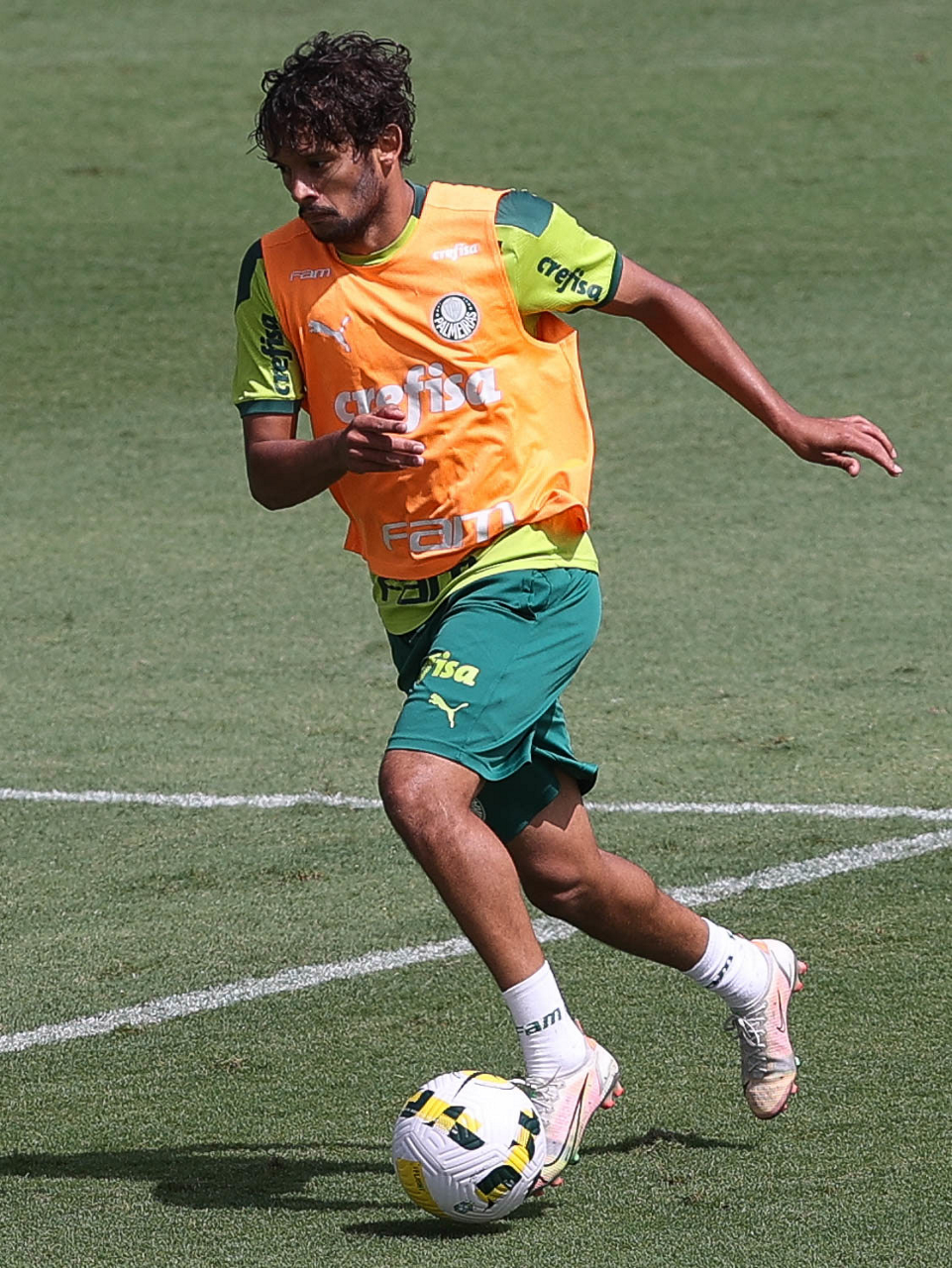 Os jogadores Lucas Freitas, Benjamín Kuscevic, Pedro Bicalho, Mateus, Jorge e Deyverson (E/D em pé) e Jailson, Weverton, Danilo, Mayke, Gabriel Menino, Breno Lopes, Gustavo Scarpa, Rony e Giovani (E/D agachados), da SE Palmeiras, durante treinamento, na Academia de Futebol. (Foto: Cesar Greco)