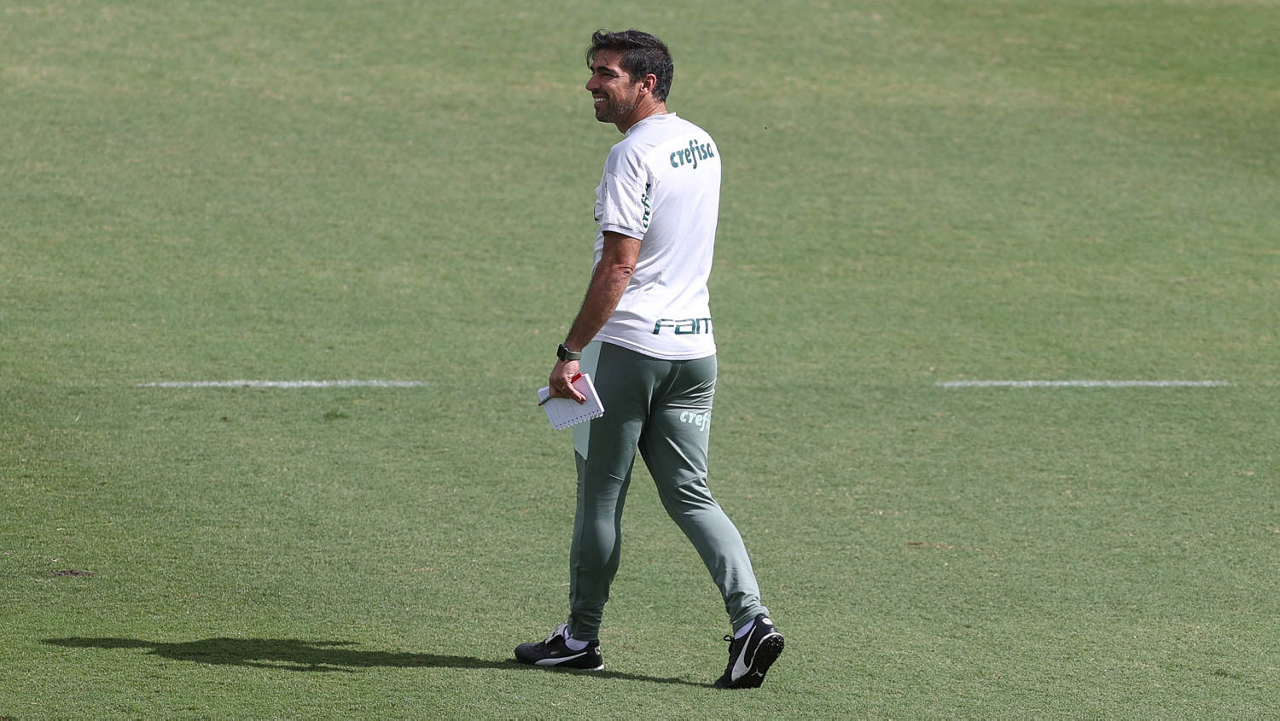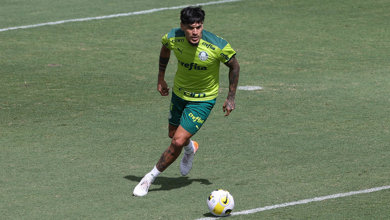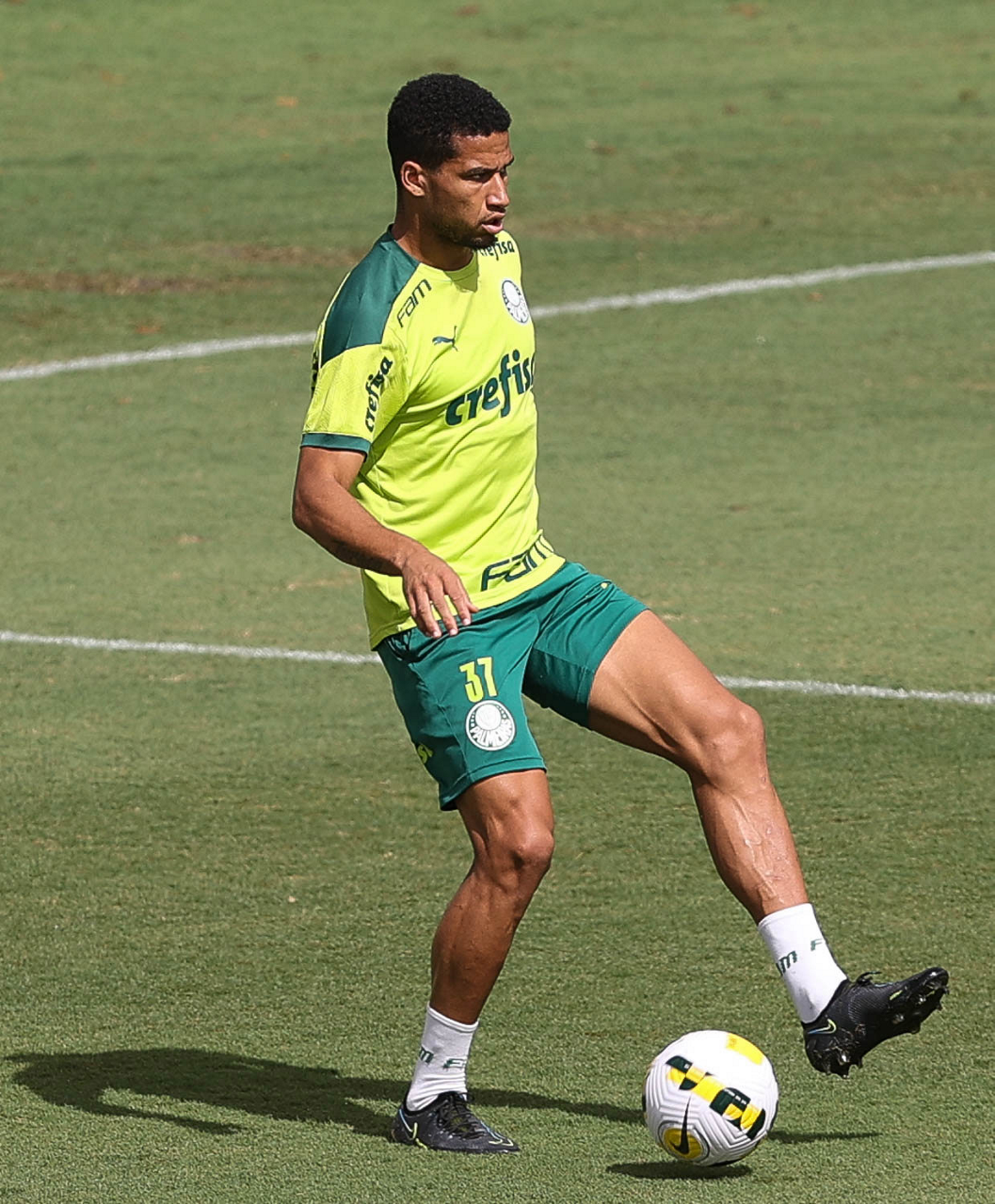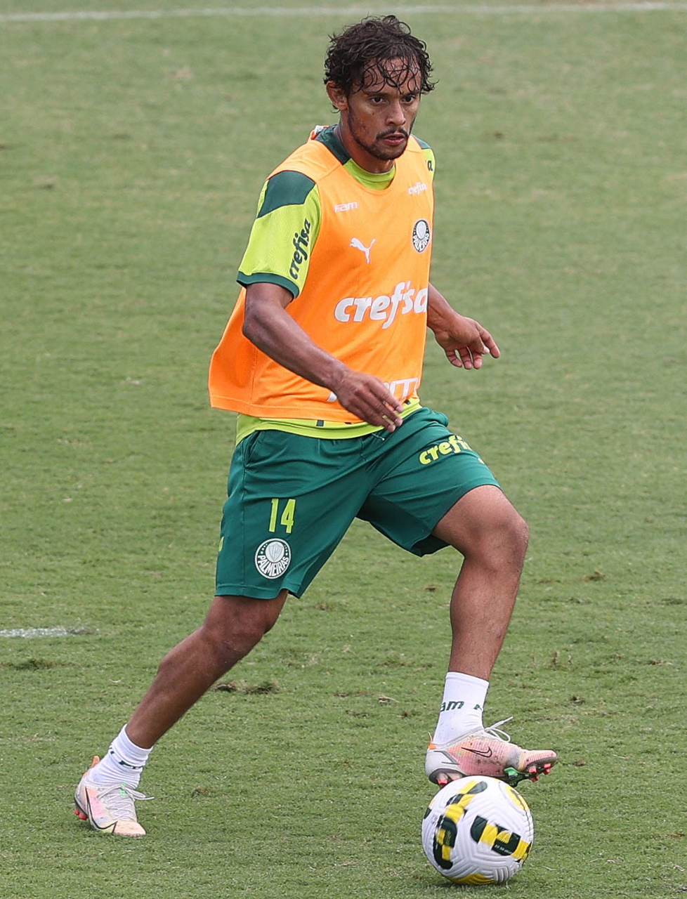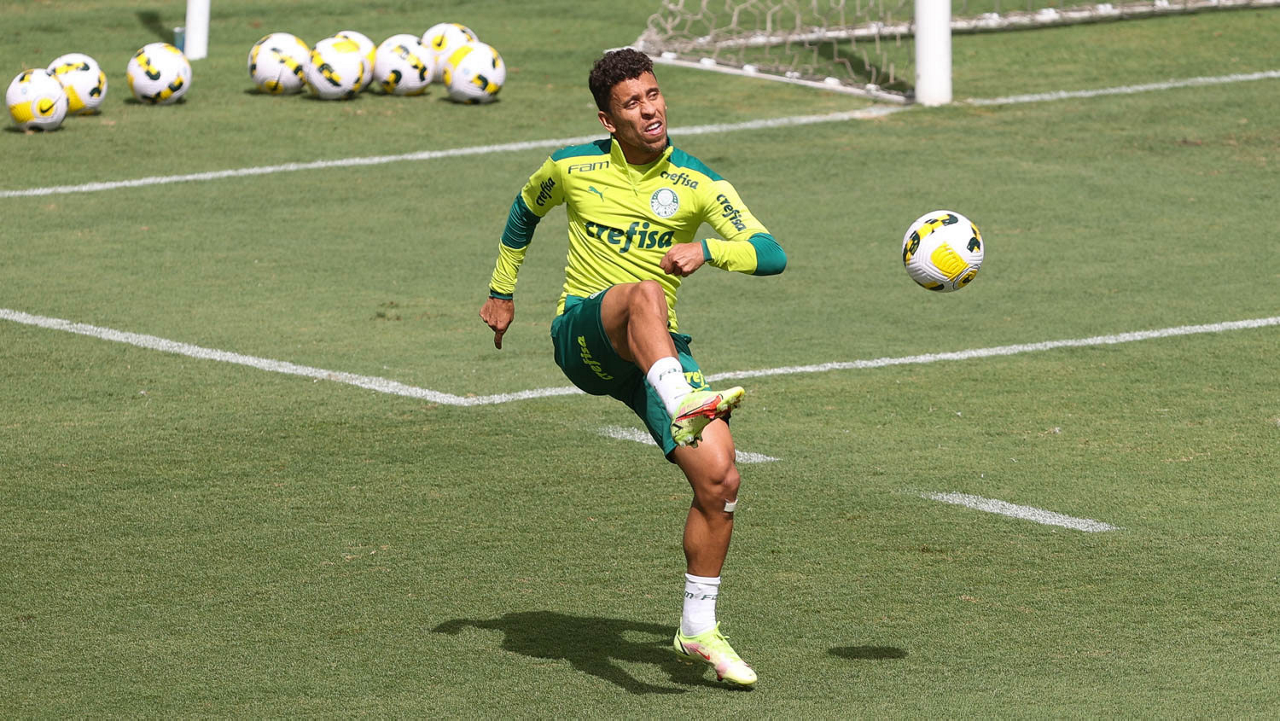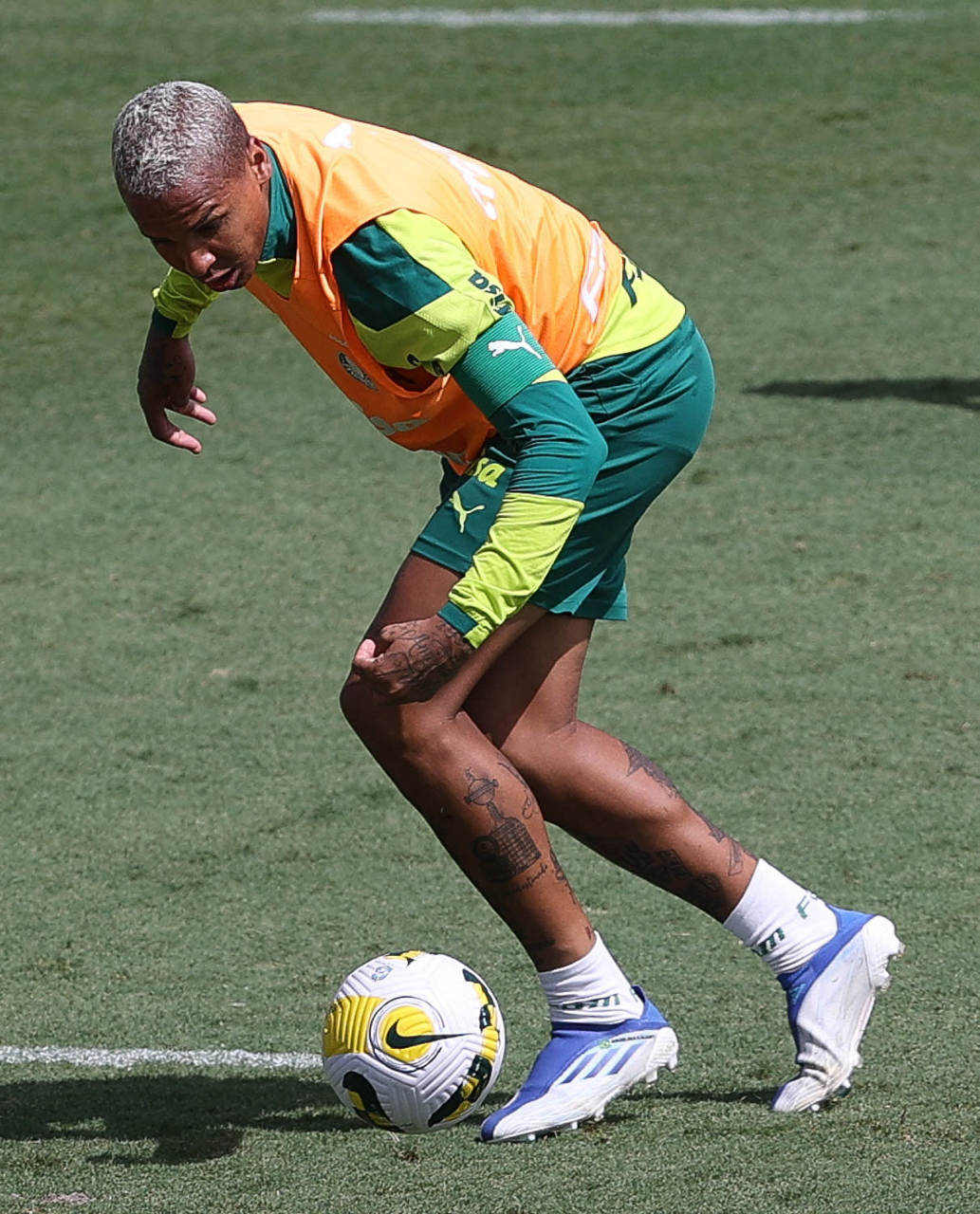 Os jogadores Lucas Freitas, Benjamín Kuscevic, Pedro Bicalho, Mateus, Jorge e Deyverson (E/D em pé) e Jailson, Weverton, Danilo, Mayke, Gabriel Menino, Breno Lopes, Gustavo Scarpa, Rony e Giovani (E/D agachados), da SE Palmeiras, durante treinamento, na Academia de Futebol. (Foto: Cesar Greco)