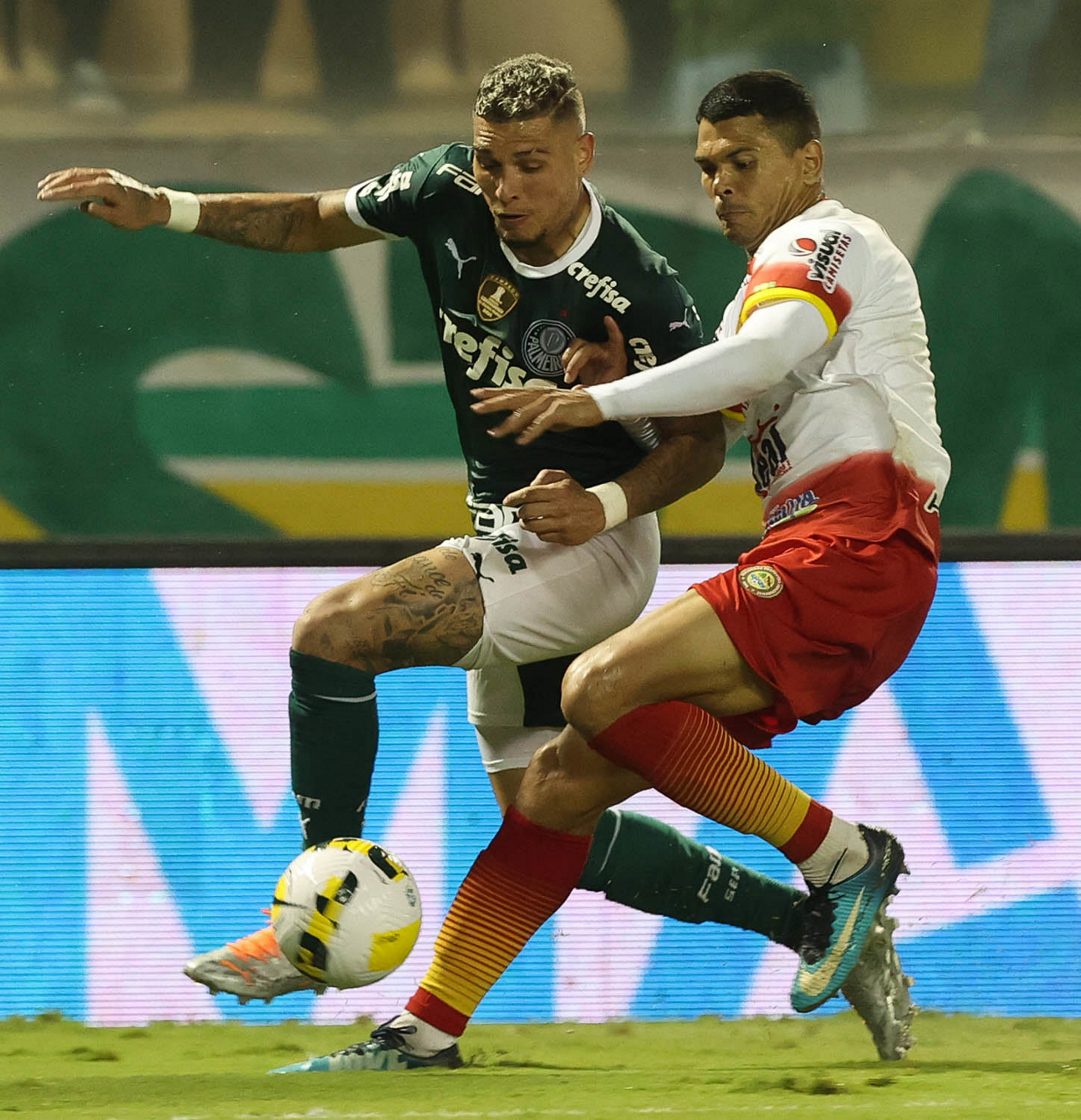 O jogador Eduard Atuesta, da SE Palmeiras, disputa bola com o jogador Nildo, da SD Juazeirense, durante partida válida pela fase um dezesseis avos, da Copa do Brasil, na Arena Barueri. (Foto: Cesar Greco)