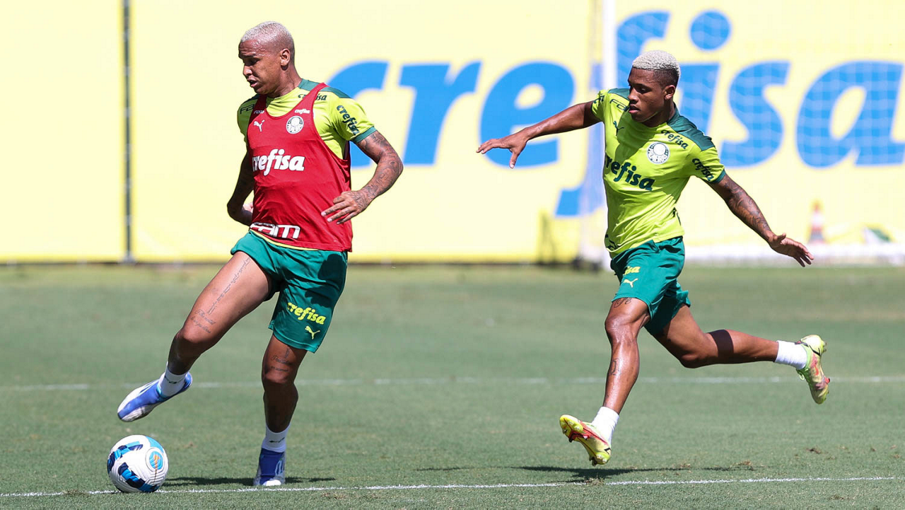 Os jogadores Deyverson e Danilo (D), da SE Palmeiras, durante treinamento, na Academia de Futebol. (Foto: Cesar Greco)