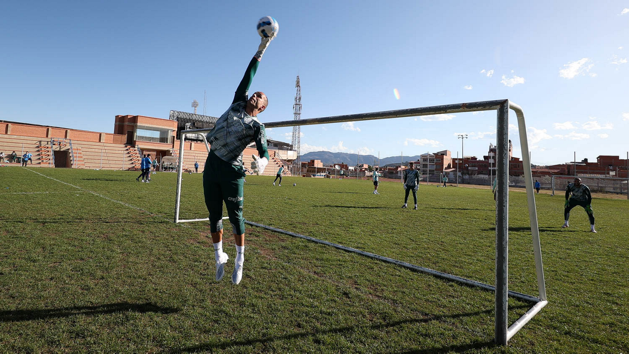 O goleiro Weverton, da SE Palmeiras, durante treinamento, no campo anexo ao Estádio Olímpico Pátria, em Sucre. (Foto: Cesar Greco)